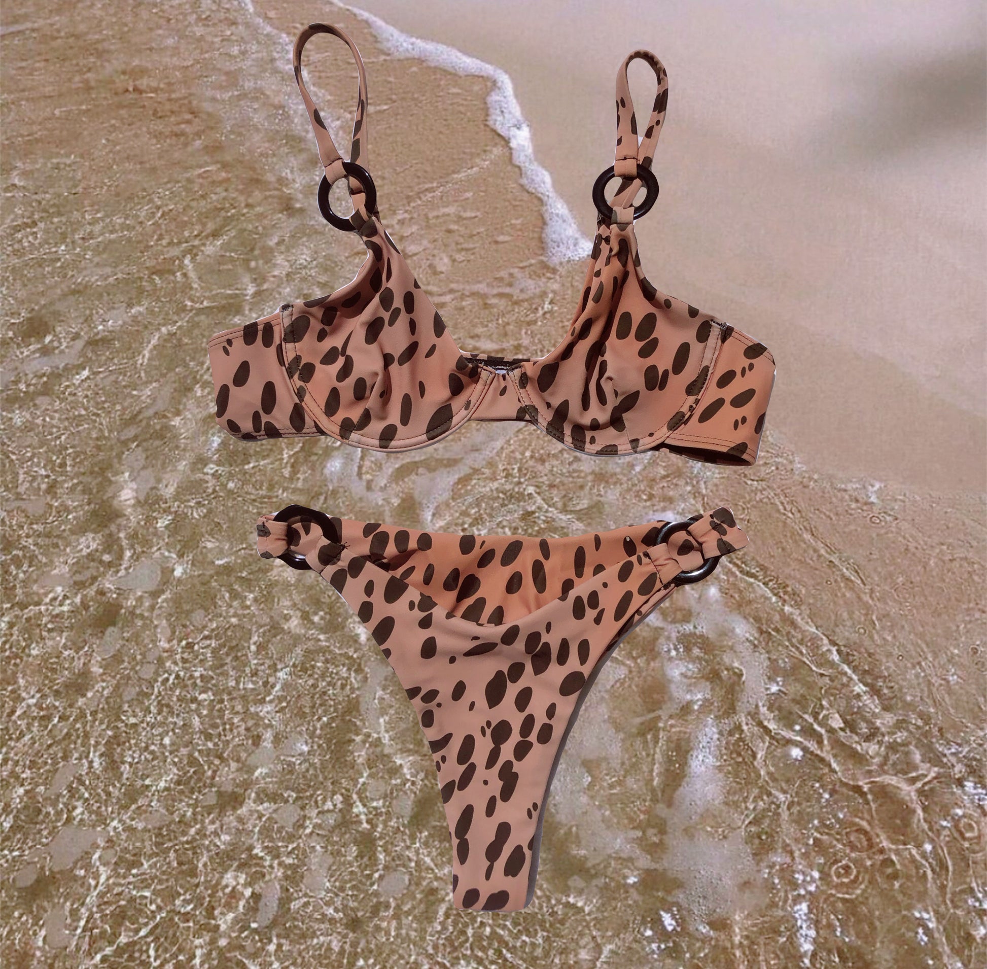 high waist cheeky bottoms and underwire top. Straps are adjustable.