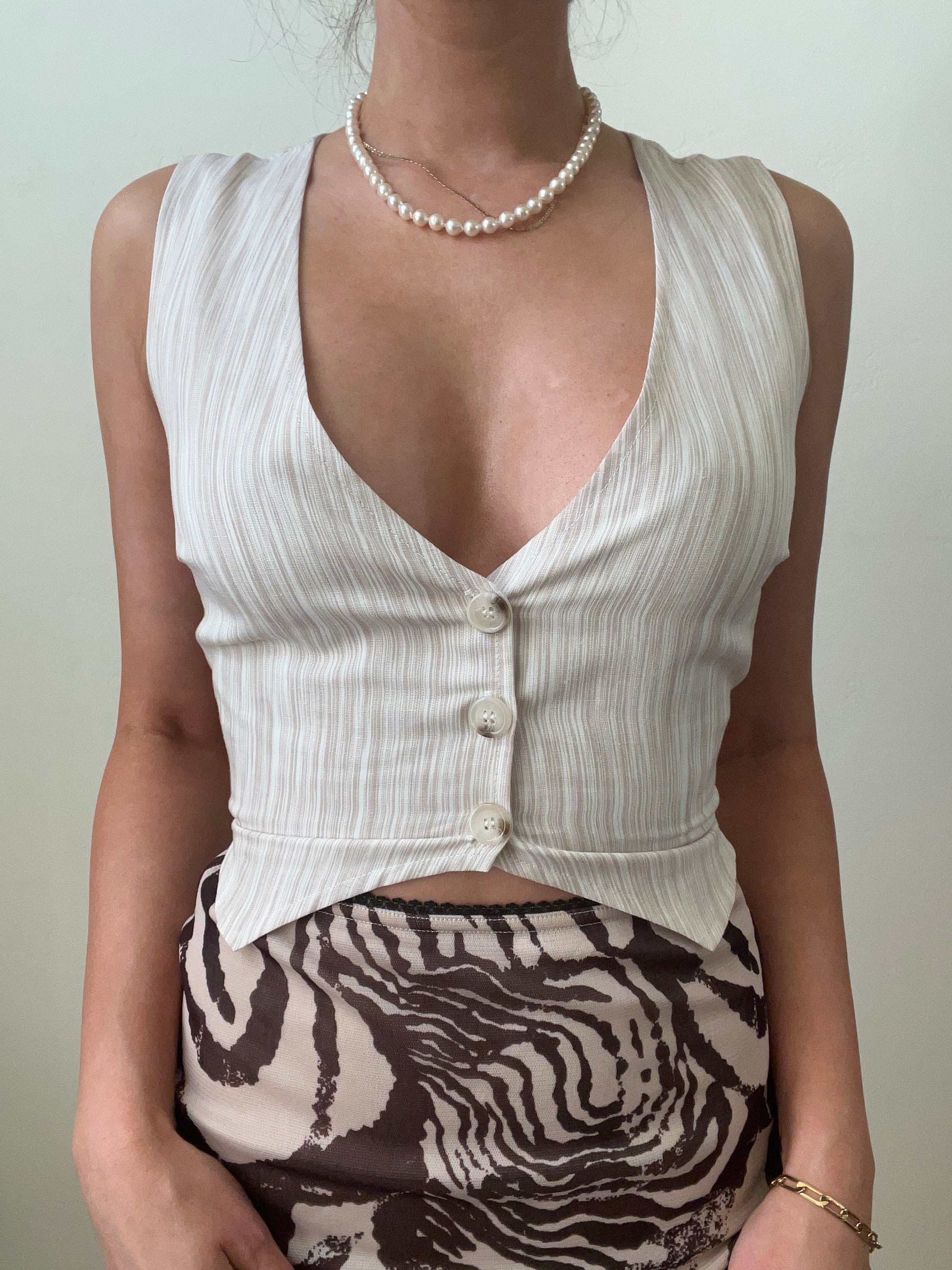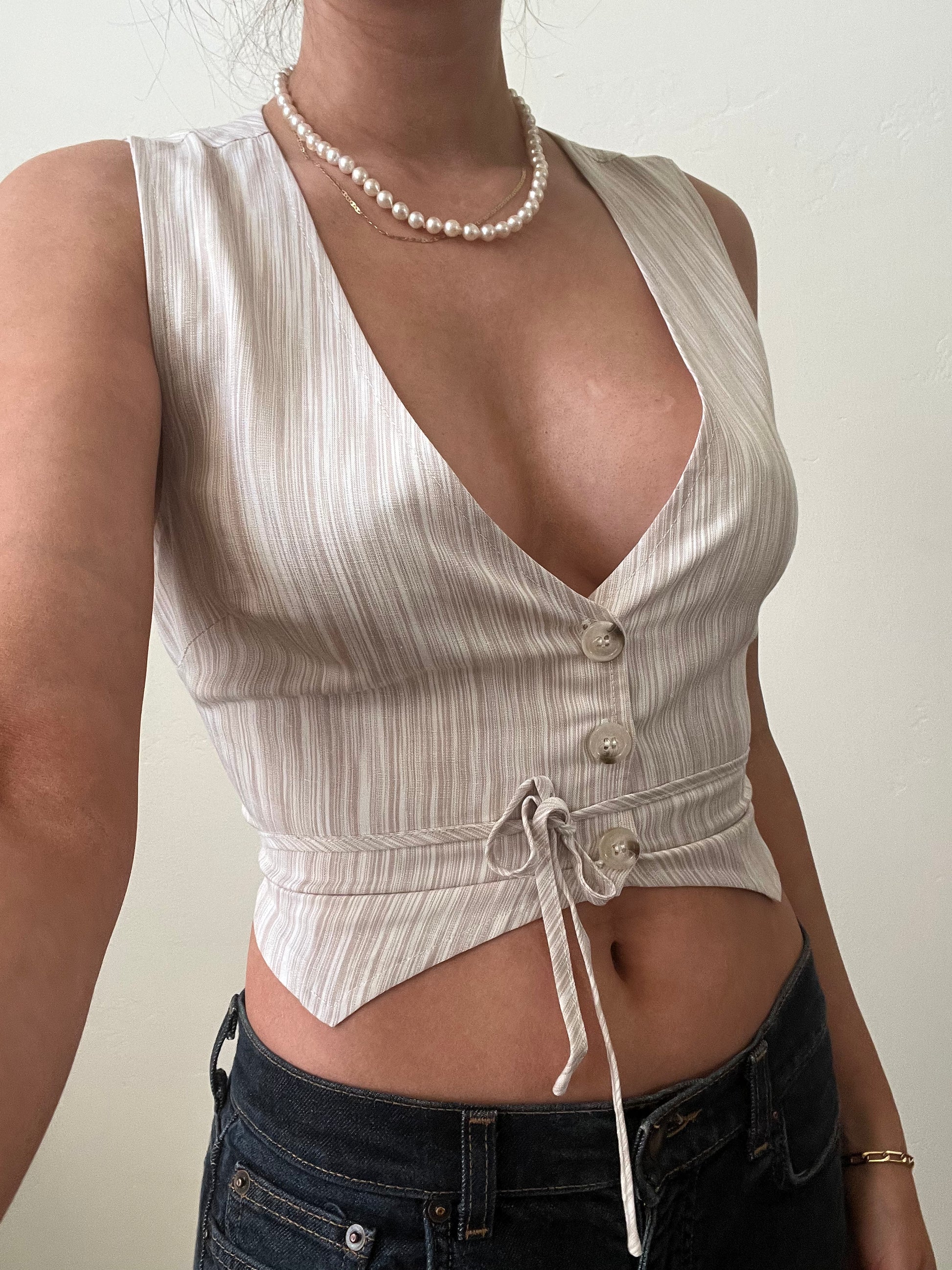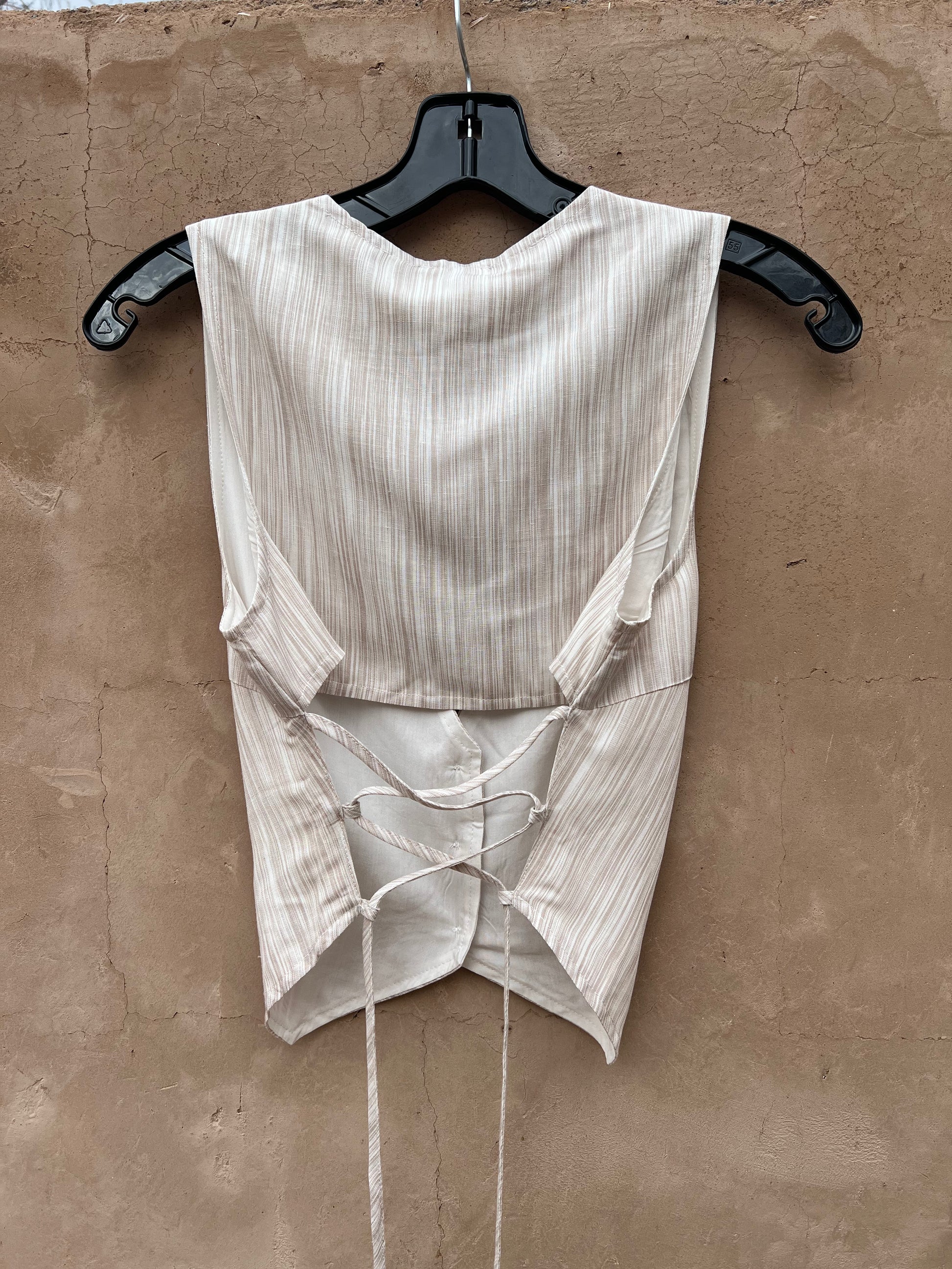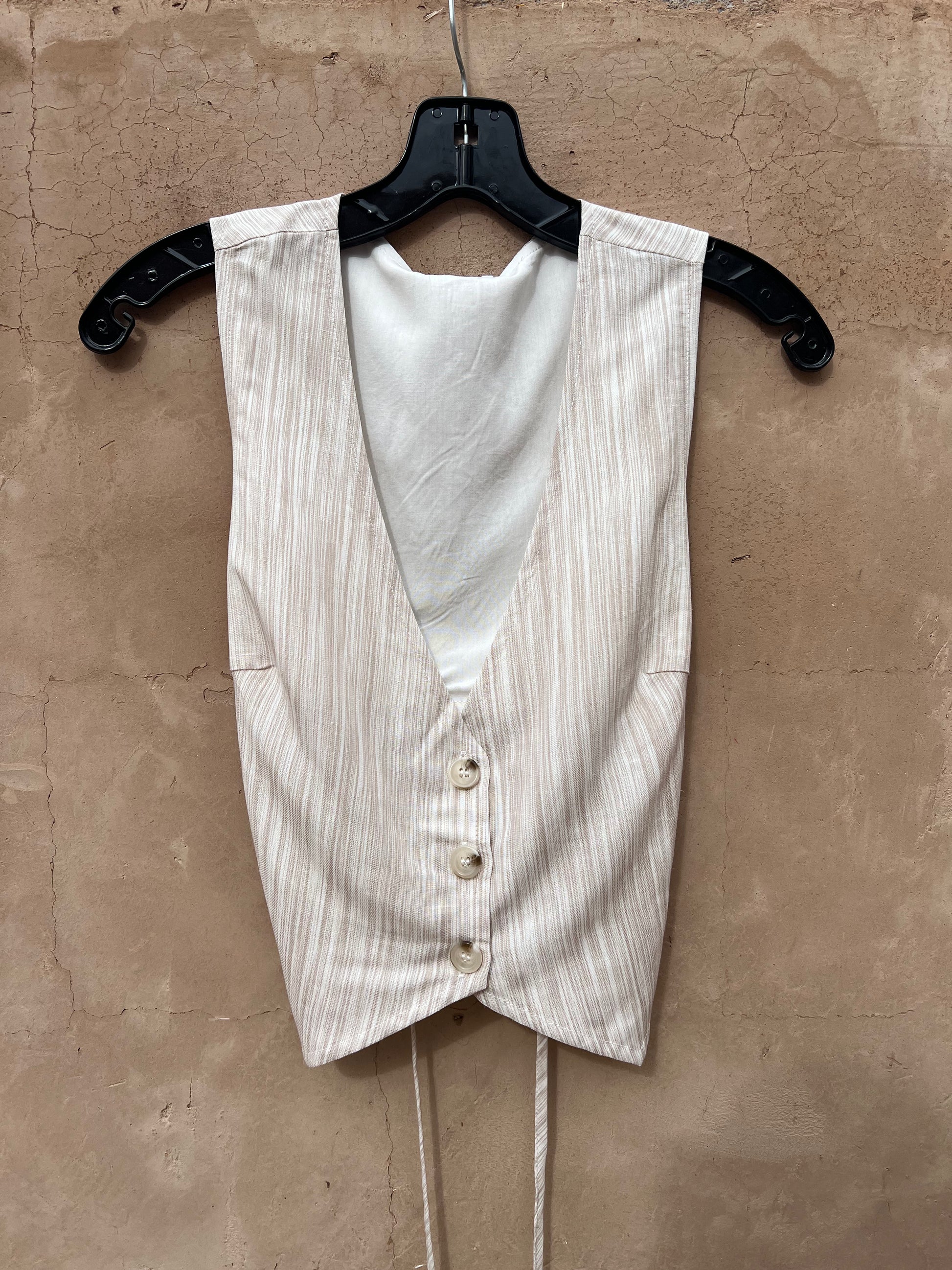 This open back lace up vest top features button down front closure, deep v neck and an adjustable string tie back. Cool and comfortable light weight material for summer.