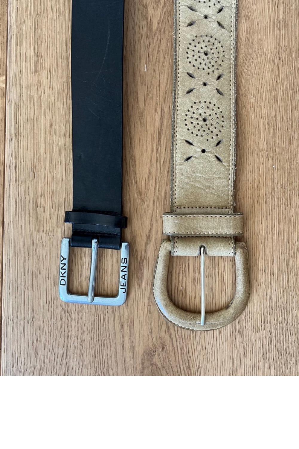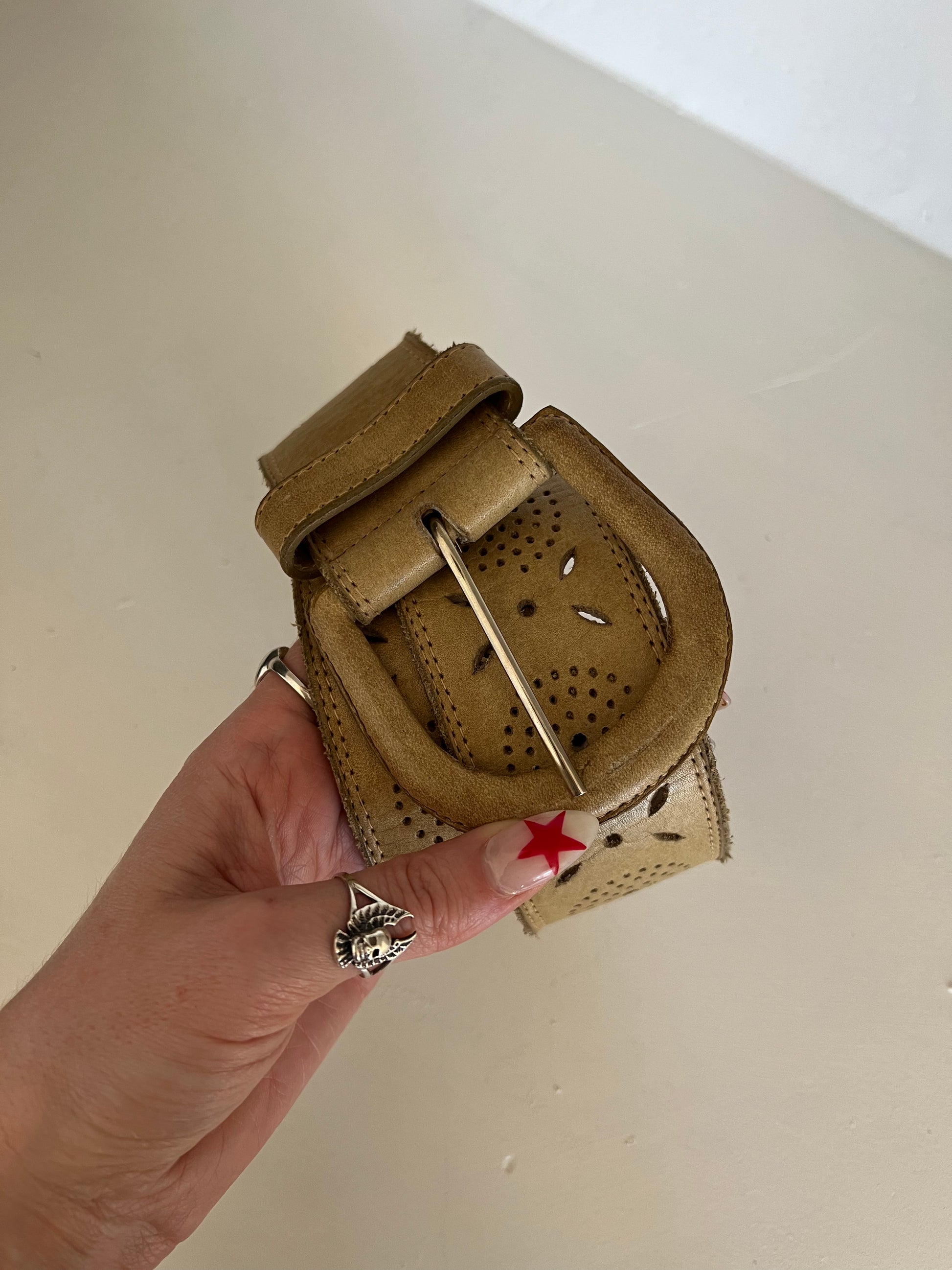 light tan leather cut outs belt with large buckle, made in USA by Carole Little size Small