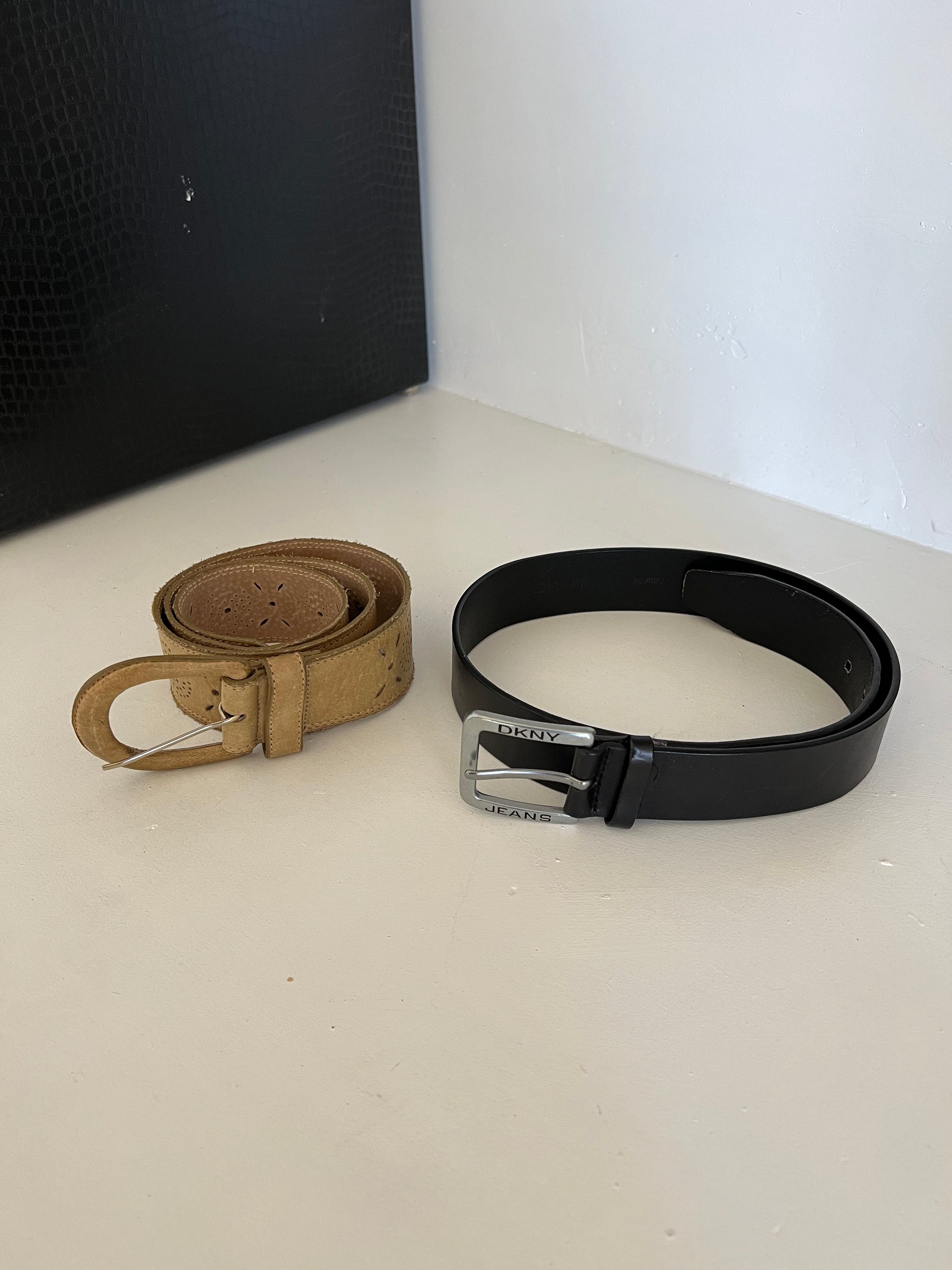 black leather vintage 90’s DKNY belt size Small with silver buckle and black logo.