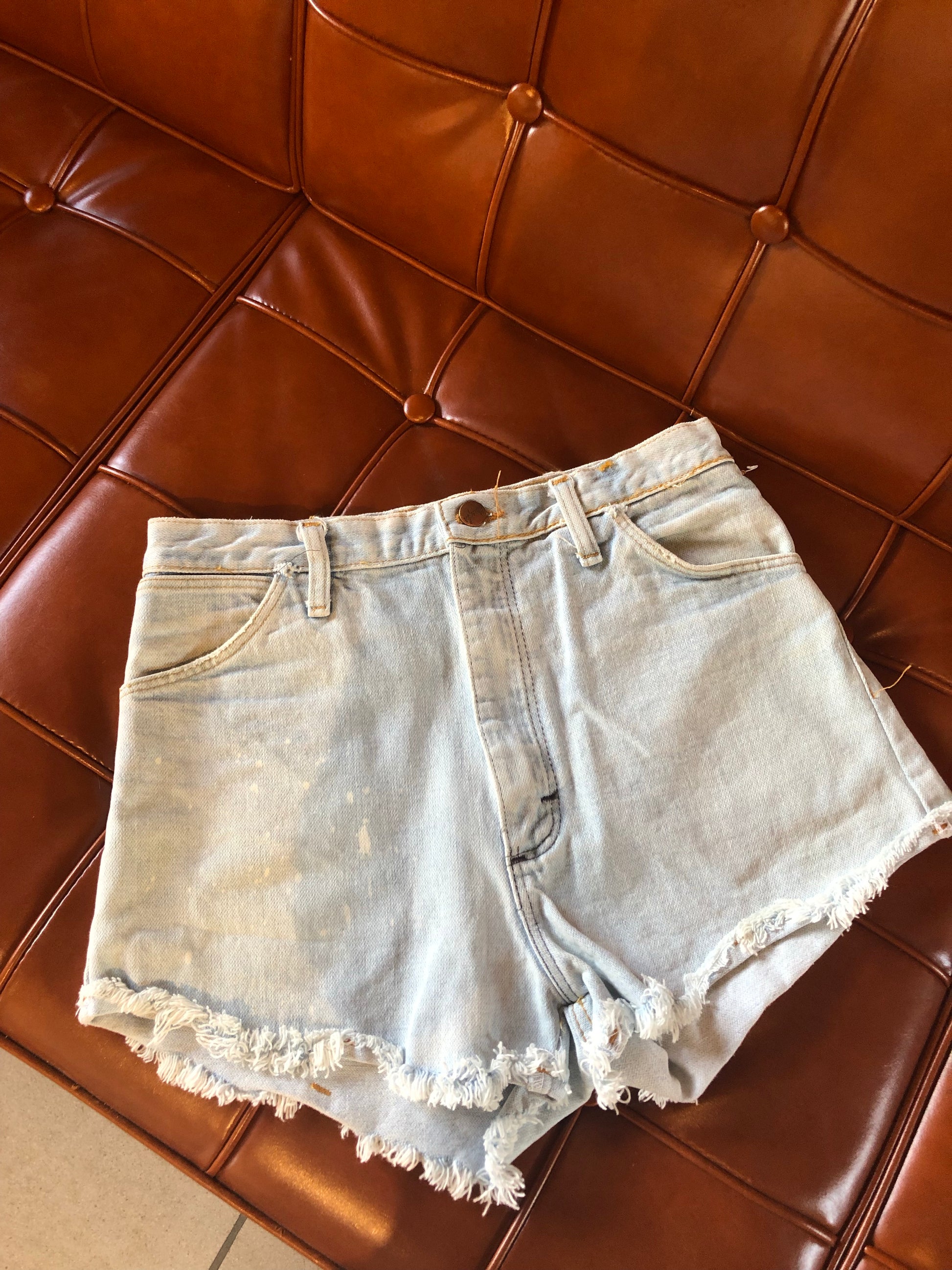 High waisted light wash cut off vintage Wrangler shorts with light paint splatter on left side.