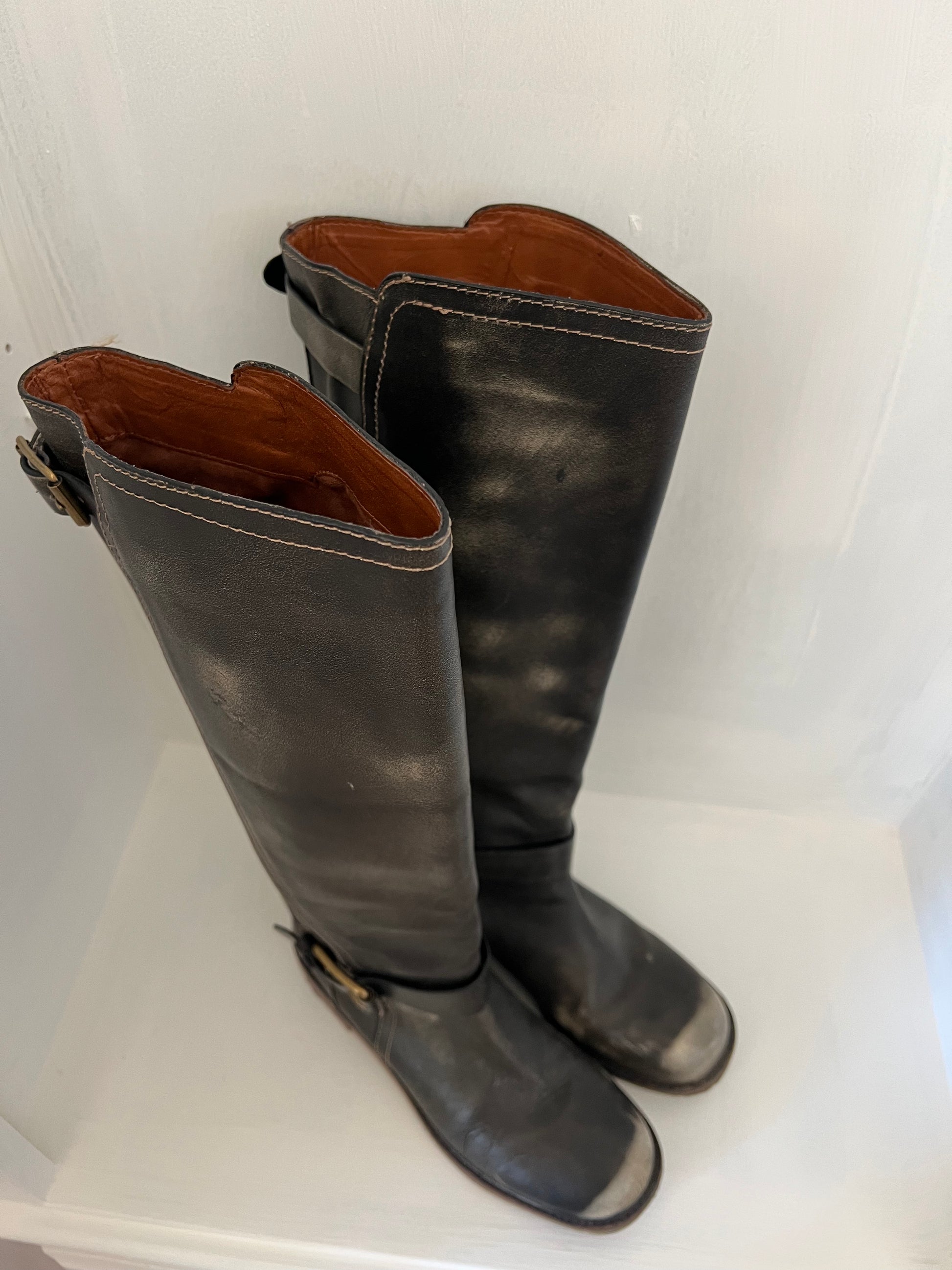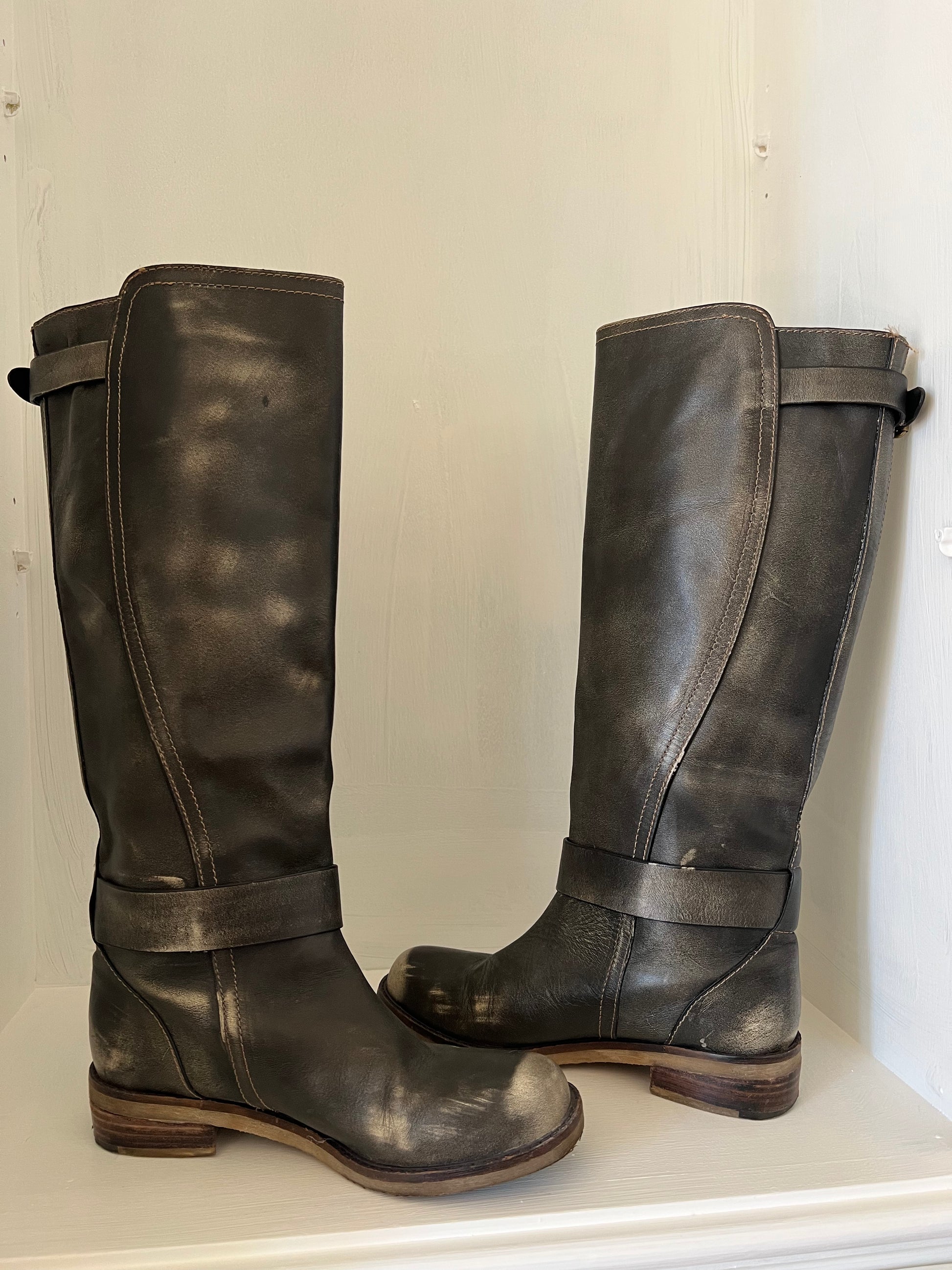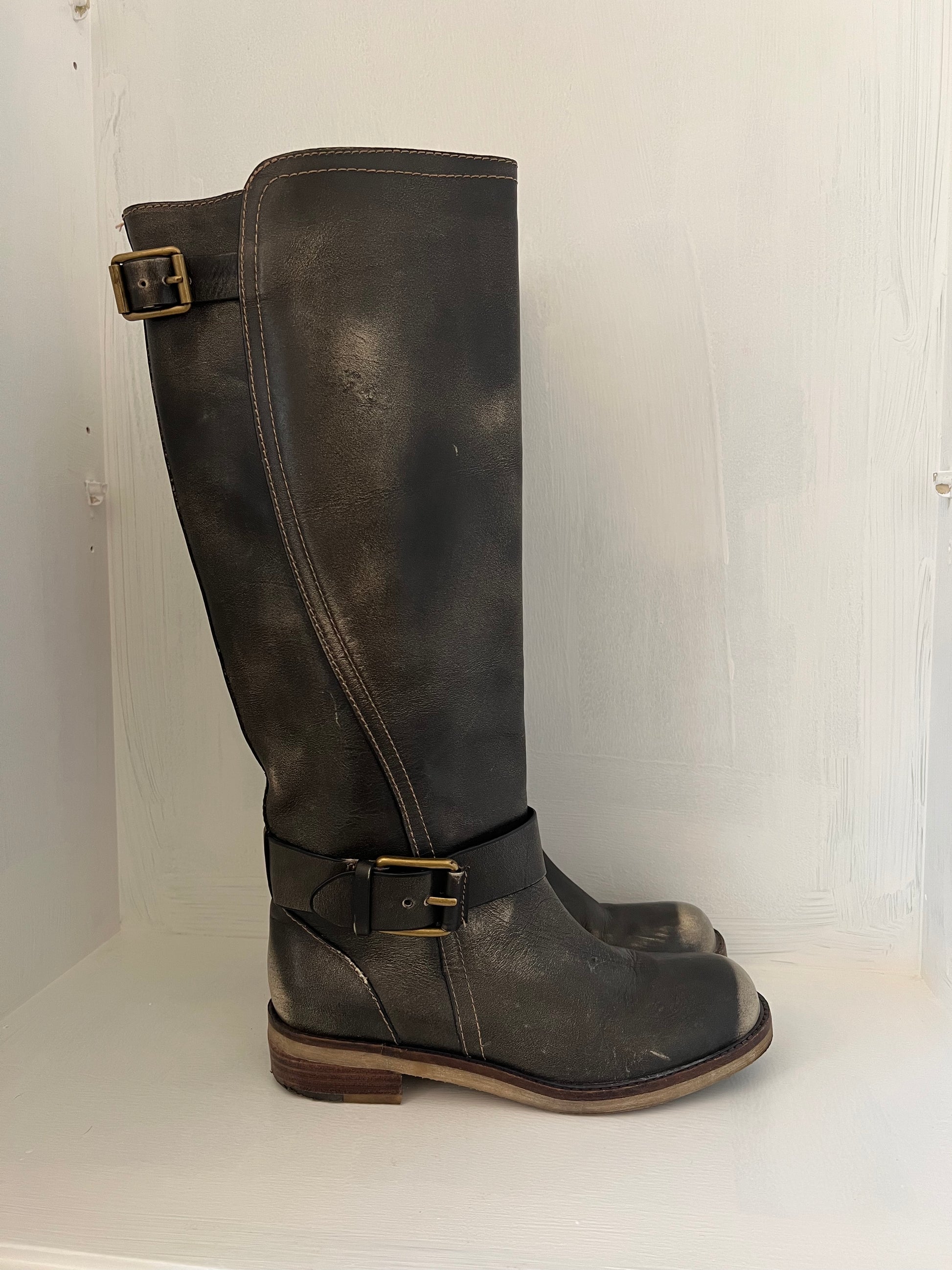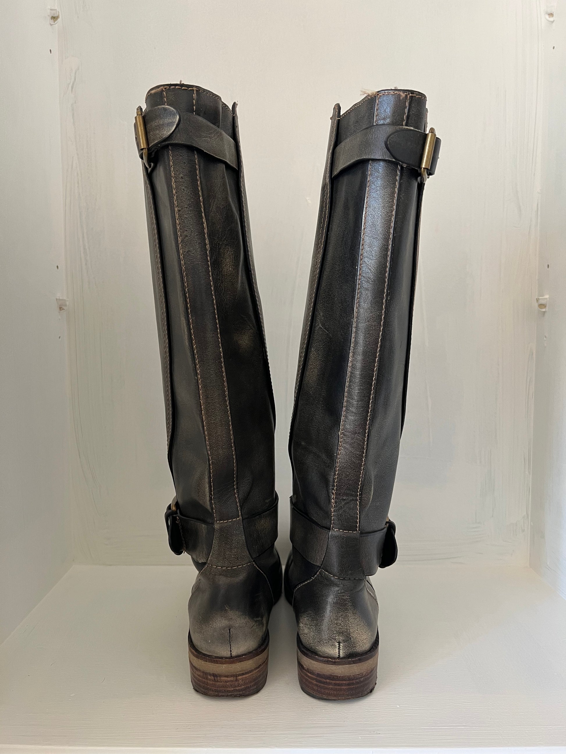 Oiled distressed faded brown leather knee boots from Lucky Brand. These pull-on boots feature an orange suede interior, brass buckles, contrast stitching and fade dip toe.