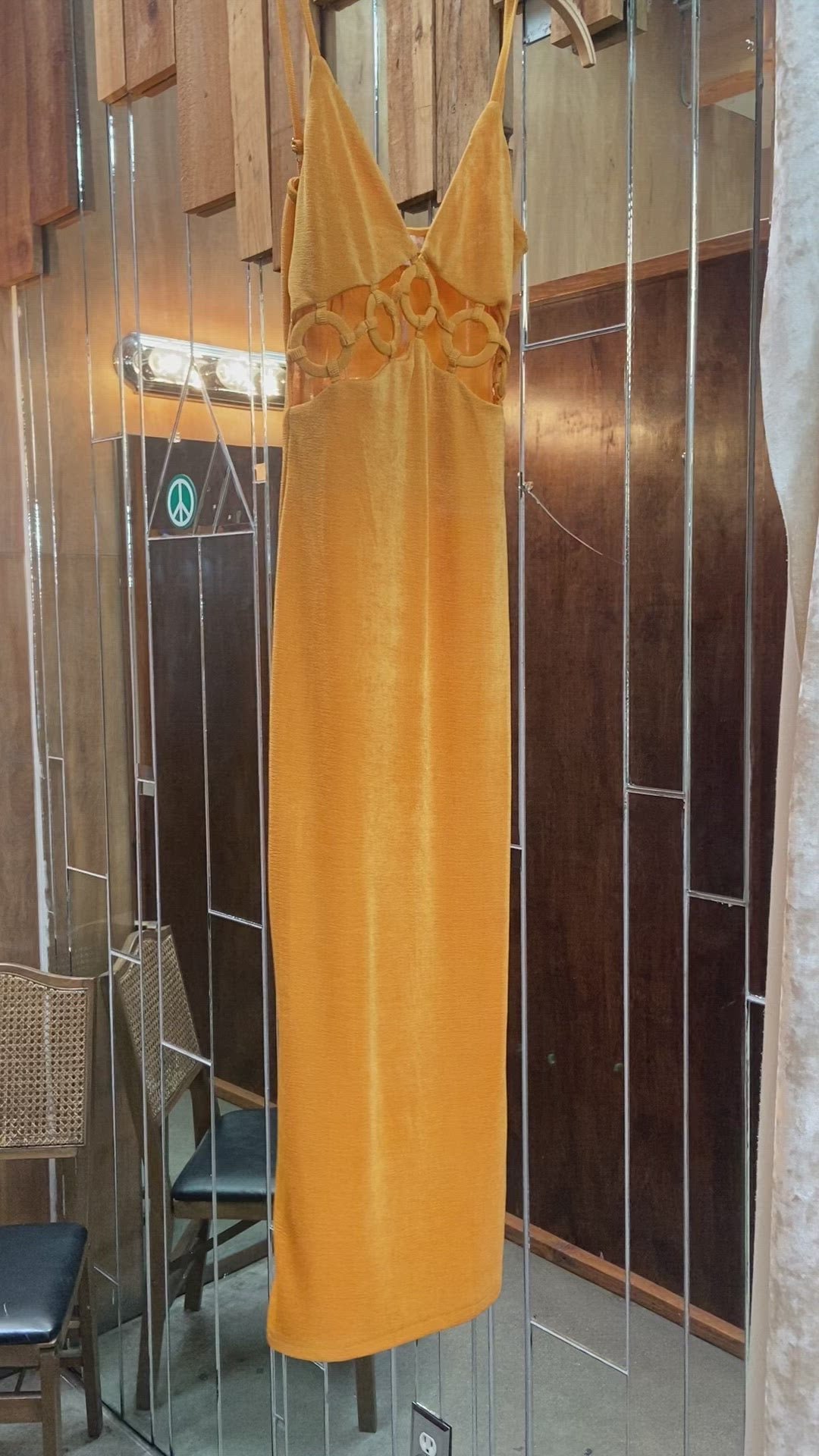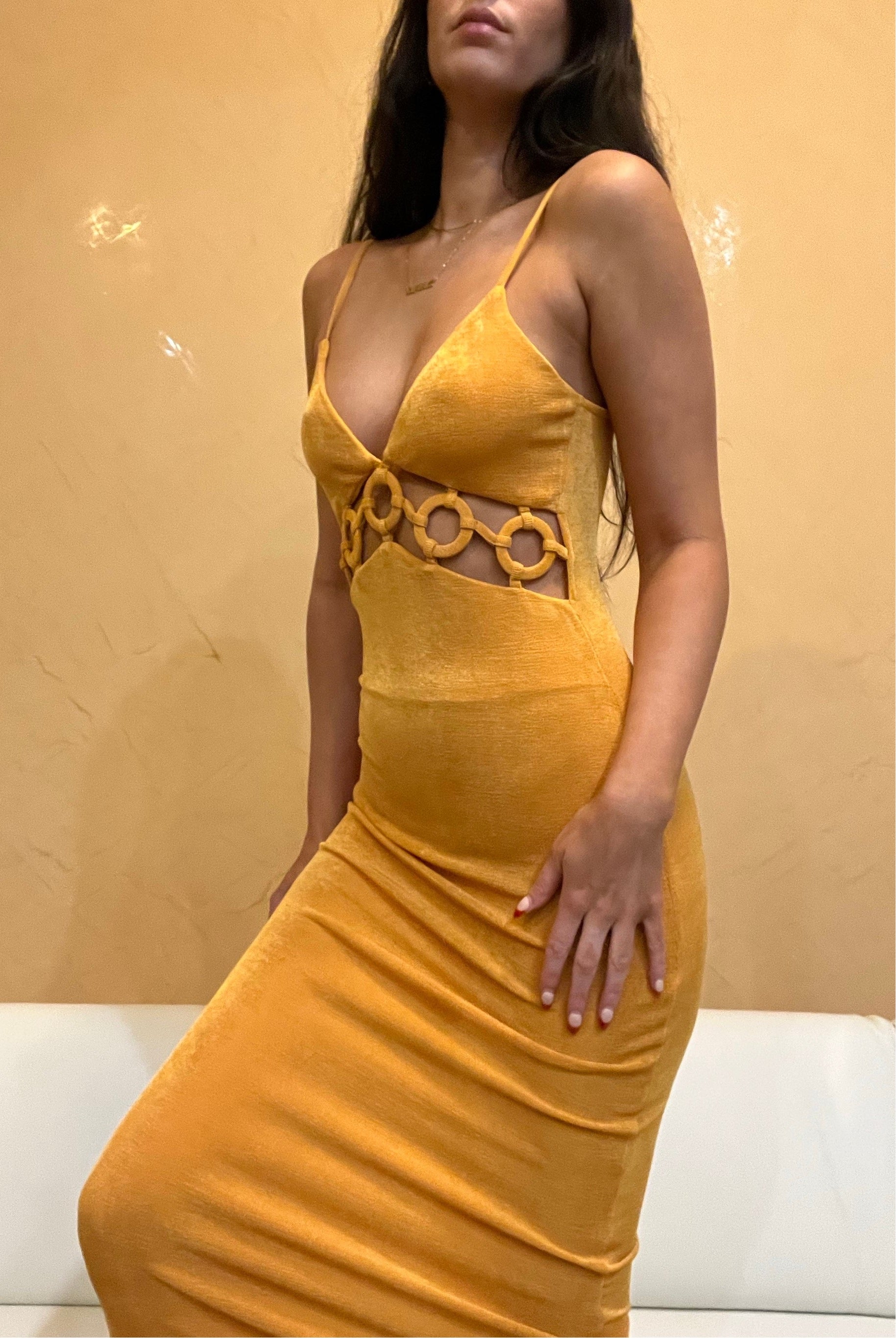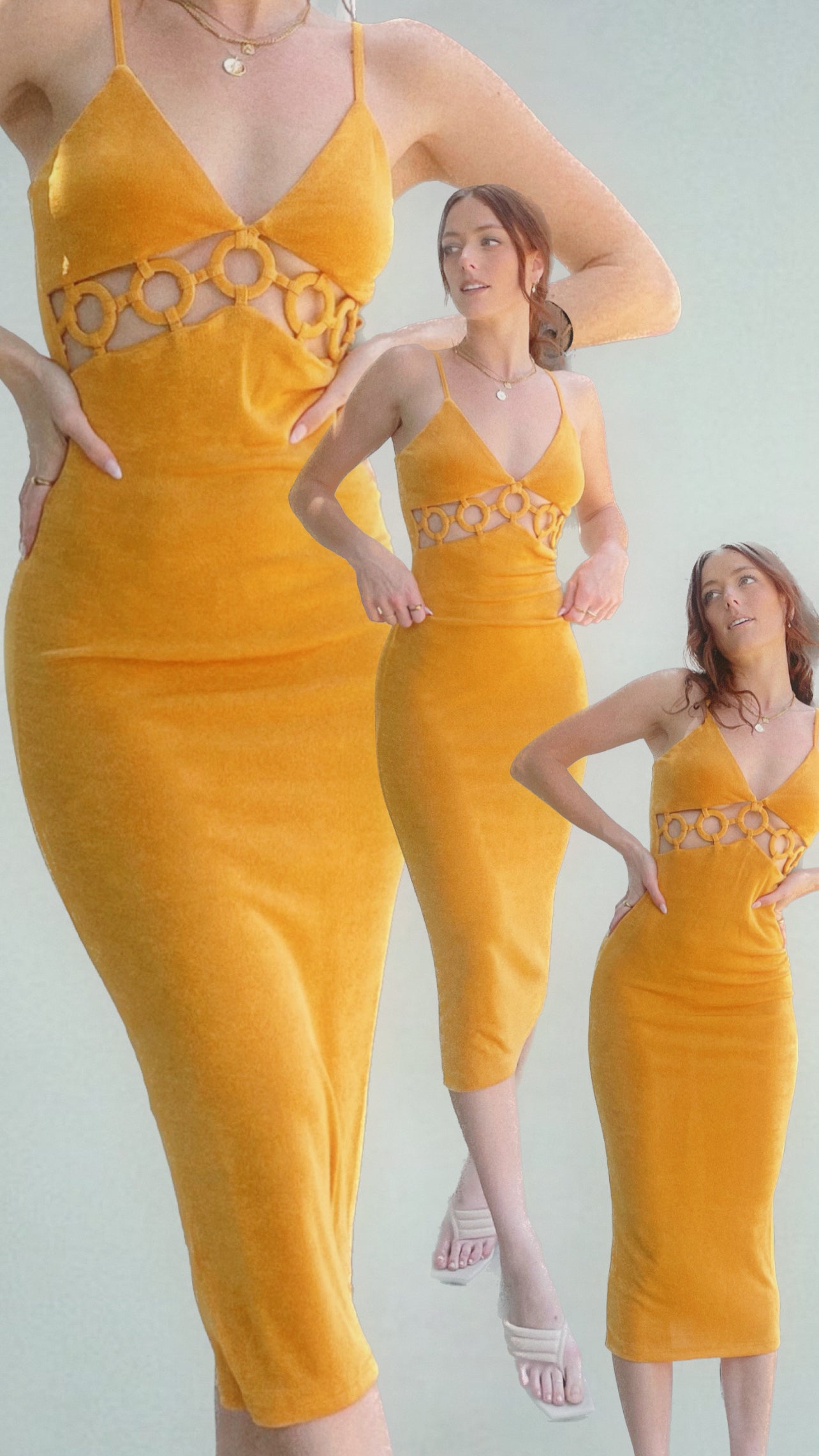 Vibrant mango orange slinky midi dress with circle cut out detail and adjustable straps. This dress has some stretch and features a double lined chest area but not the skirt part so requires nude underwear! Or none ;)