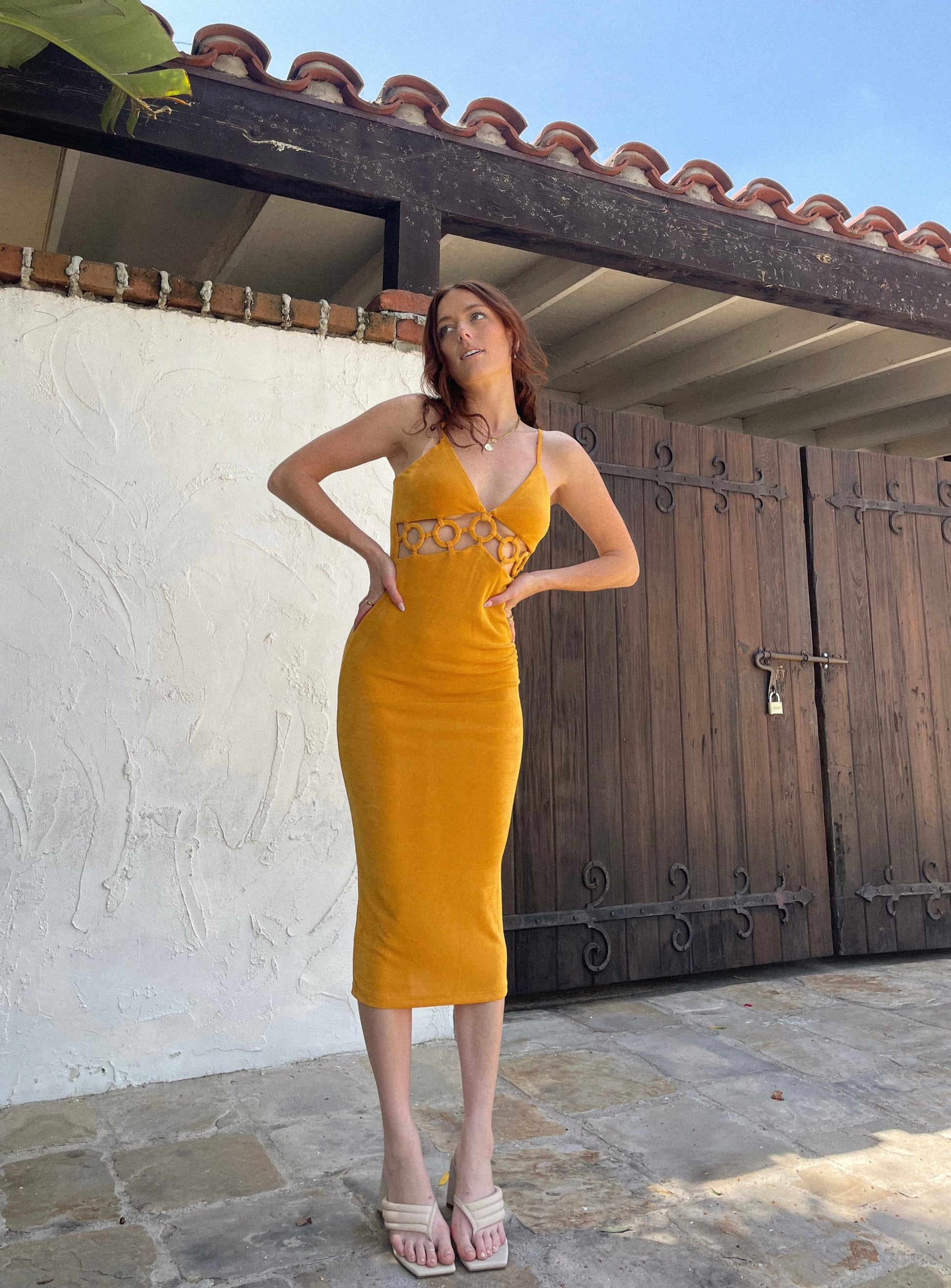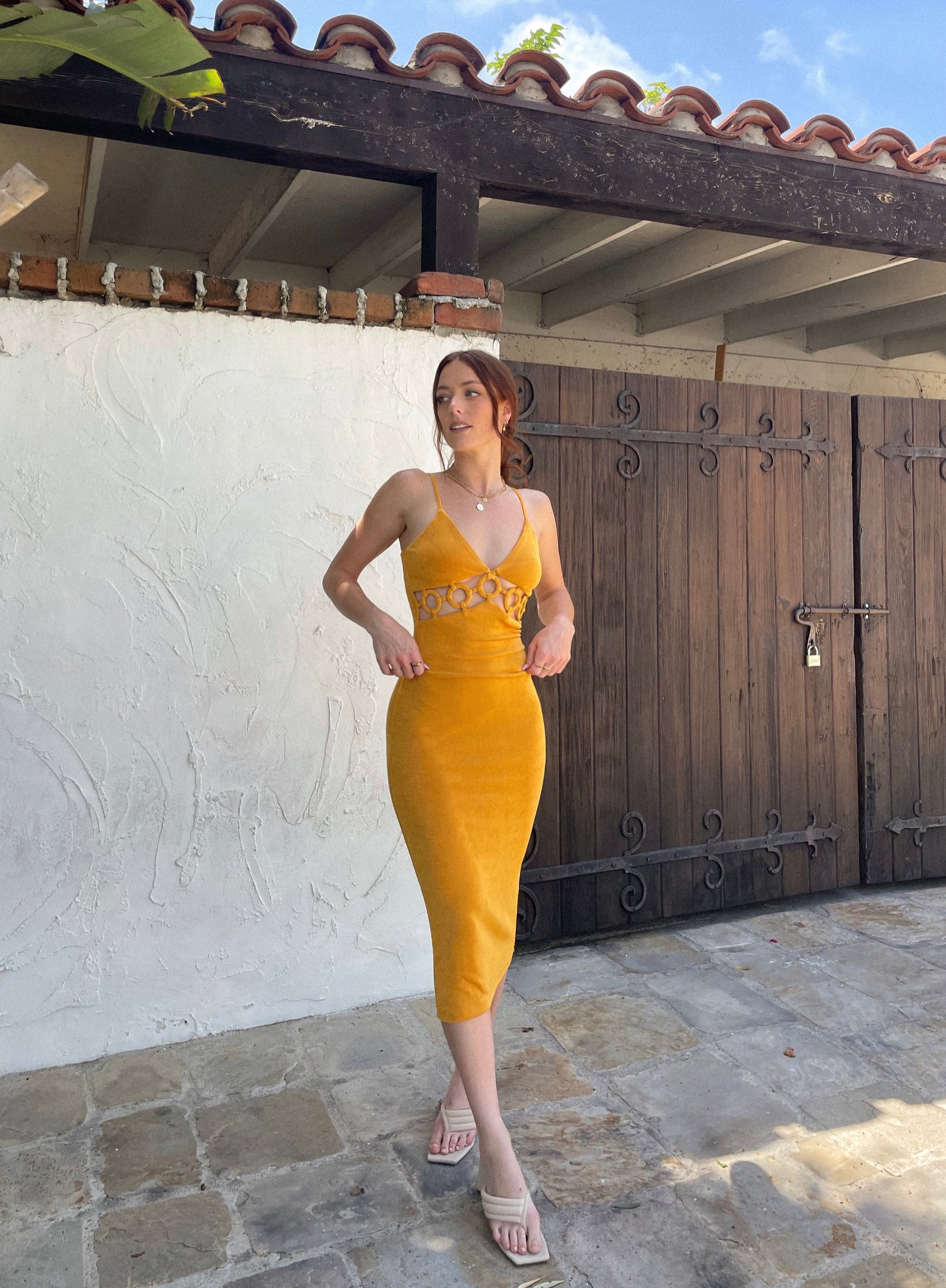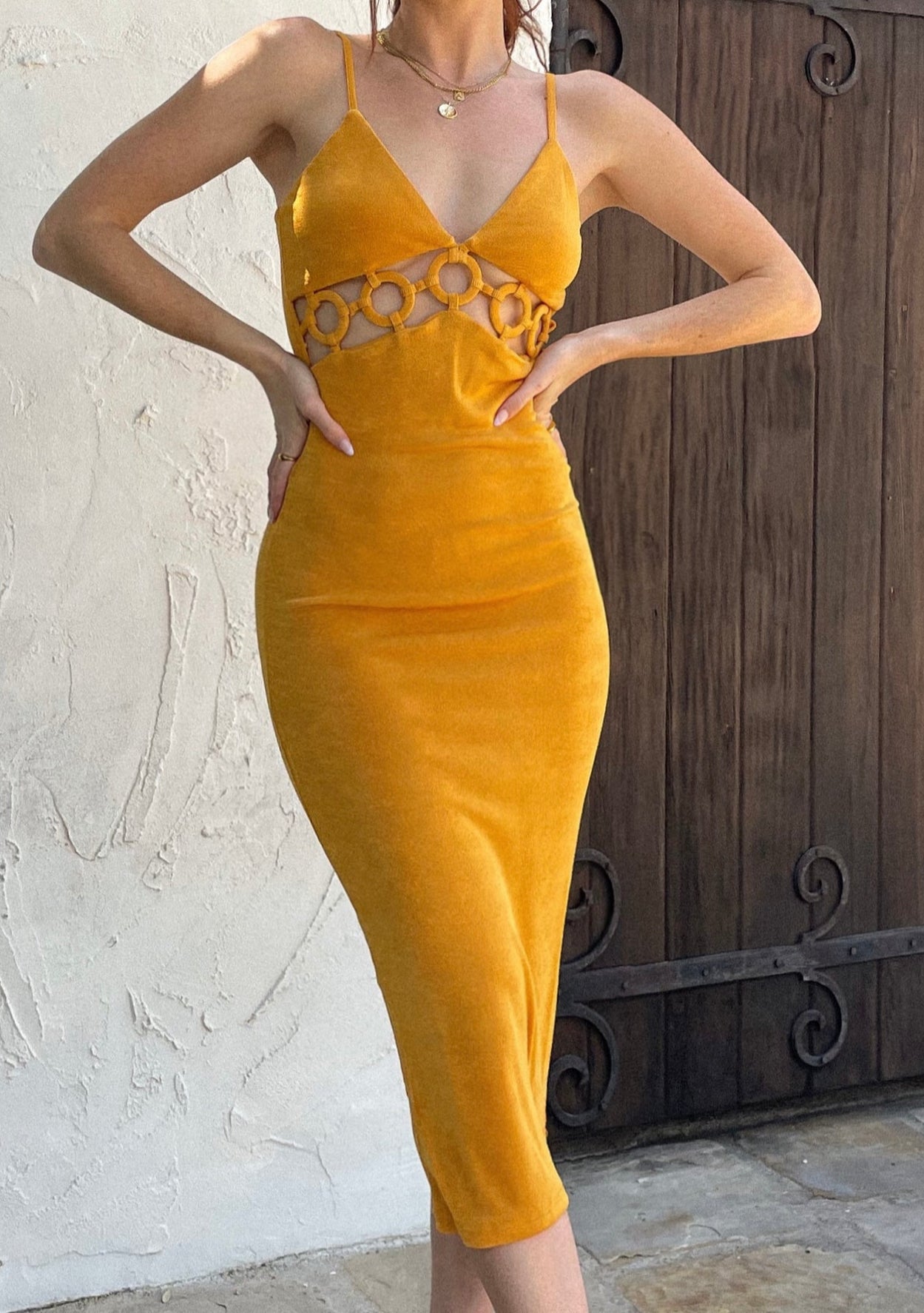 Vibrant mango orange slinky midi dress with circle cut out detail and adjustable straps. This dress has some stretch and features a double lined chest area but not the skirt part so requires nude underwear! Or none ;)
