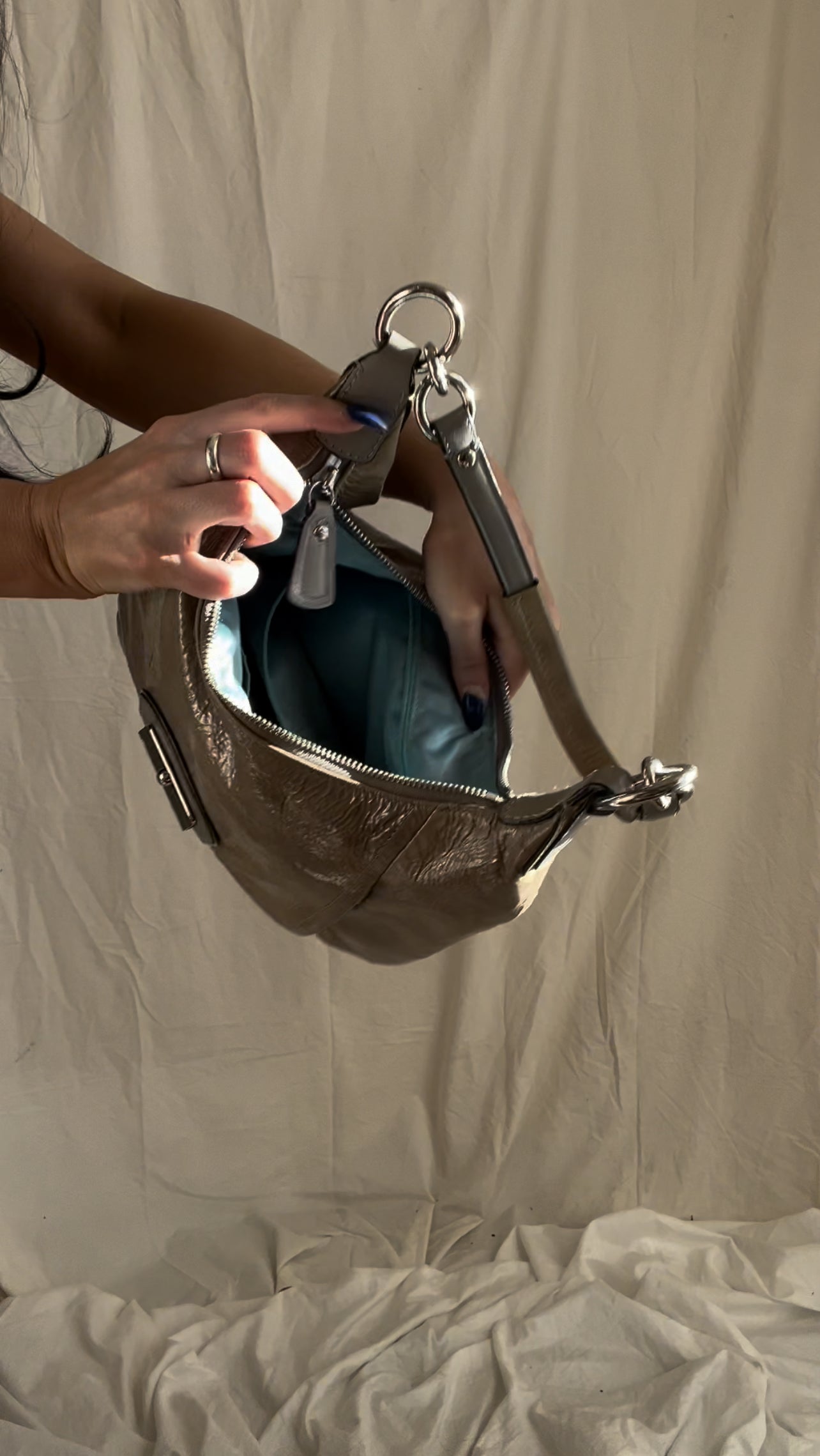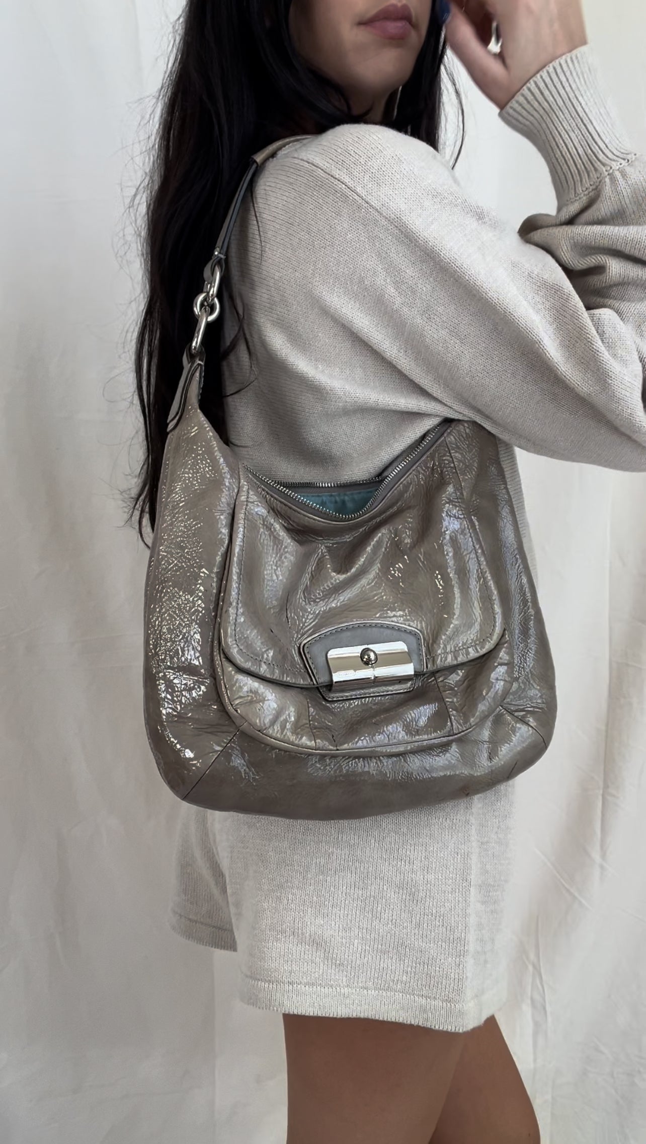 Vintage light green patent leather Coach bag with silver hardware. Over the shoulder with included removable cross-body strap. Has some knicks and pen marks see photos.