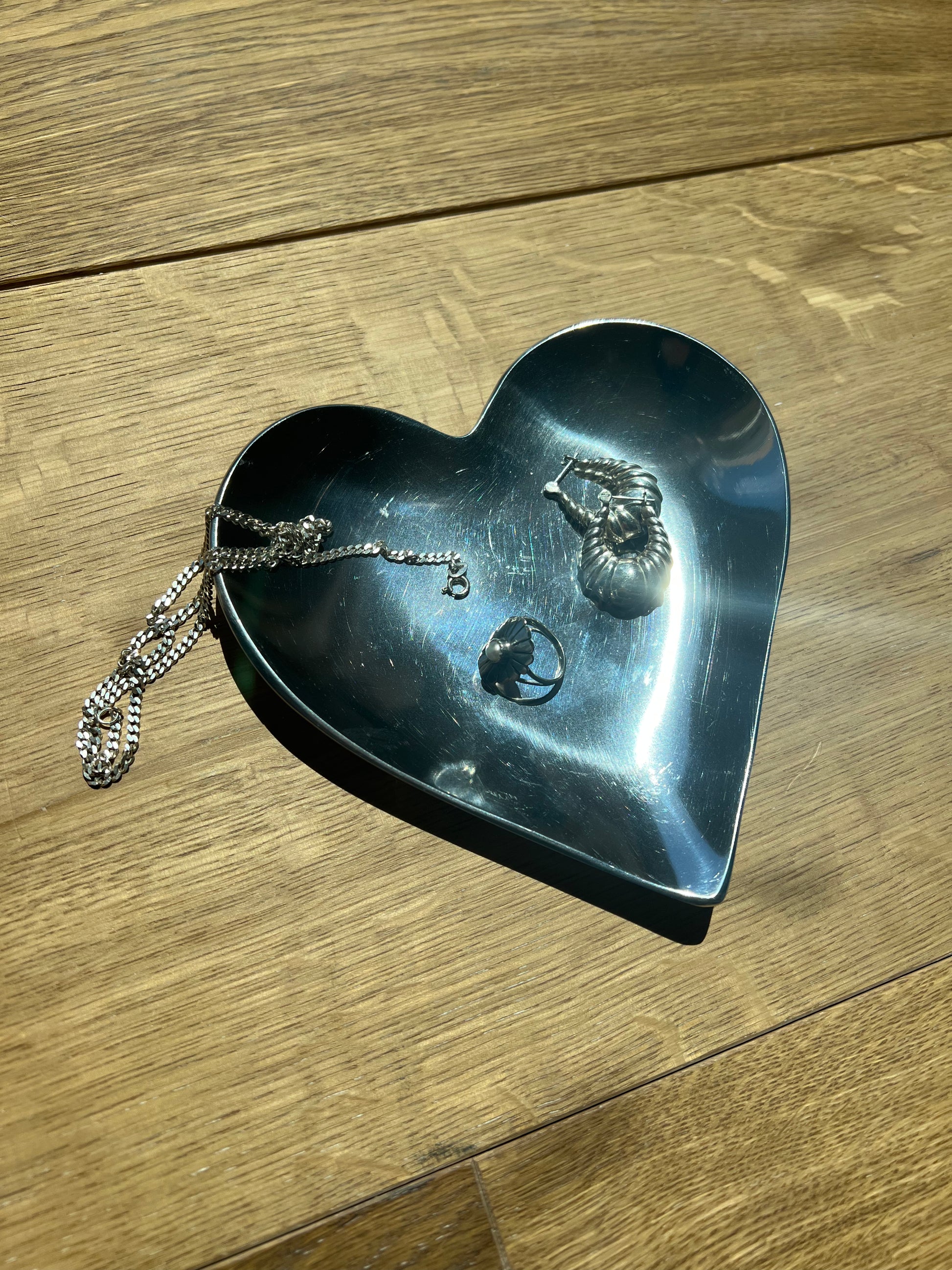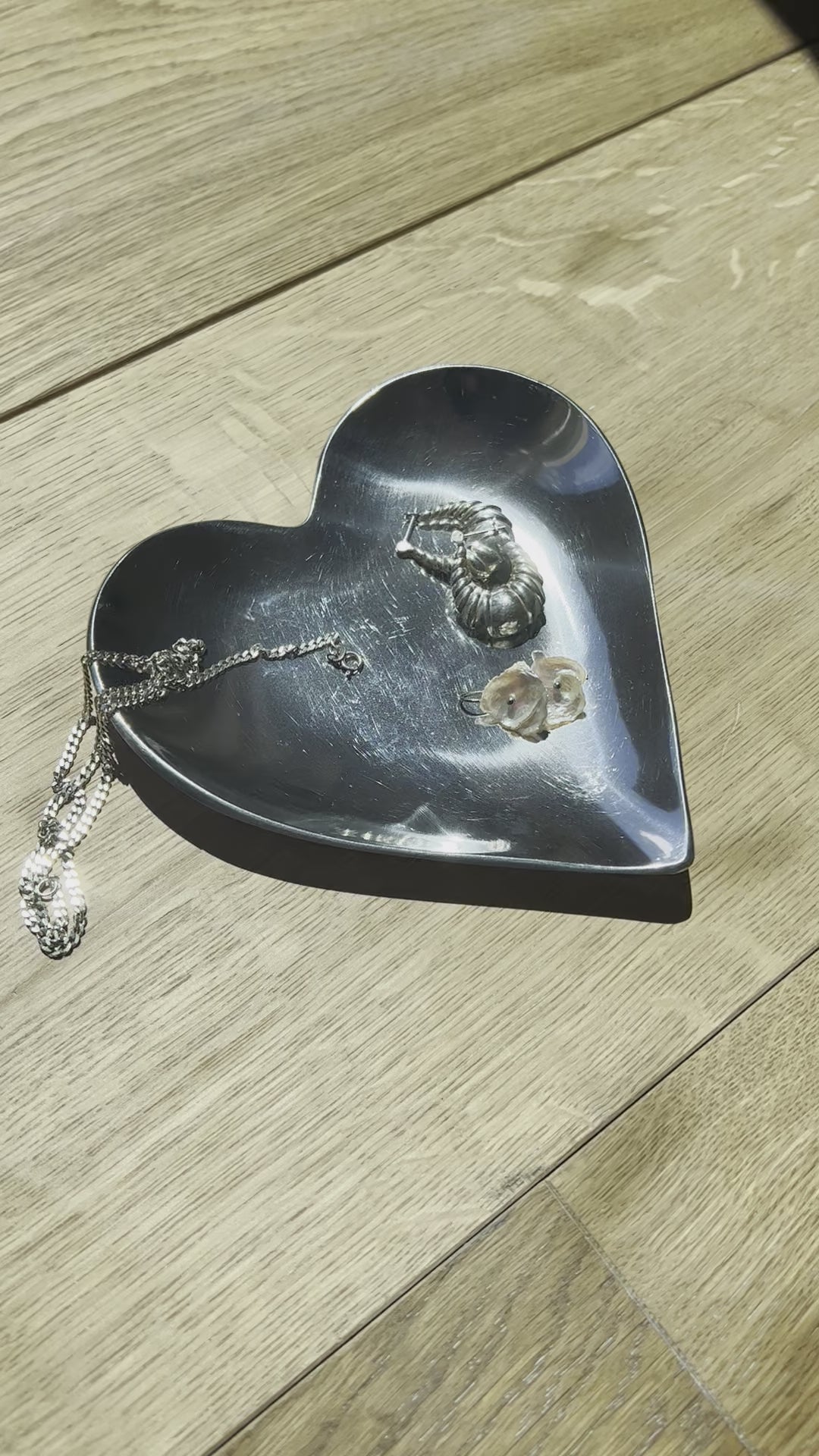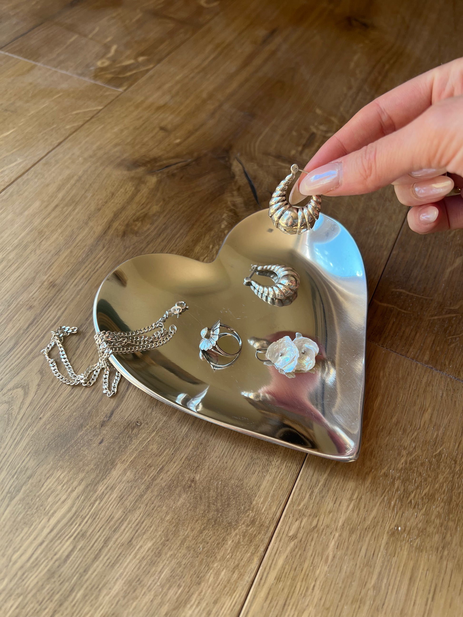 This Upcycled chrome silver metal heart dish is perfect for holding jewelry, soaps, or candles and accents any room perfectly.
