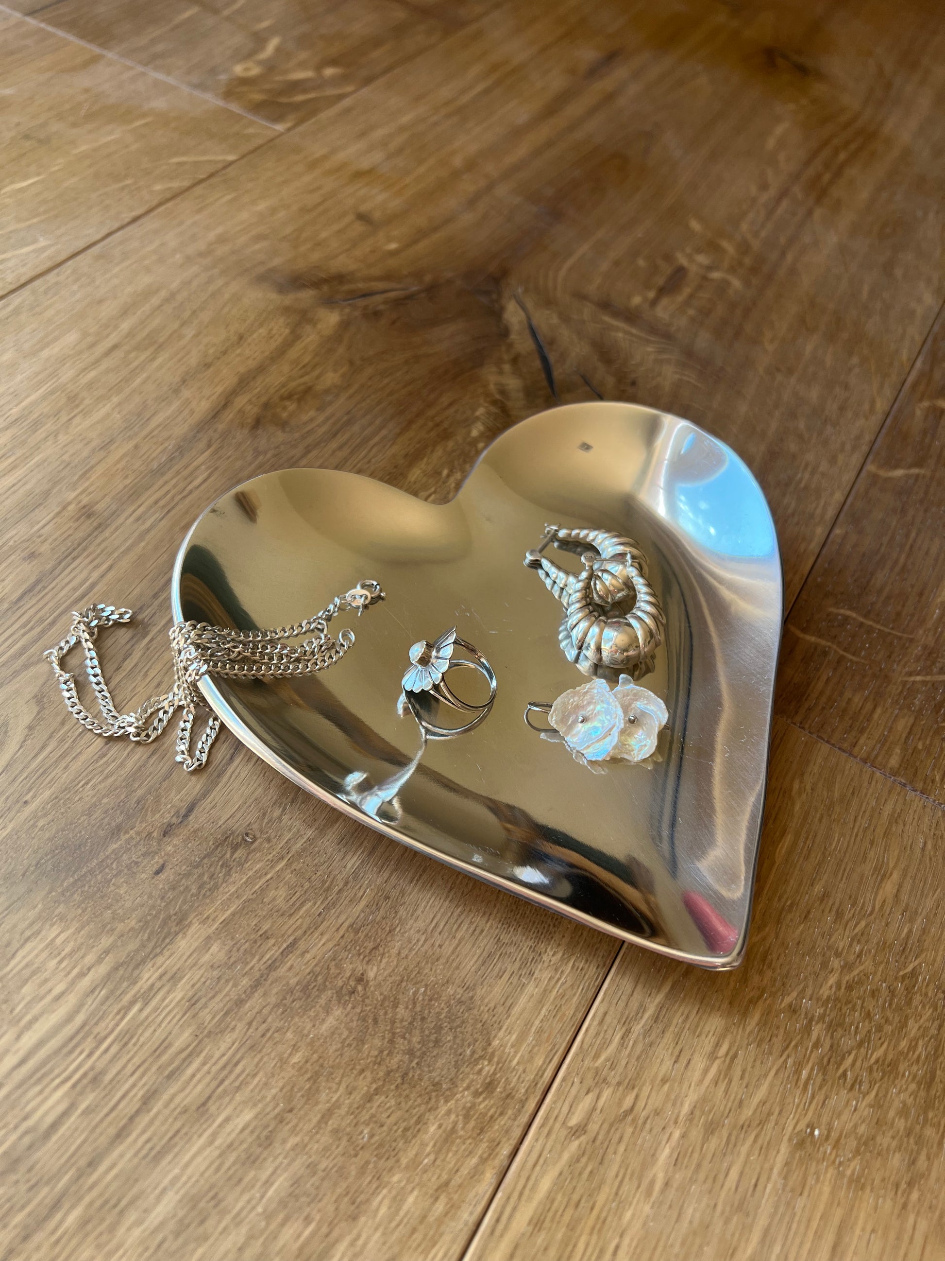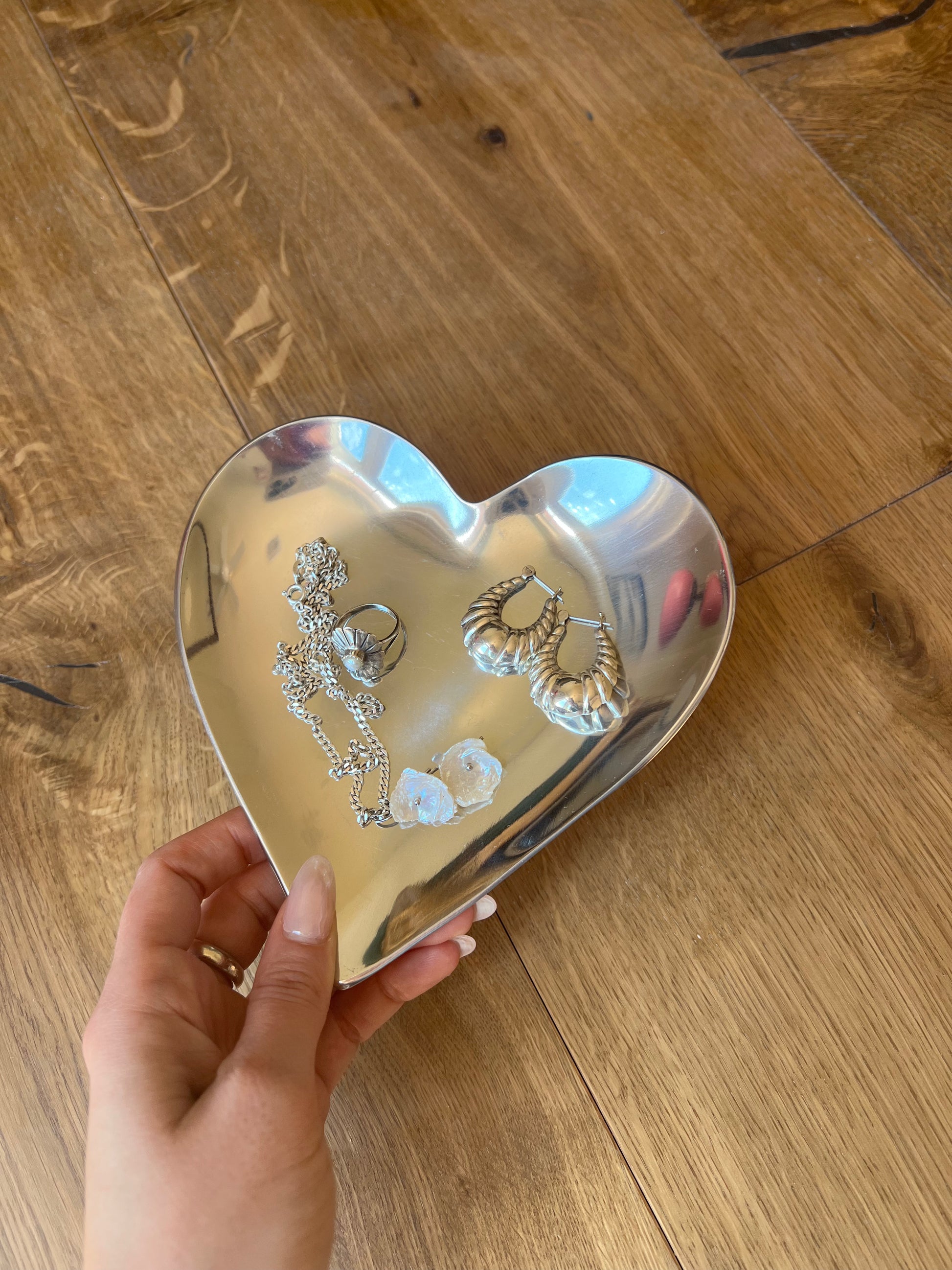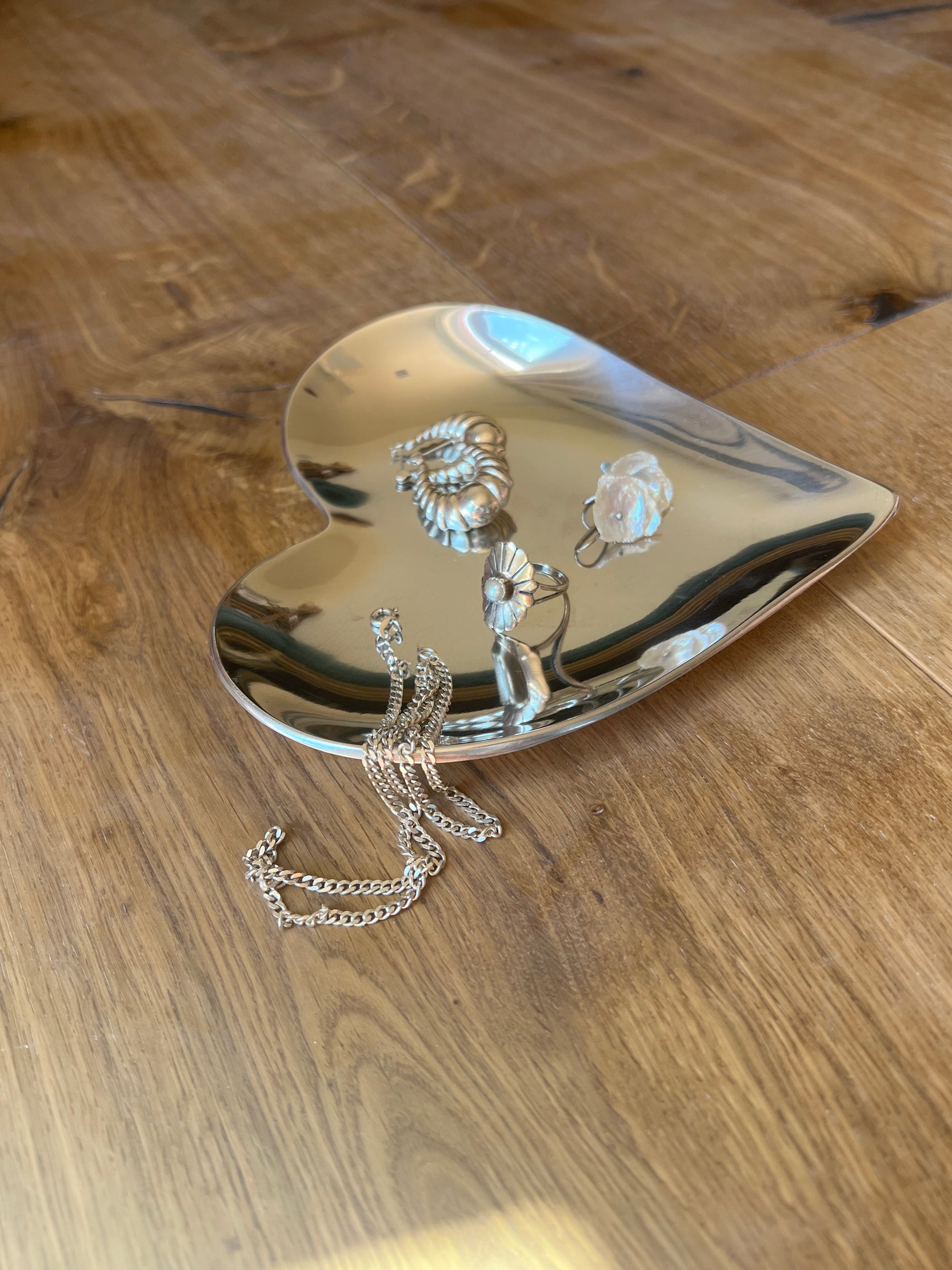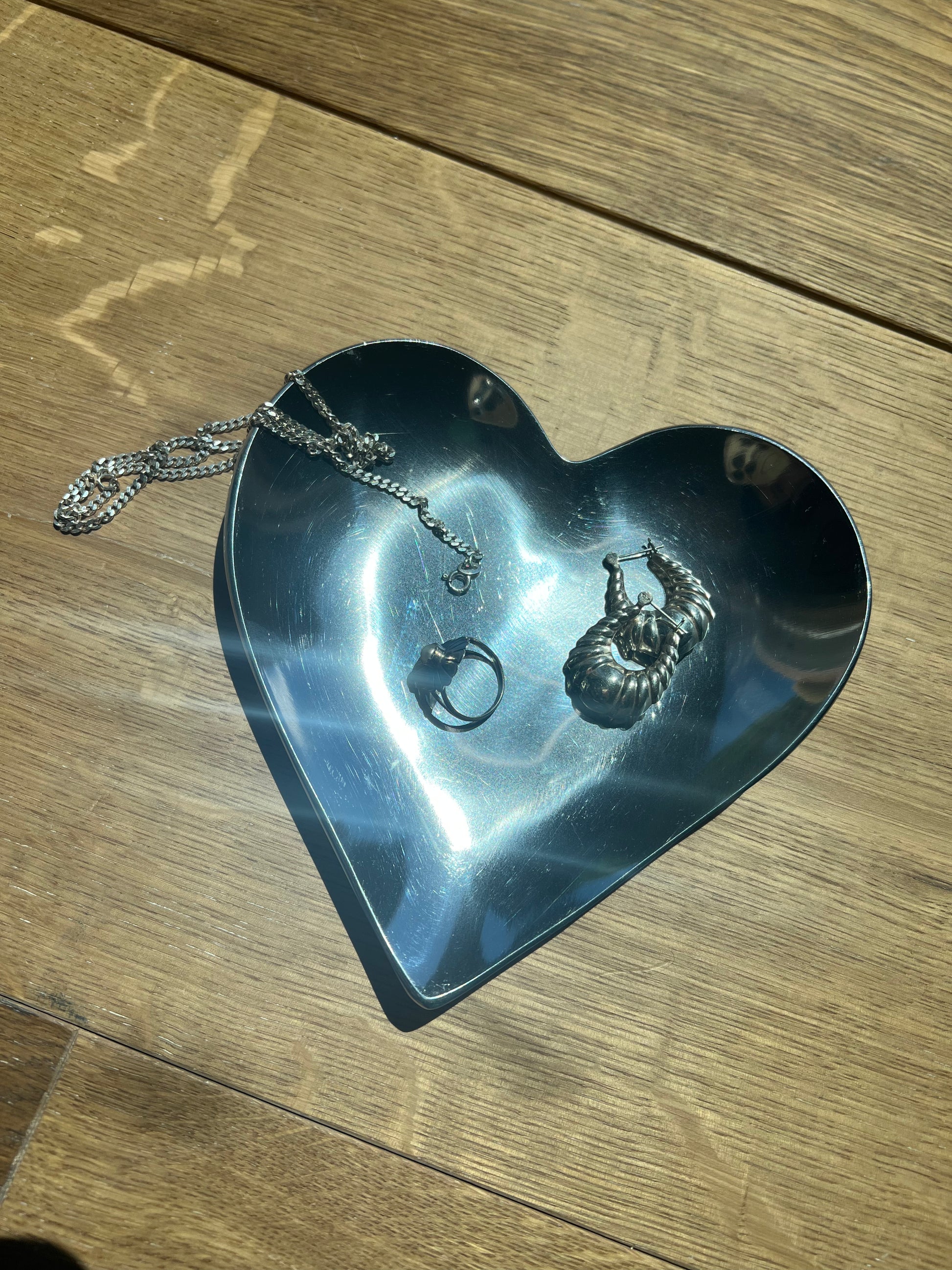 This Upcycled chrome silver metal heart dish is perfect for holding jewelry, soaps, or candles and accents any room perfectly.