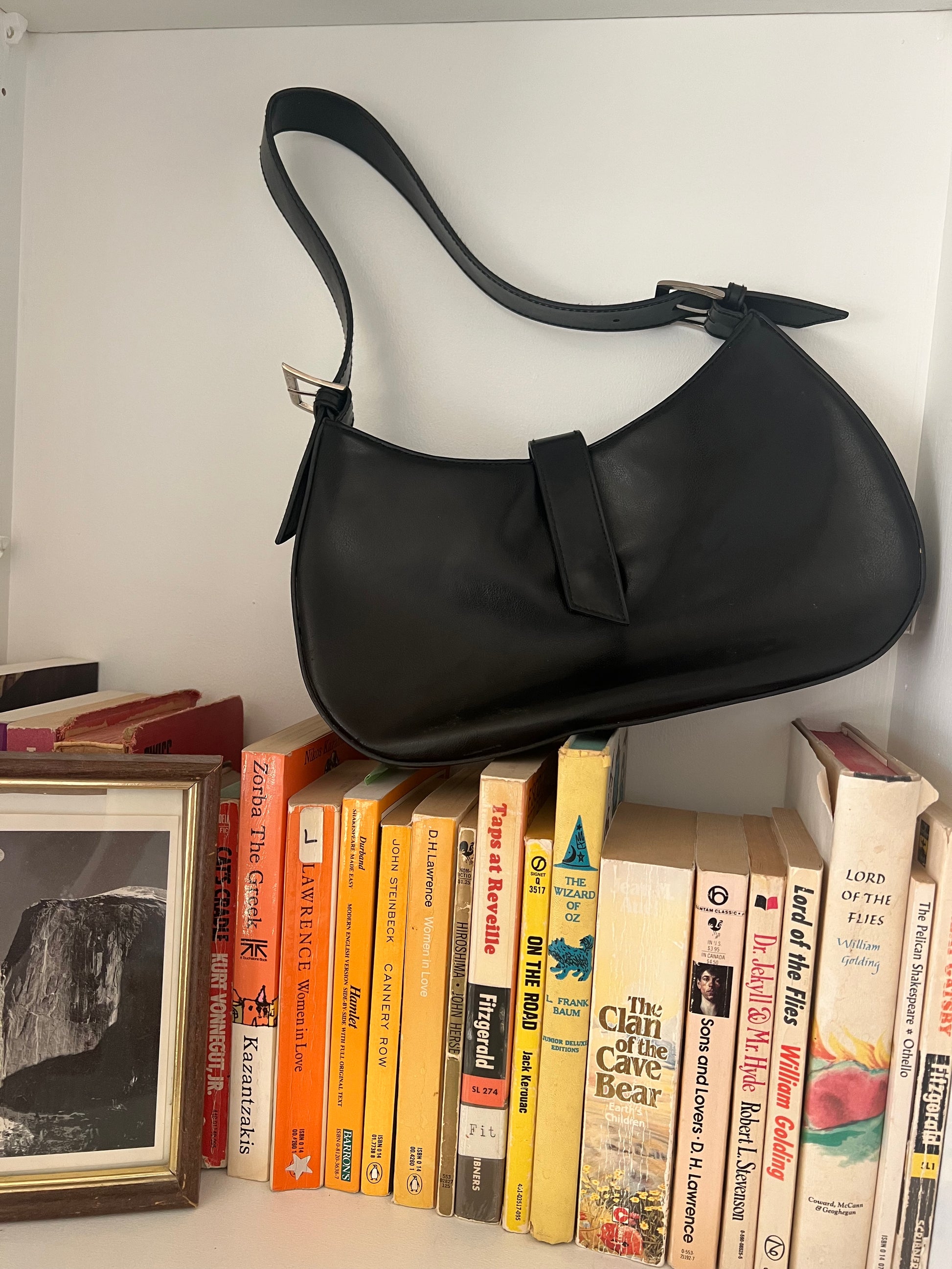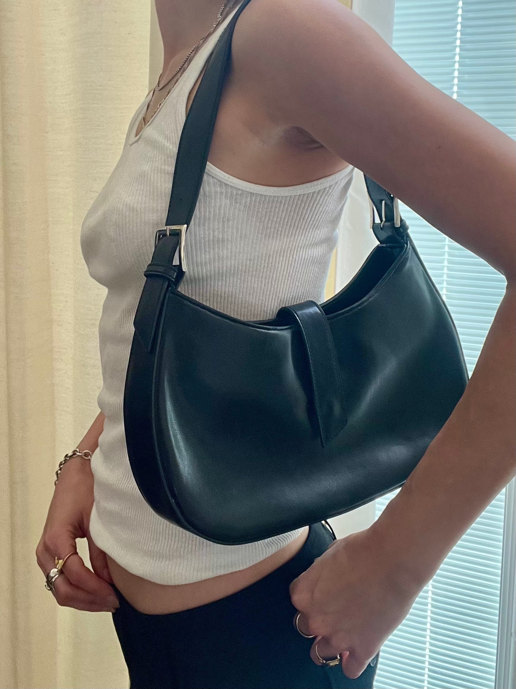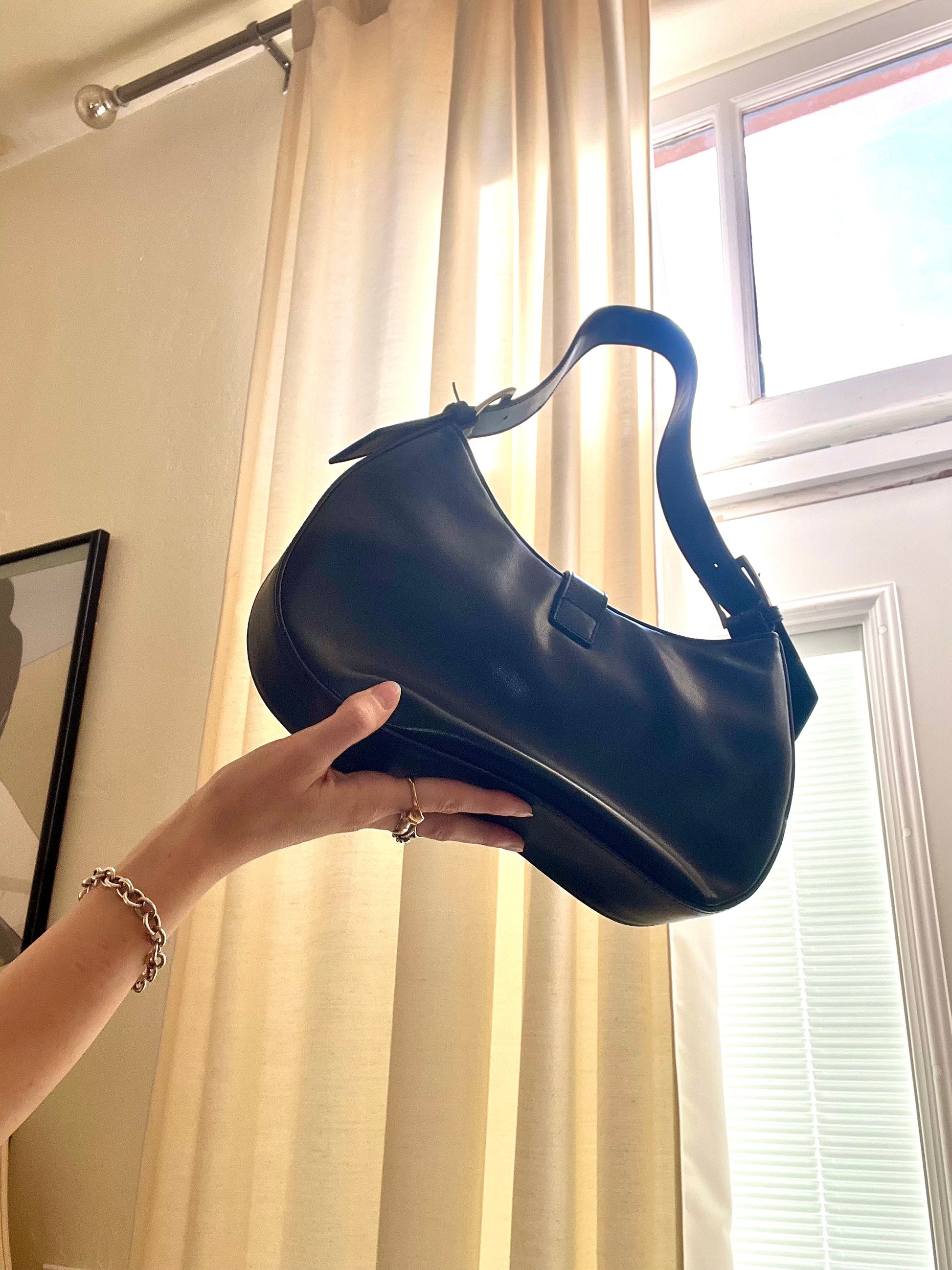 Black faux leather shoulder bag with curved lines and silver buckle hardware. Brand is Mondani New York.