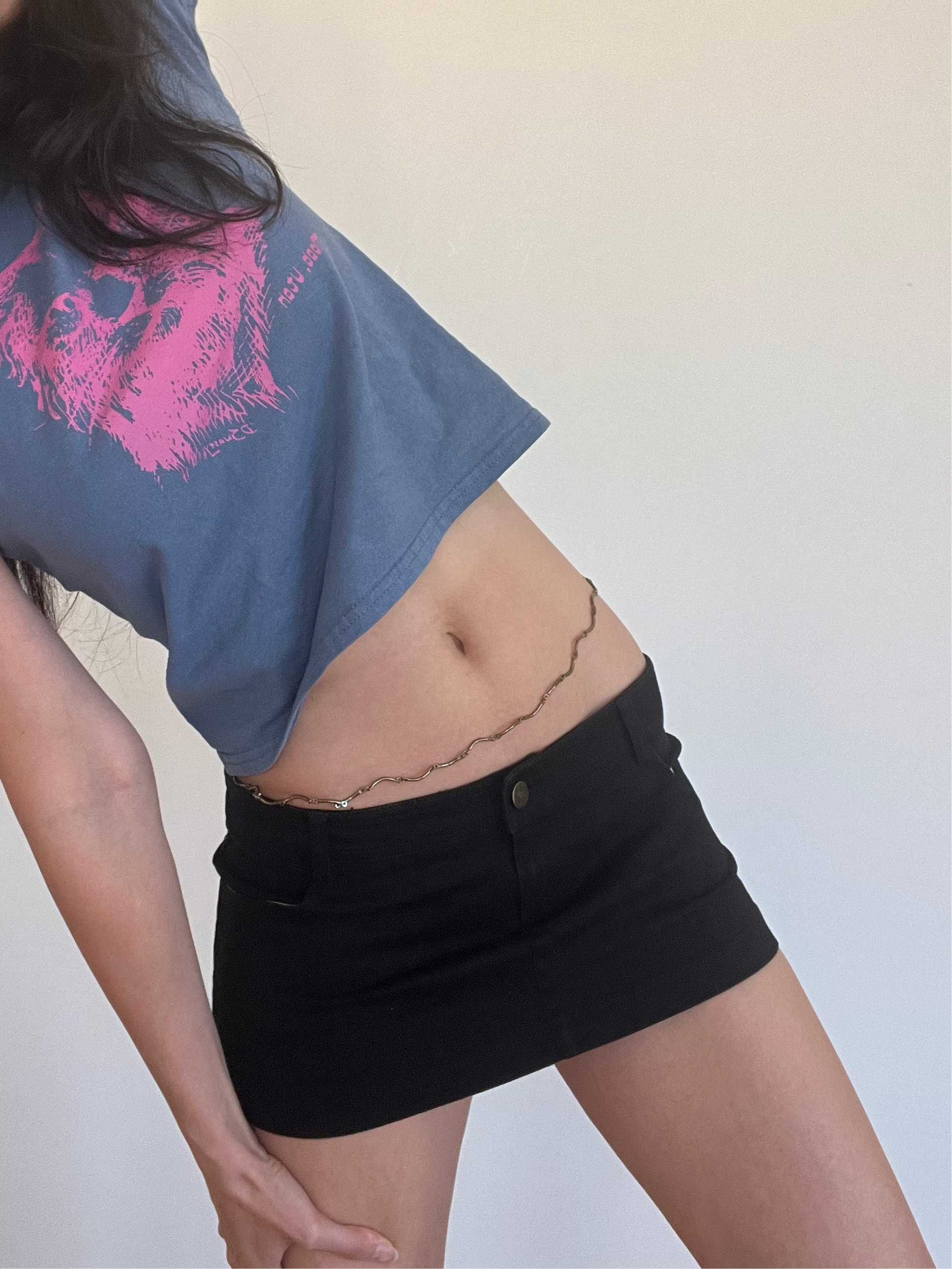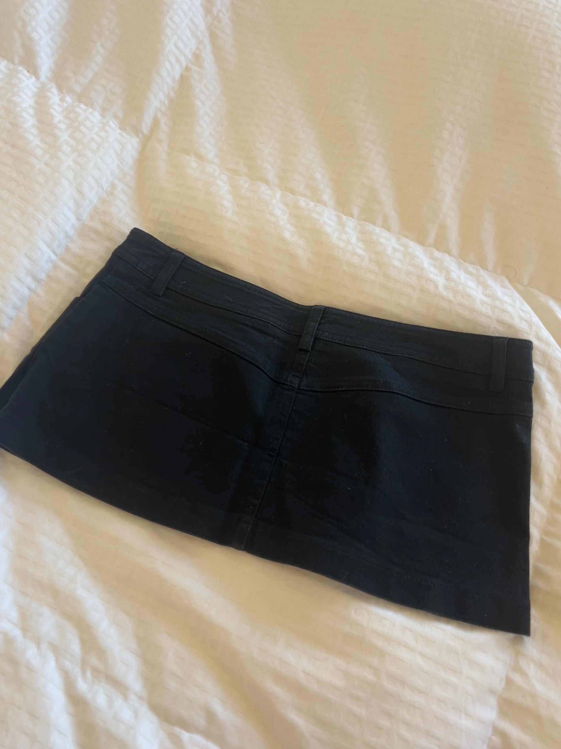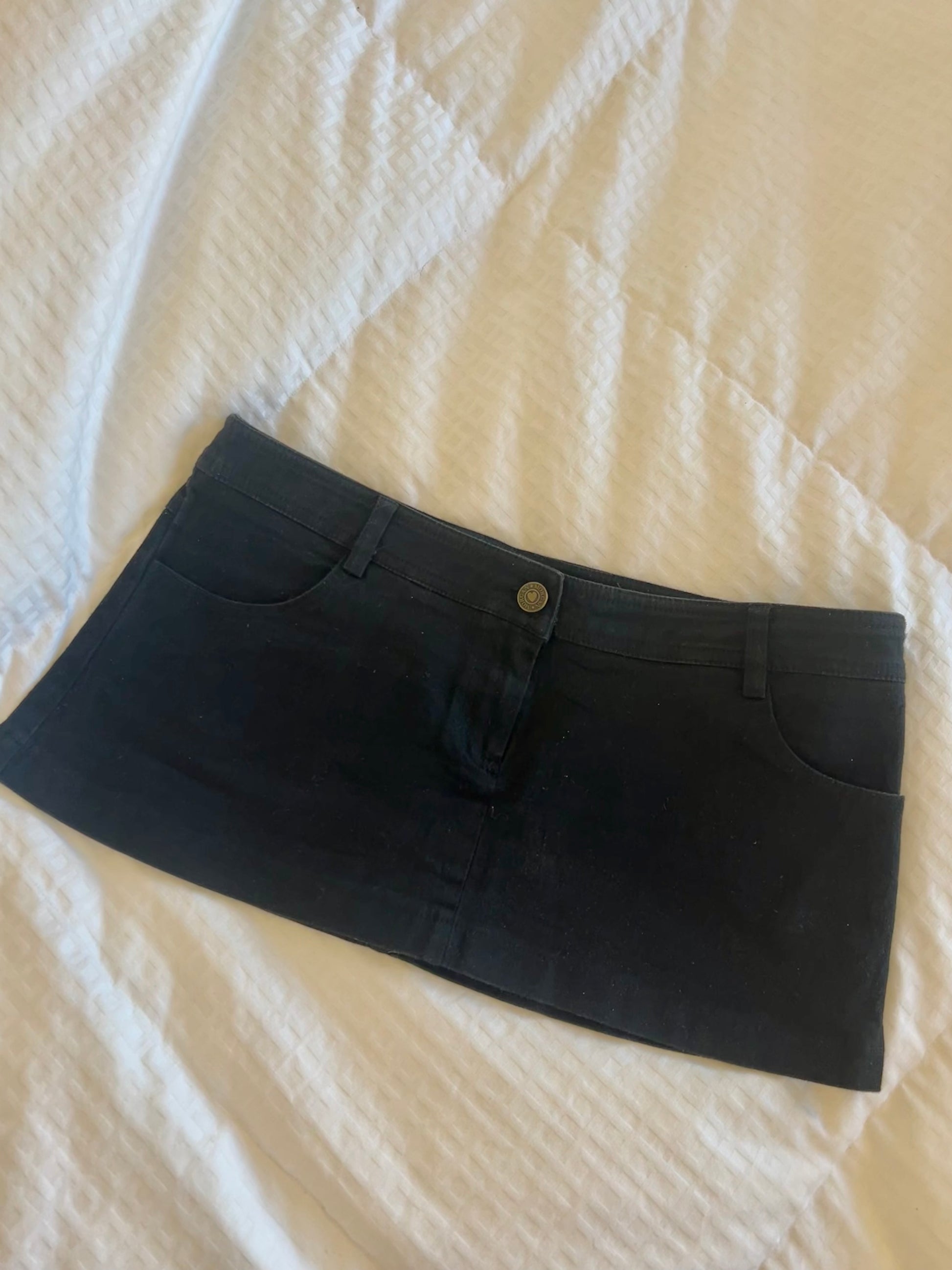 Vintage black denim low waist micro mini skirt. Zipper and button closure. Pockets in the front. Skirt has some stretch to it.