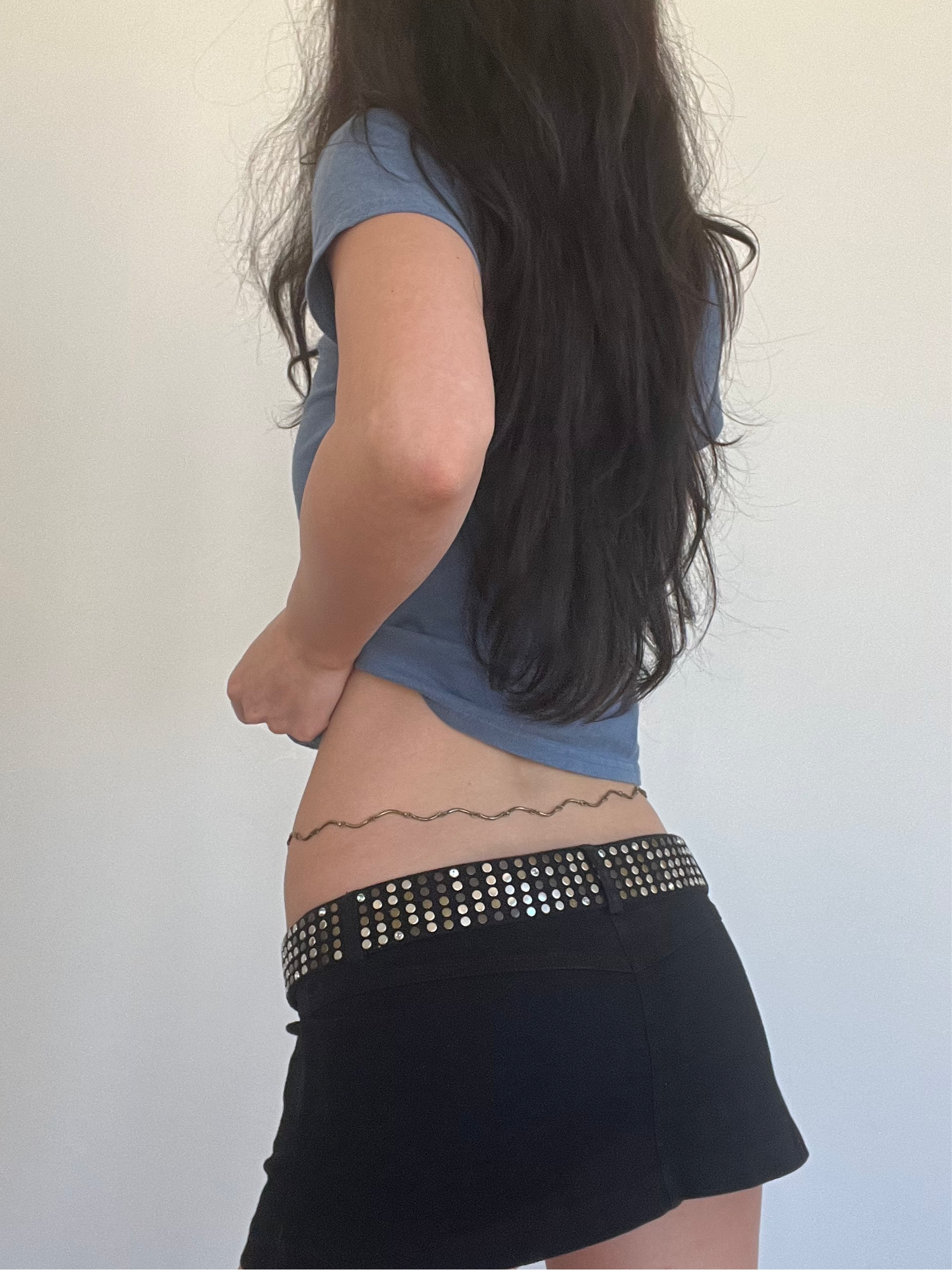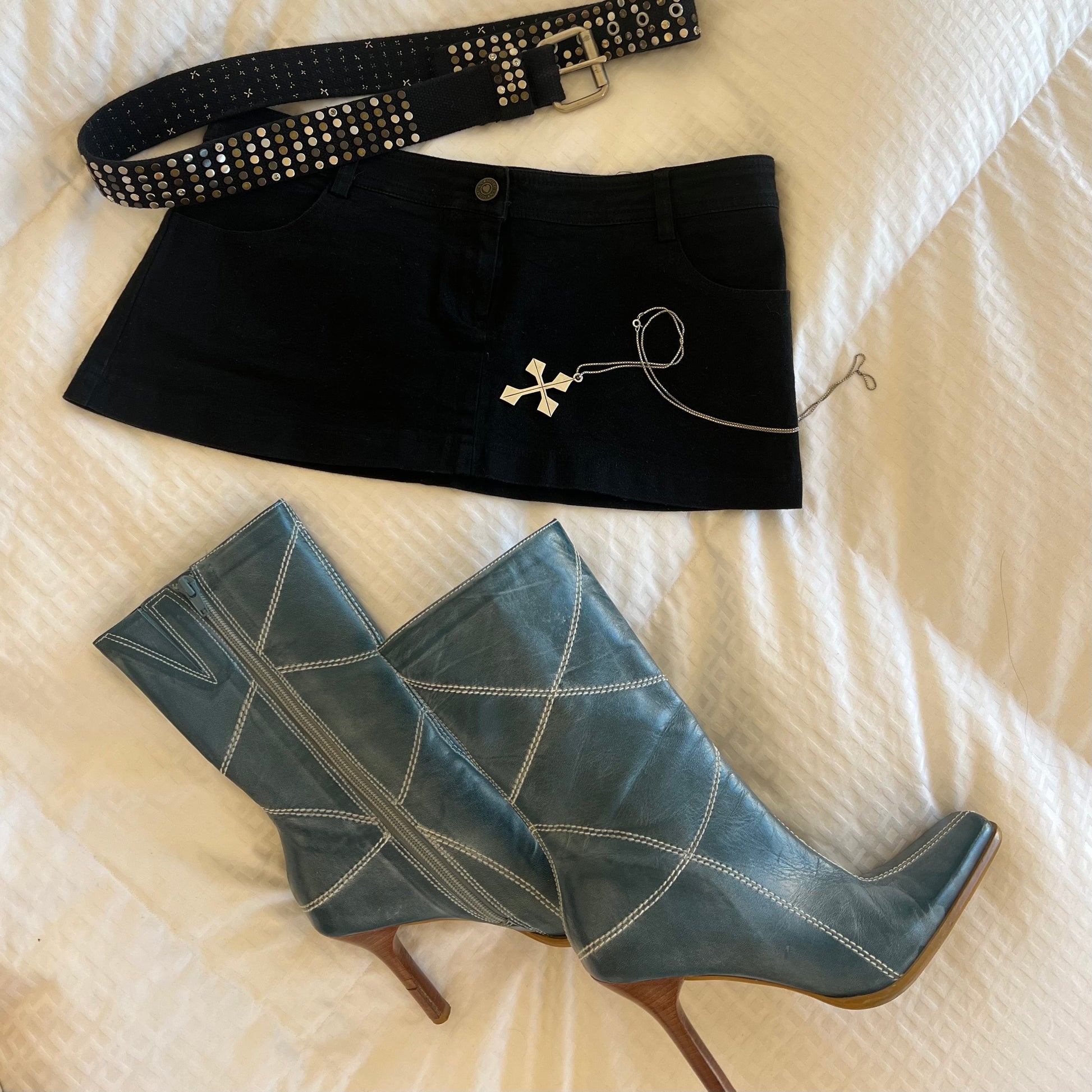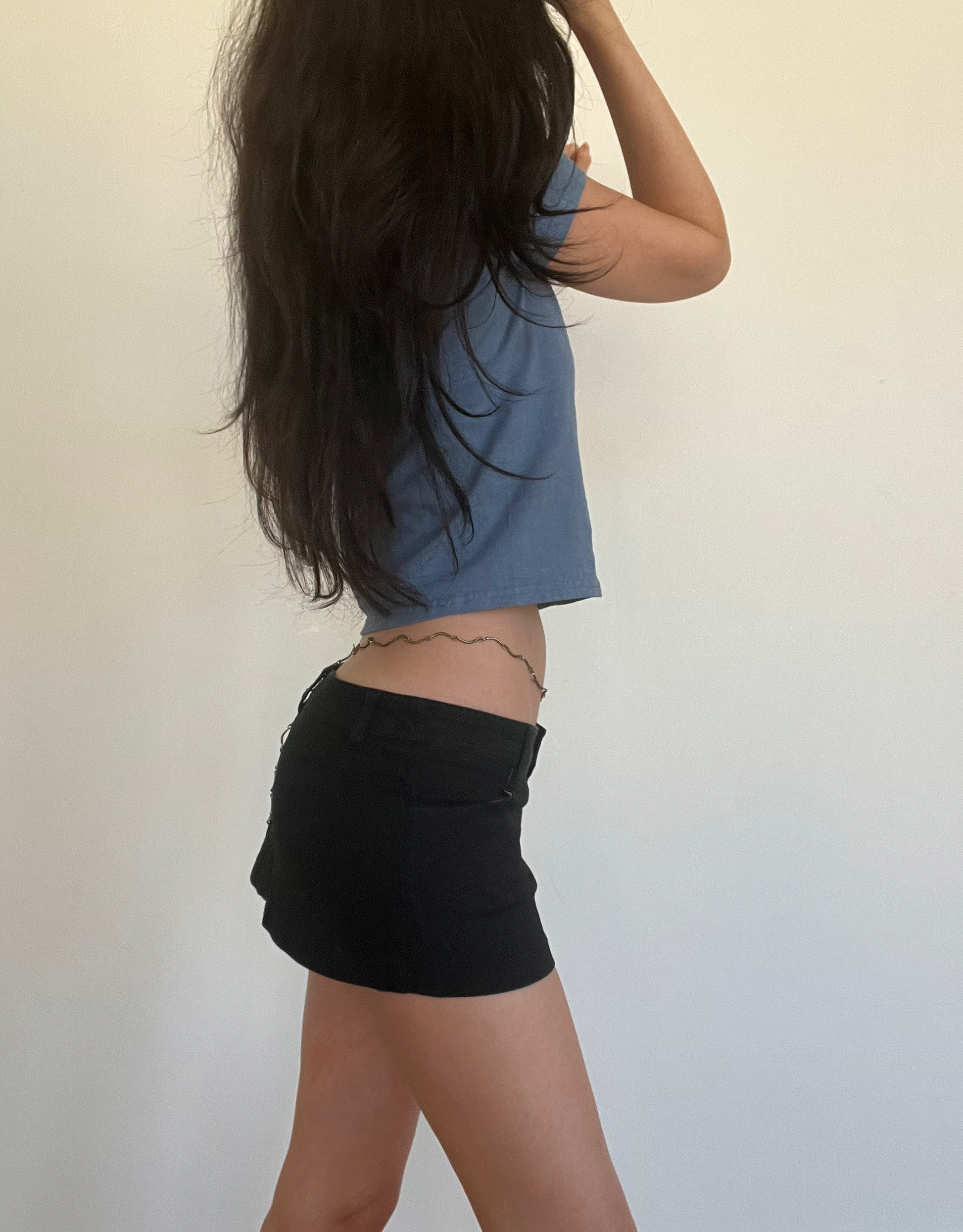 Vintage black denim low waist micro mini skirt. Zipper and button closure. Pockets in the front. Skirt has some stretch to it.