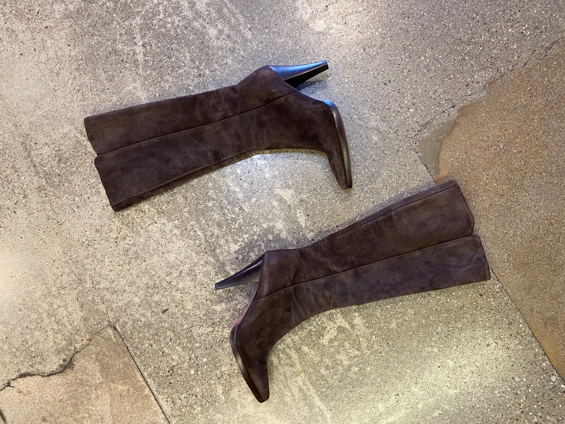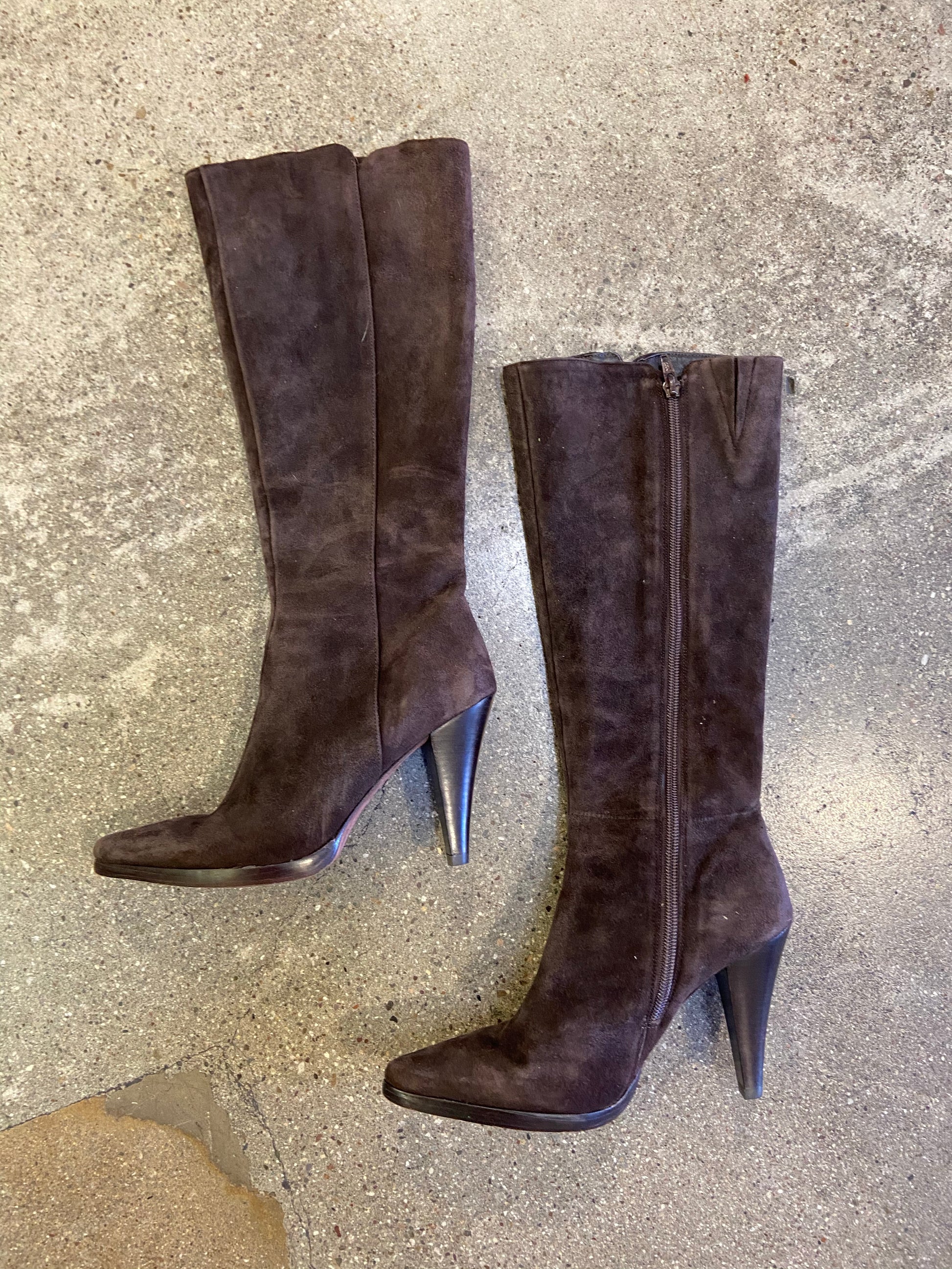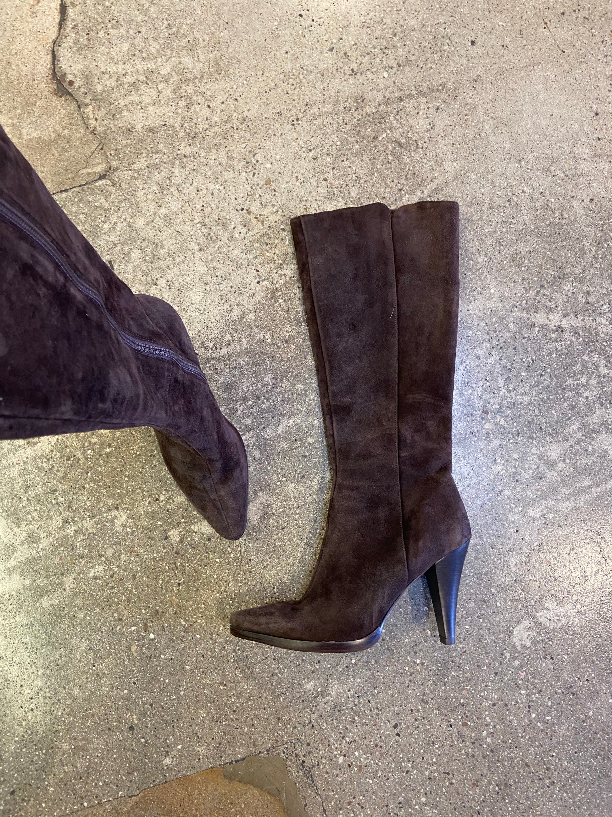 The prettiest chocolate brown suede. Below the knee, pointy toe boots.