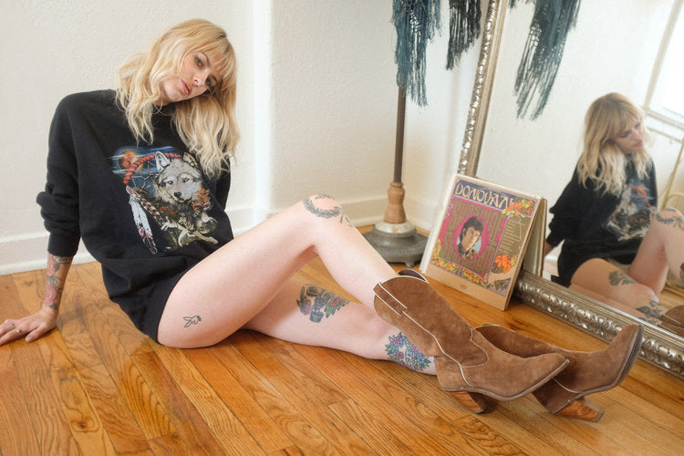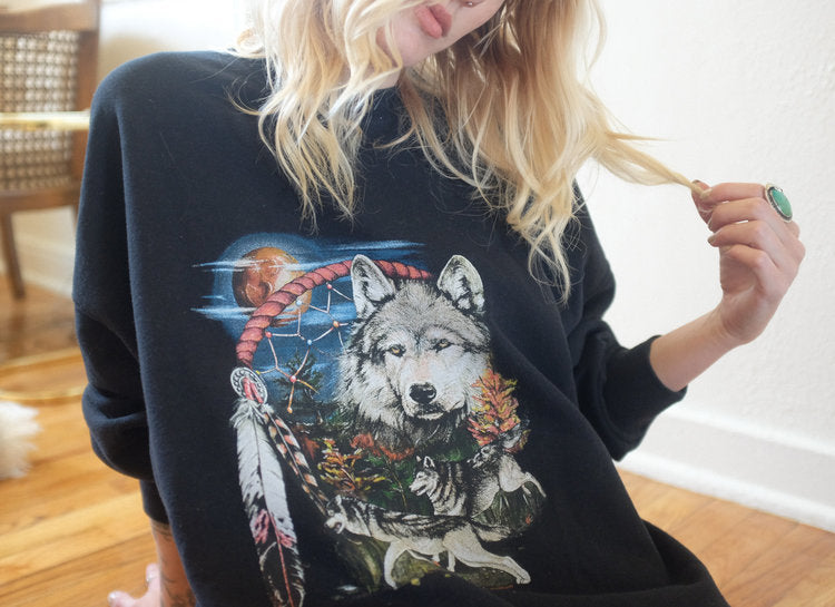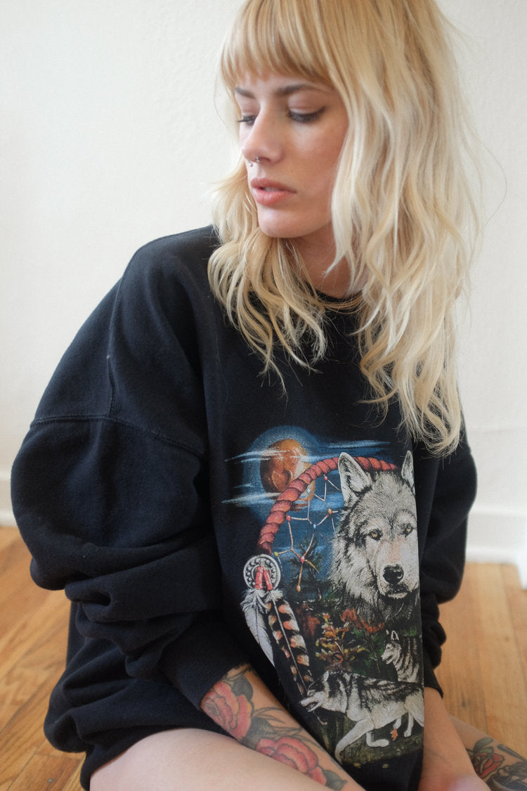 This Native Wolf pullover sweatshirt features a moon-lit dreamcatcher and wolf's head graphic. Comfy and warm, pair with cut off denim or sans pants just like our model.