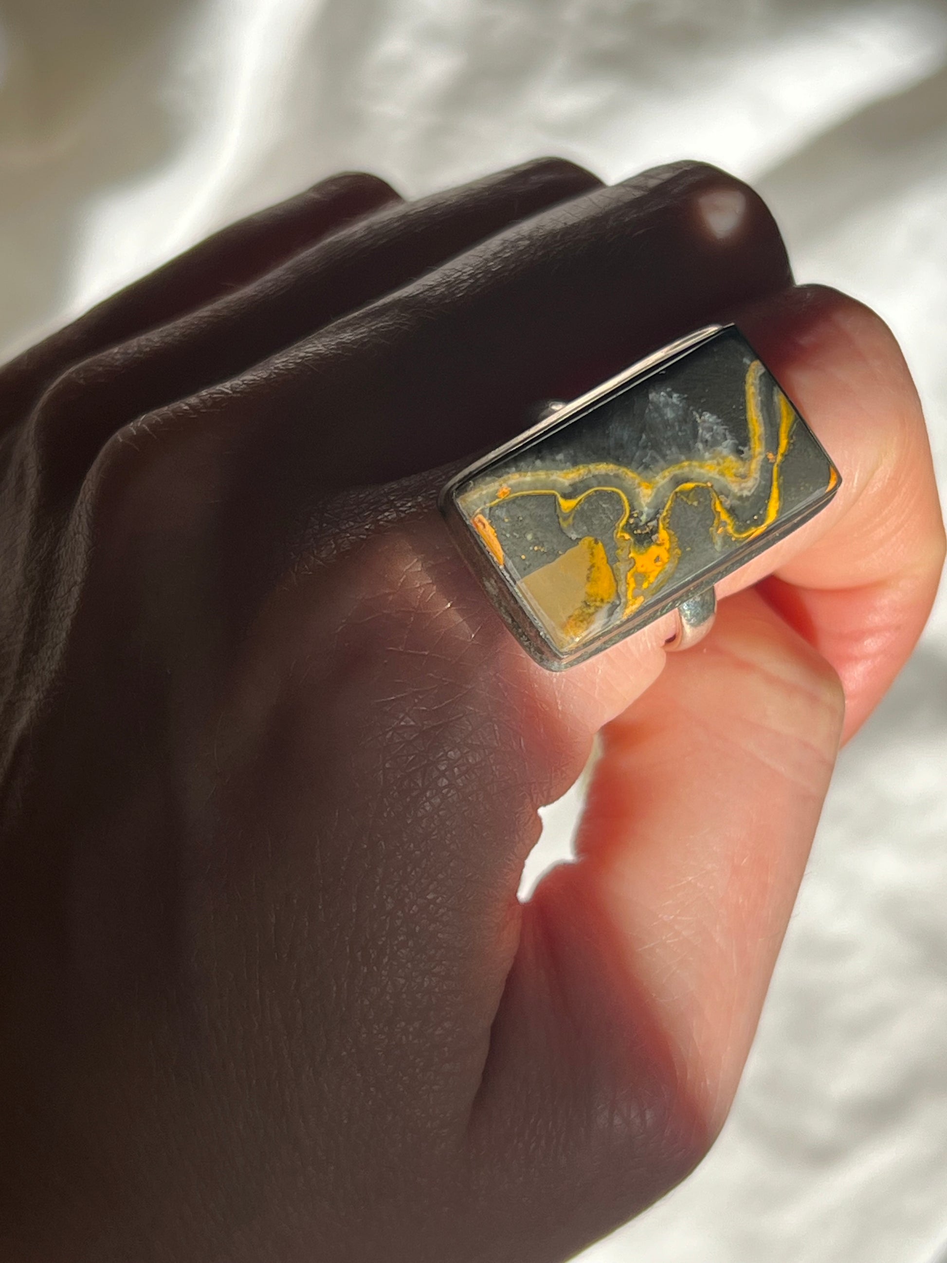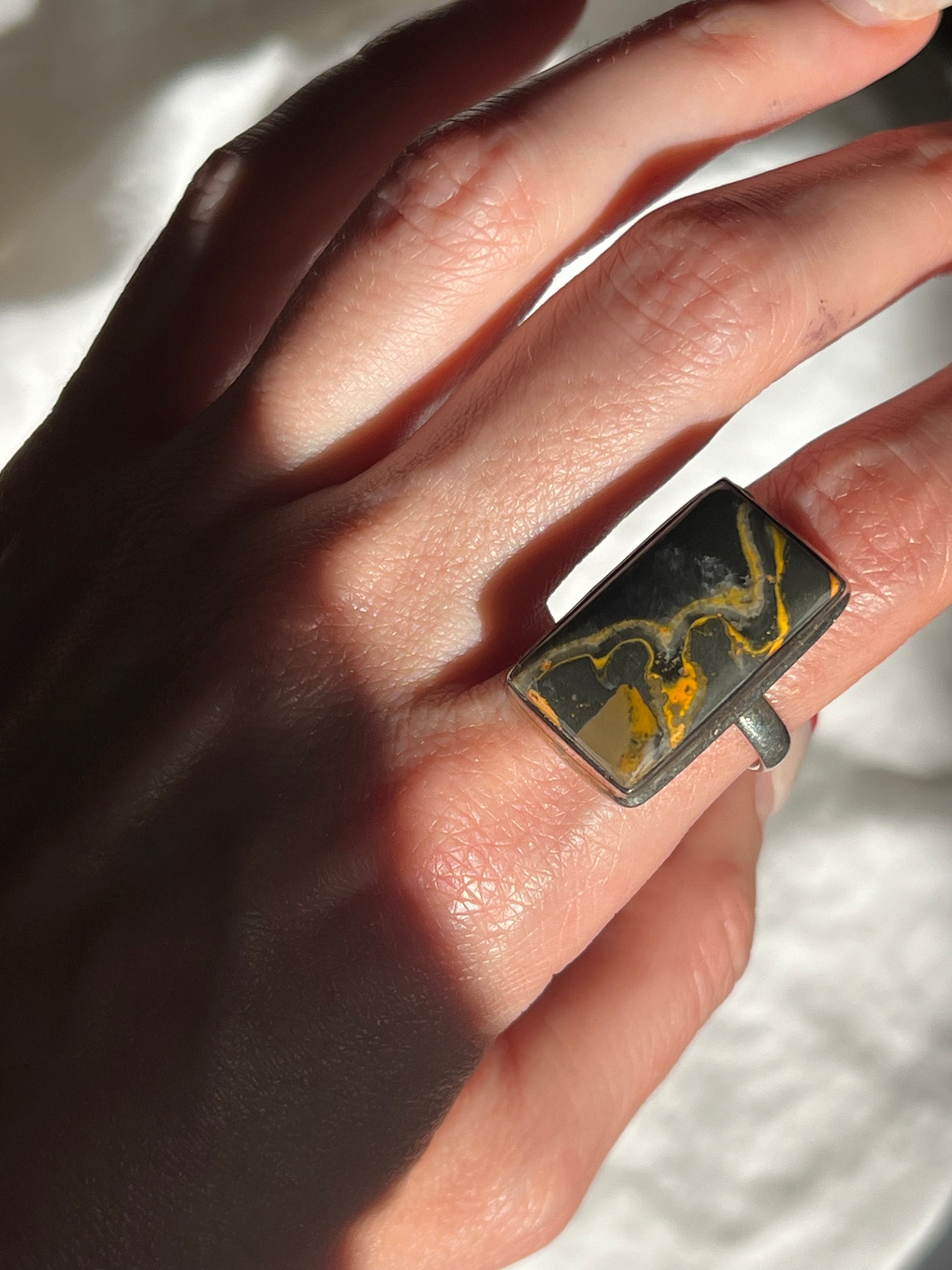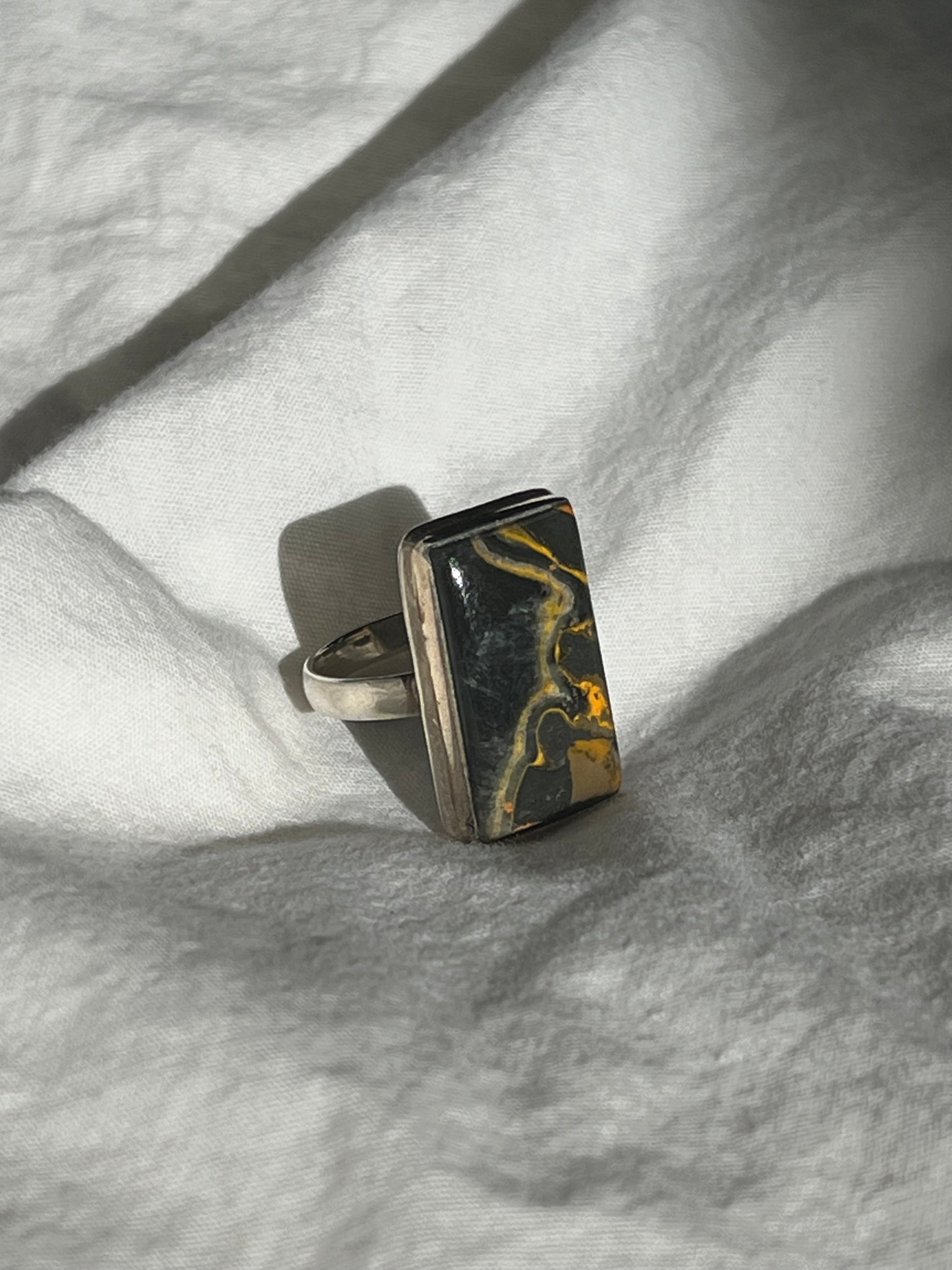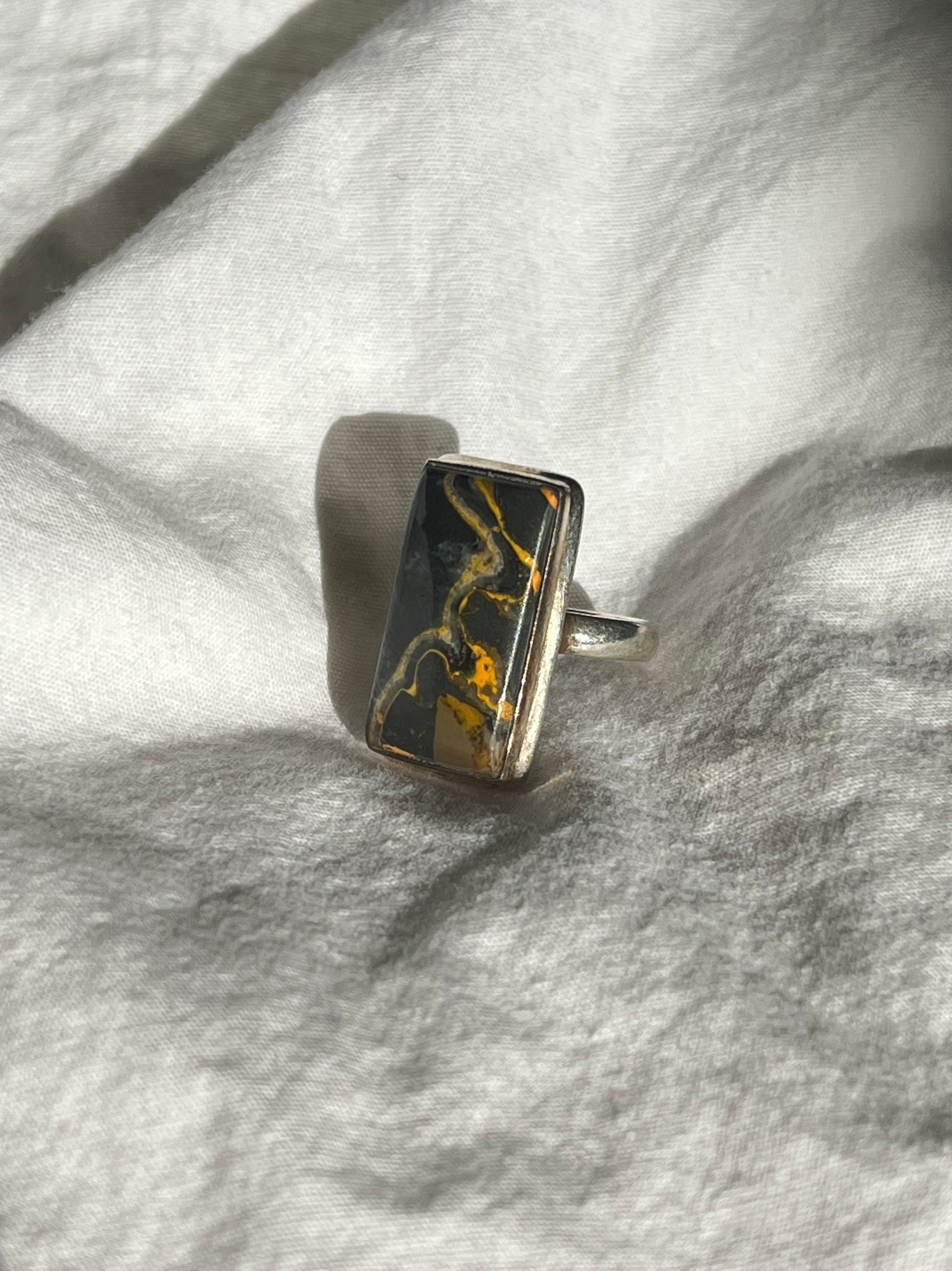 Rectangular inlaid chunky stone on a sterling silver band. This ring has a gorgeous deep green color with yellow veining.