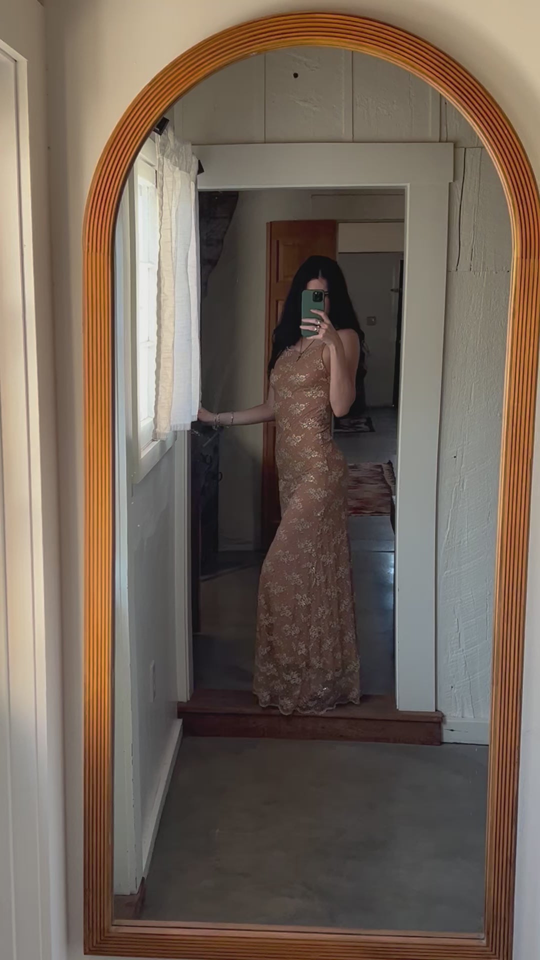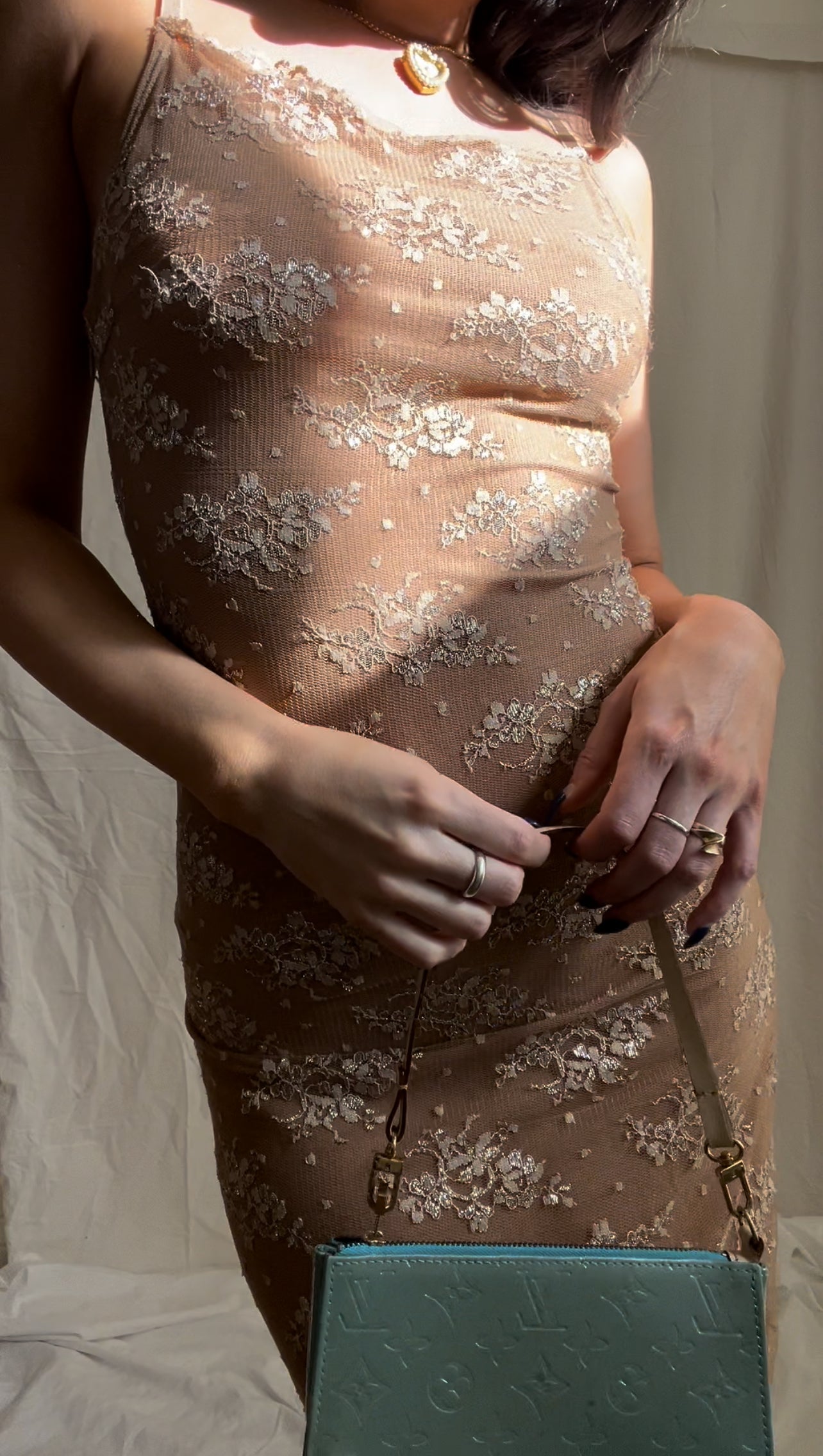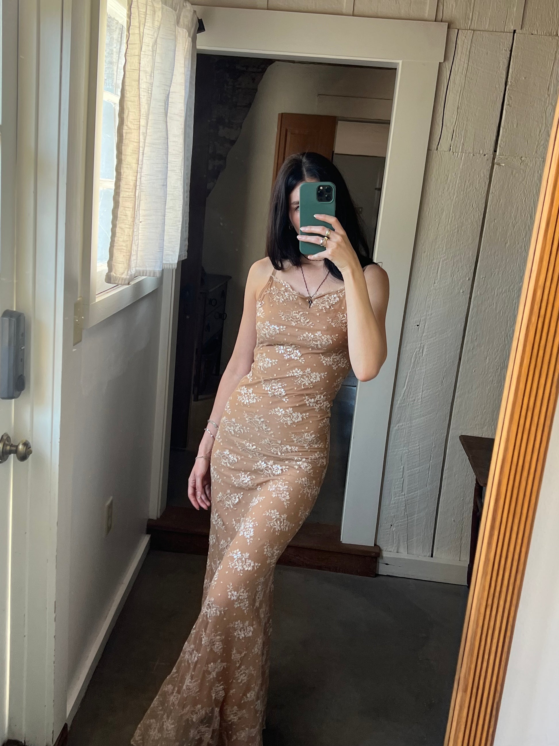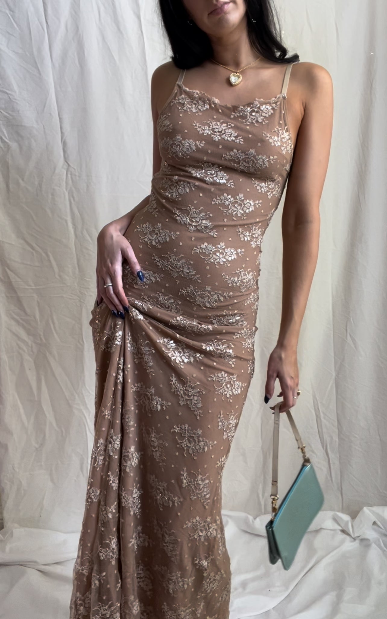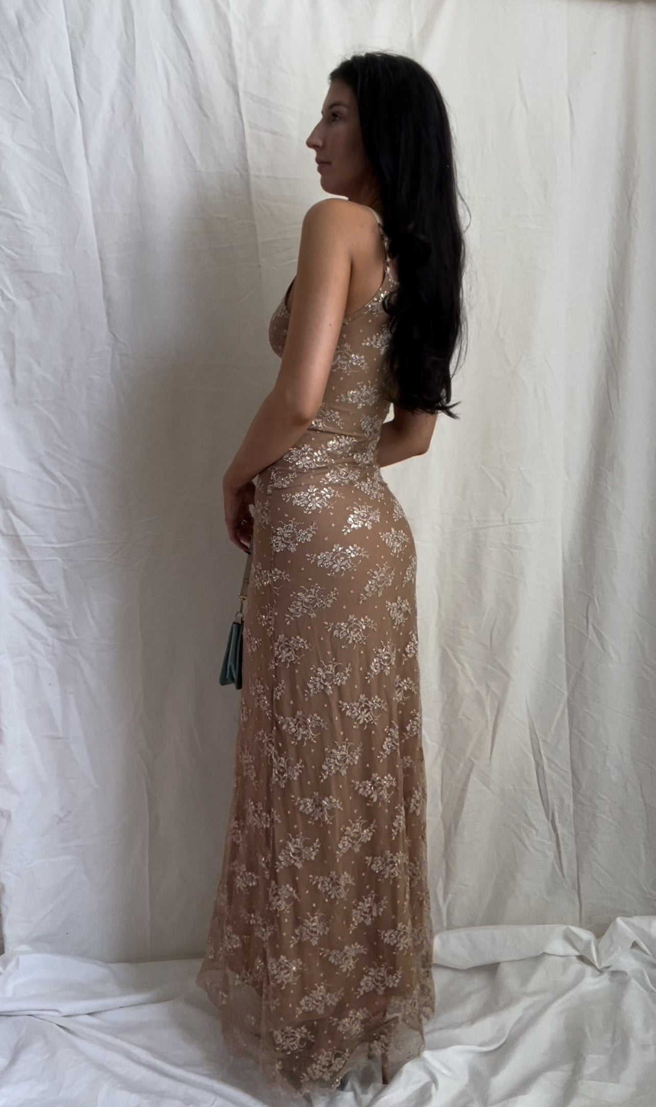 Adjustable strap, nude floor length maxi dress with netted shimmering floral lace lining. A stunning vintage dress, perfect for a holiday bash, wedding or celebration.