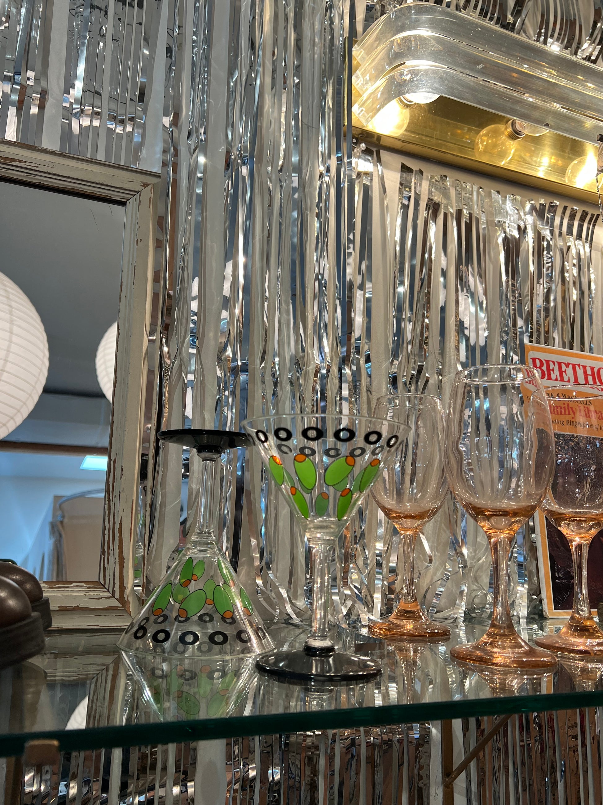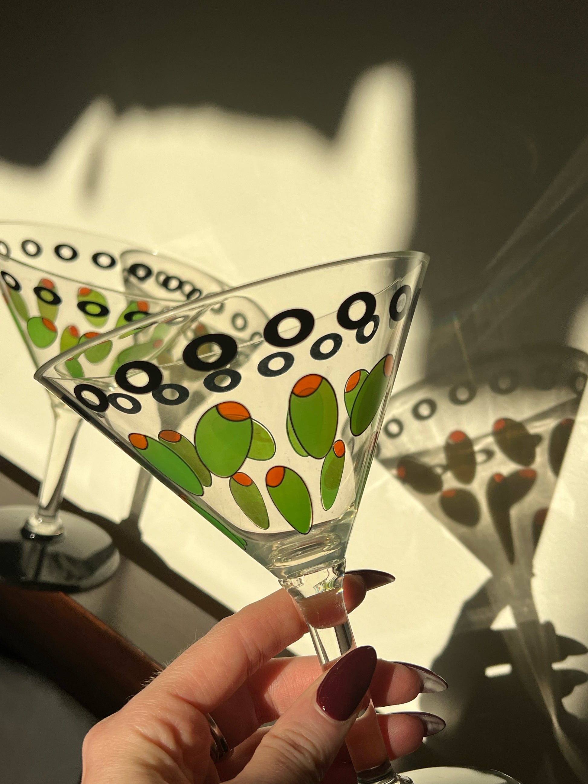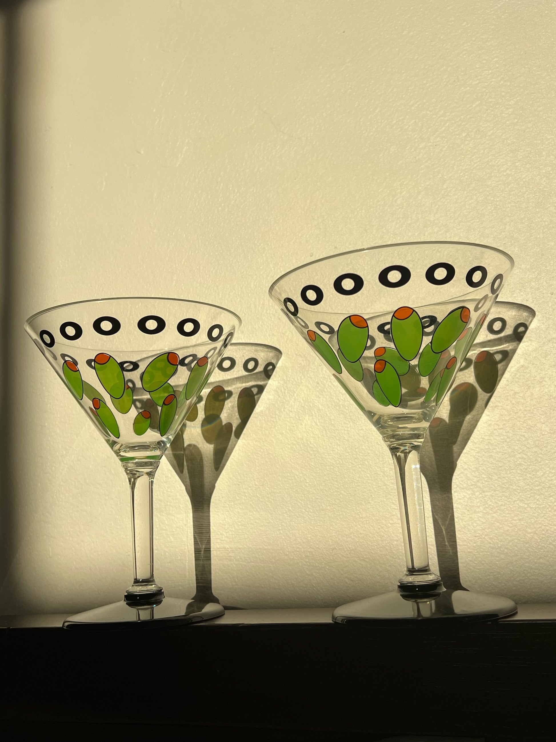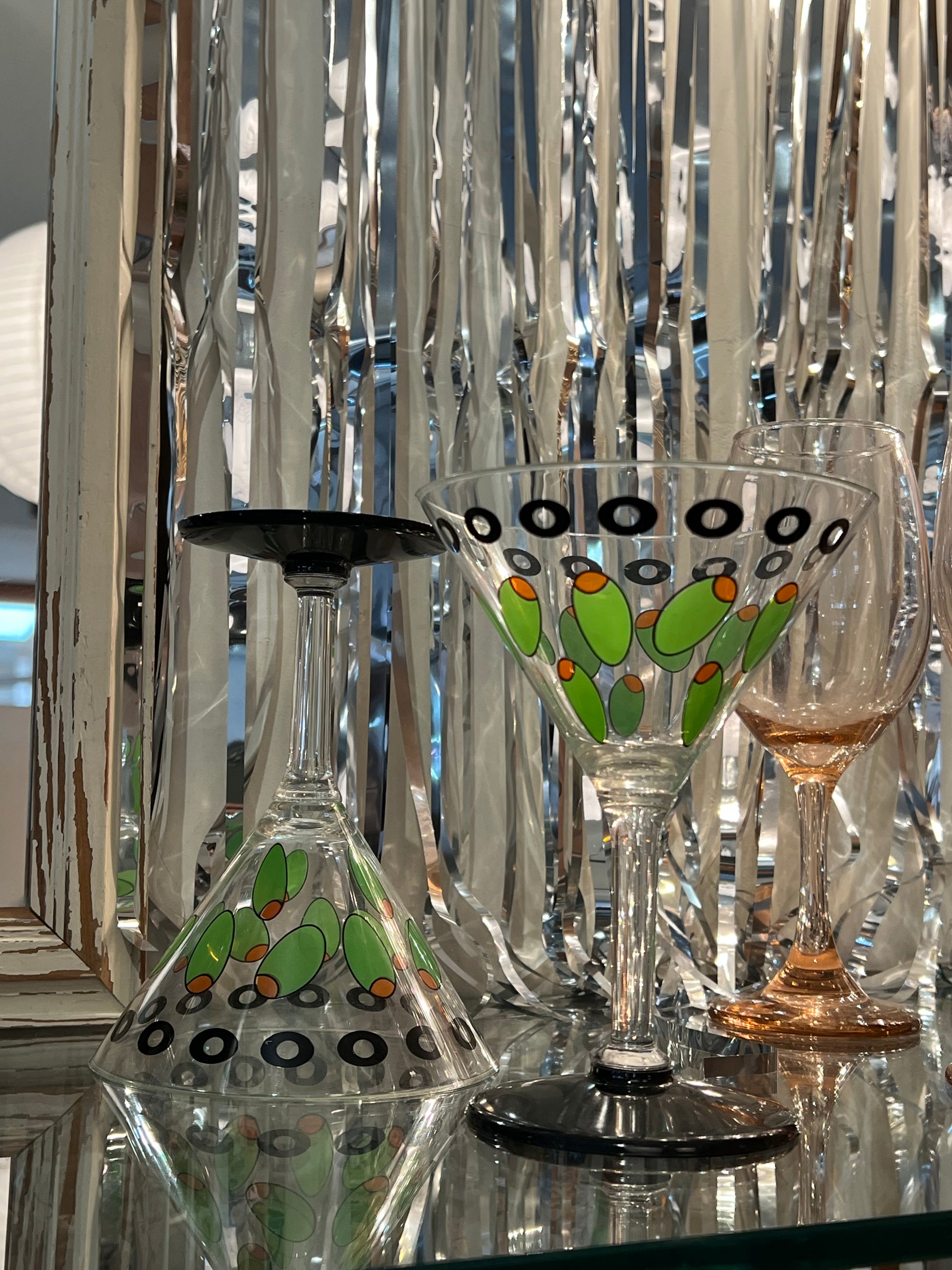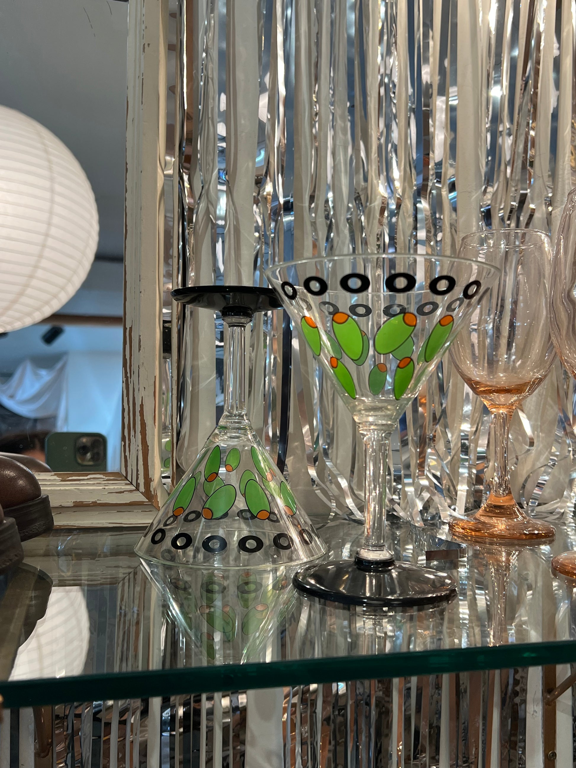 Adorable black accent and green olive pair of plastic martini glasses. Super convincing because they look like glass, these are a perfect party favor because they won’t break if you throw them at anyone.