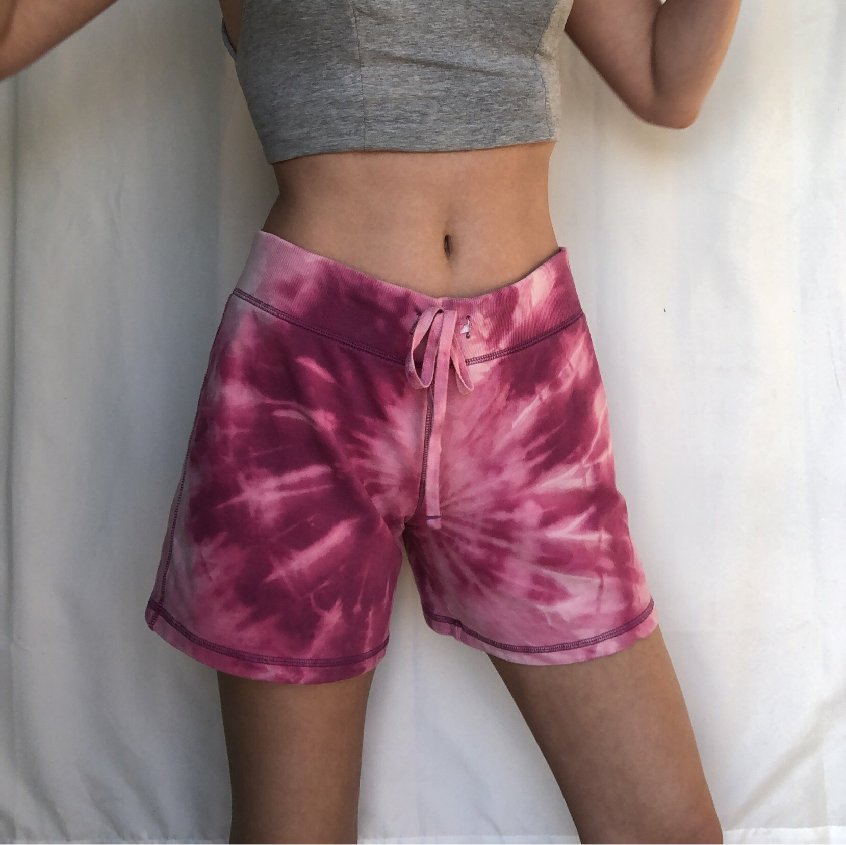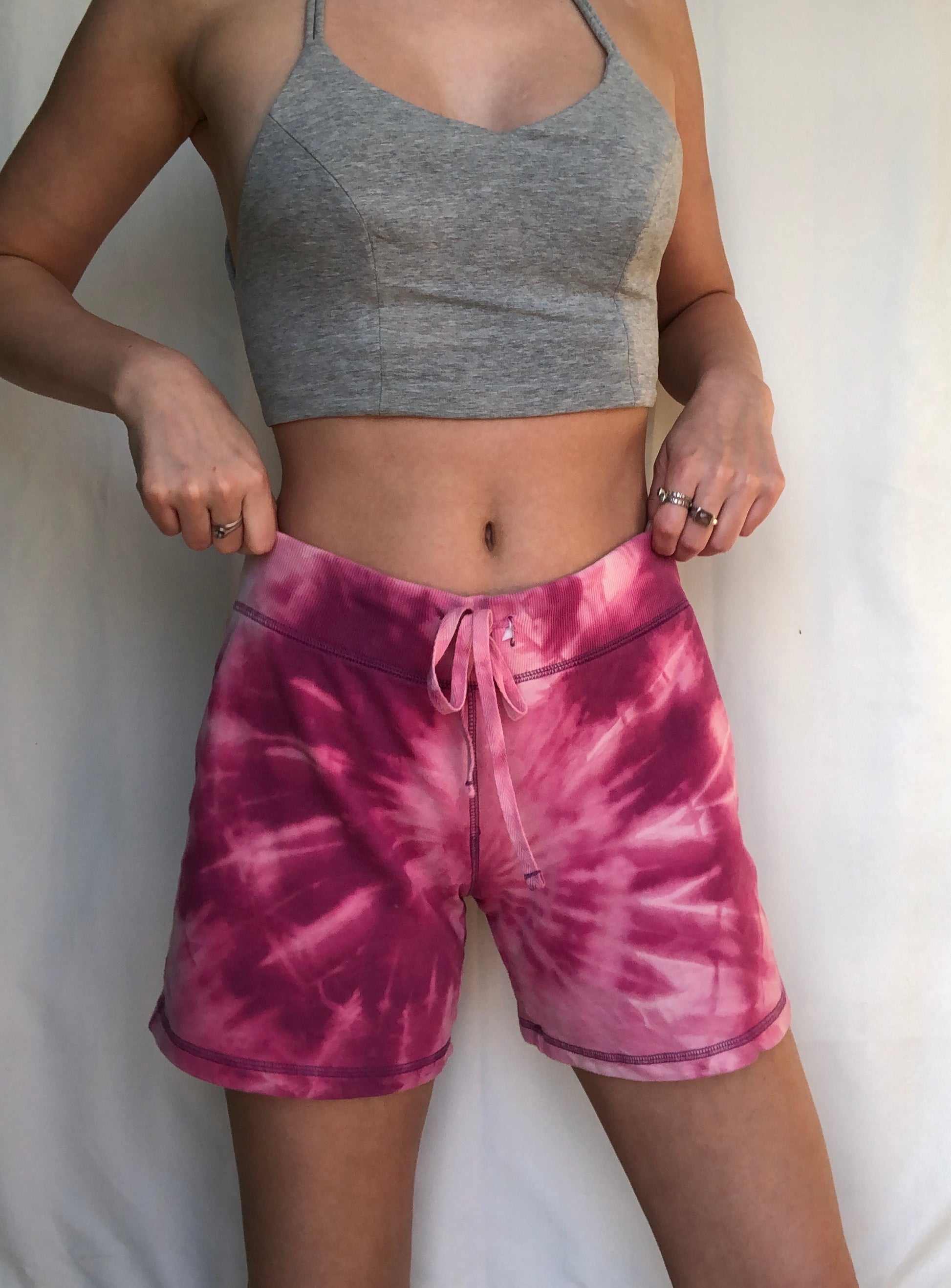 Pink string tie bleach dyed shorts. Drawstring closure, in good vintage condition.