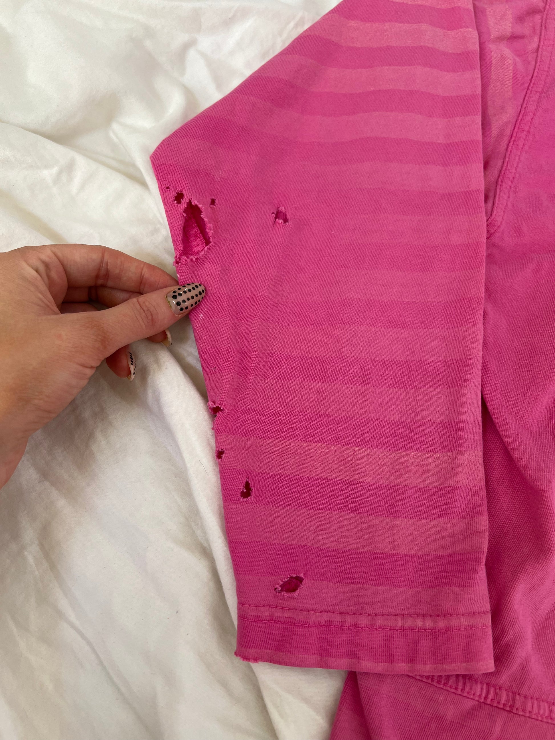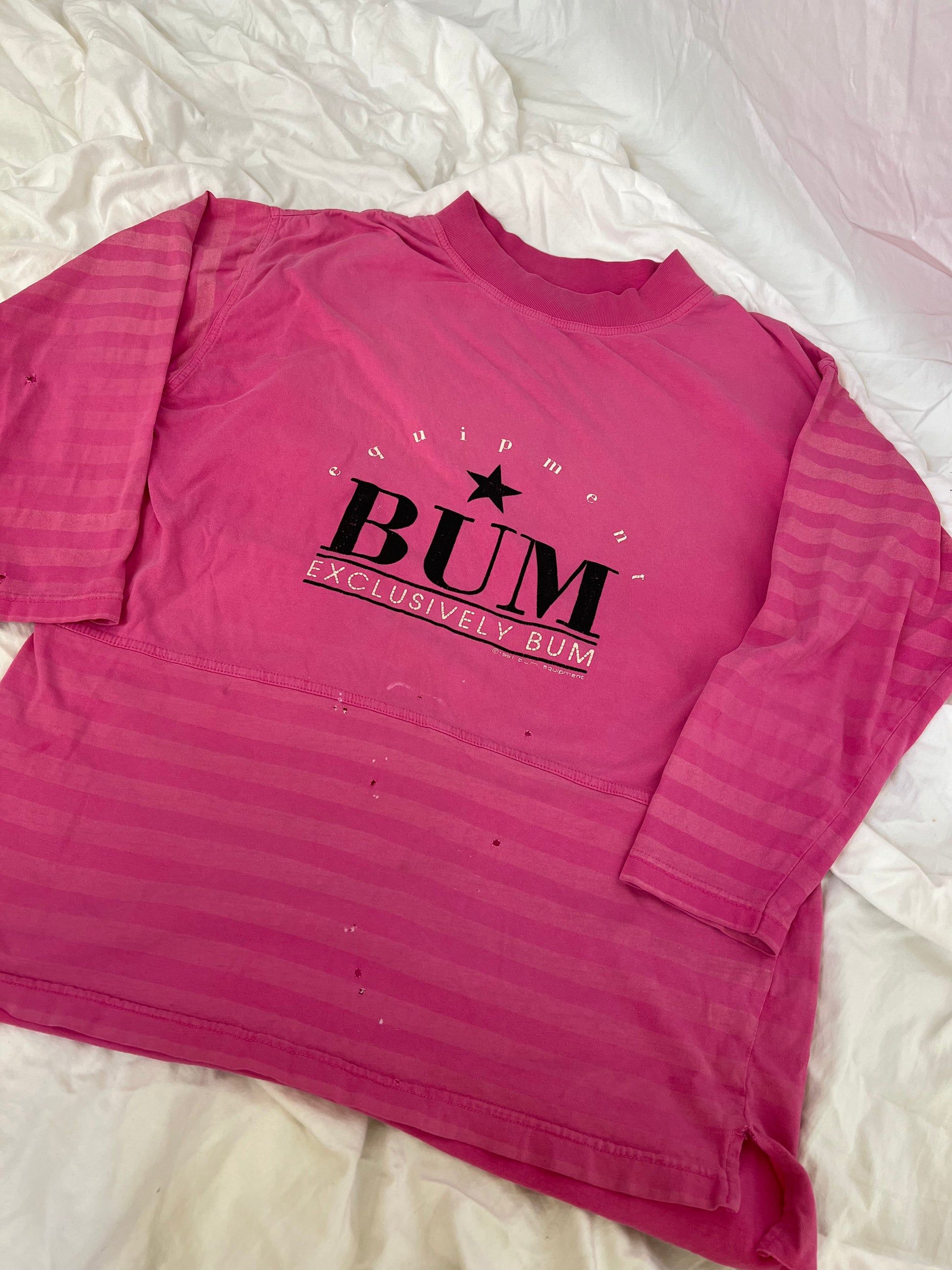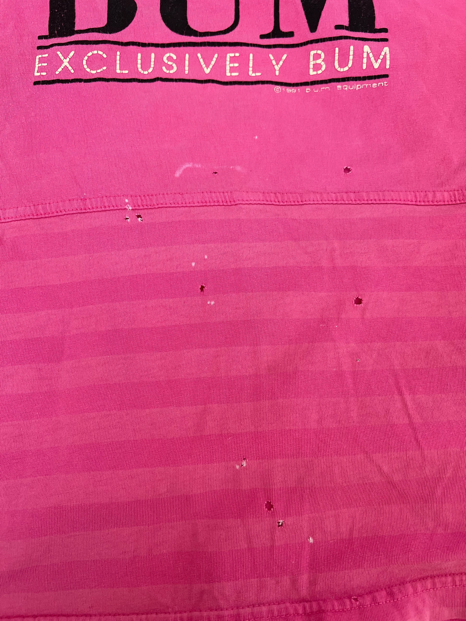 Vintage 1991 single stitch quarter sleeve BUM Equipment top. She is the perfect pop of pink. With a faded stripe pattern, distressed holes from natural wear, this top is the ultimate relaxed vintage piece to pair with your shorts or bikini this summer.