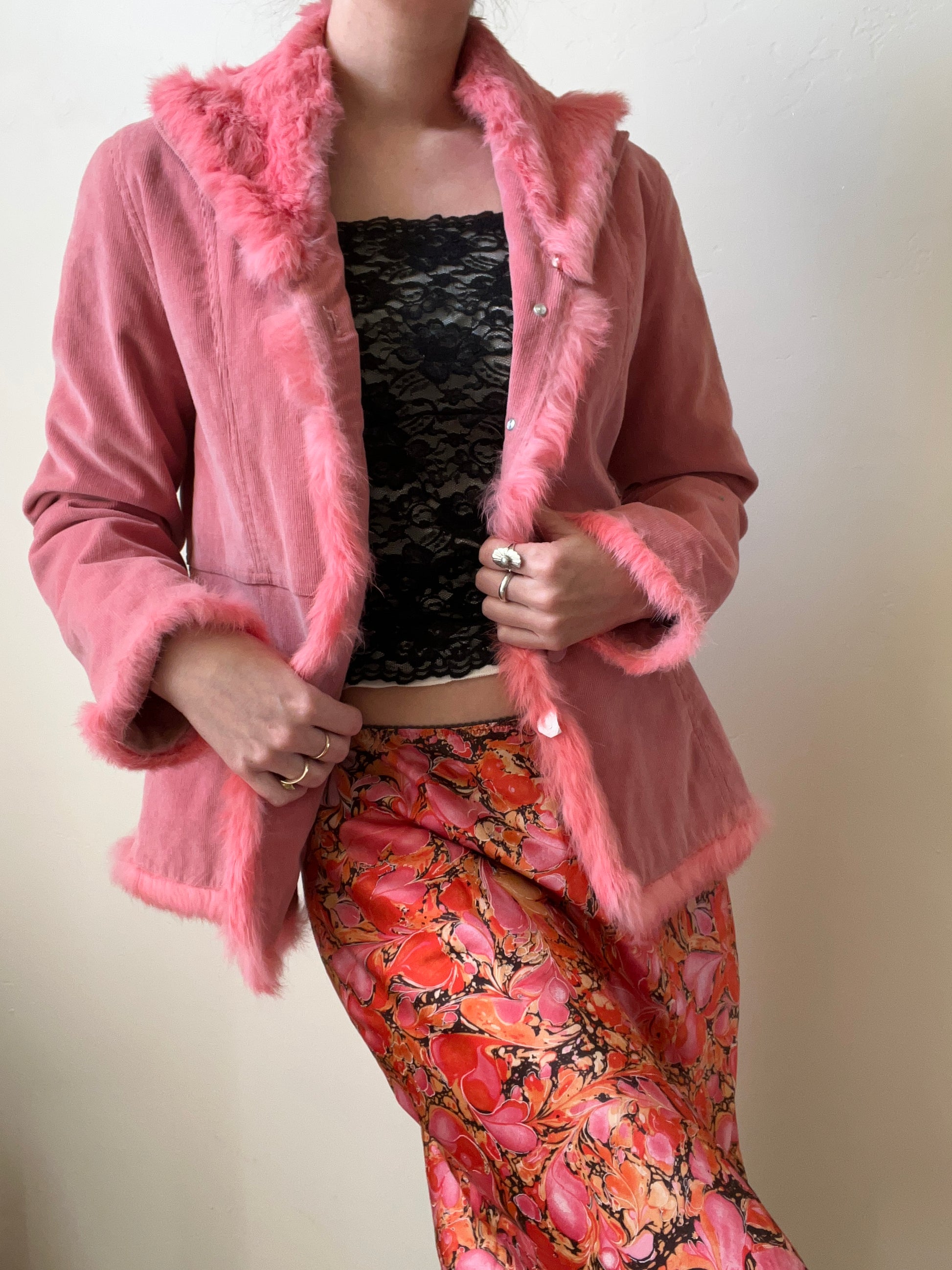 Vintage pink corduroy button front jacket with fur trim and removable fur collar…. I believe it is faux fur but this item was thrifted and has no tag with the material on it so can’t be sure!!