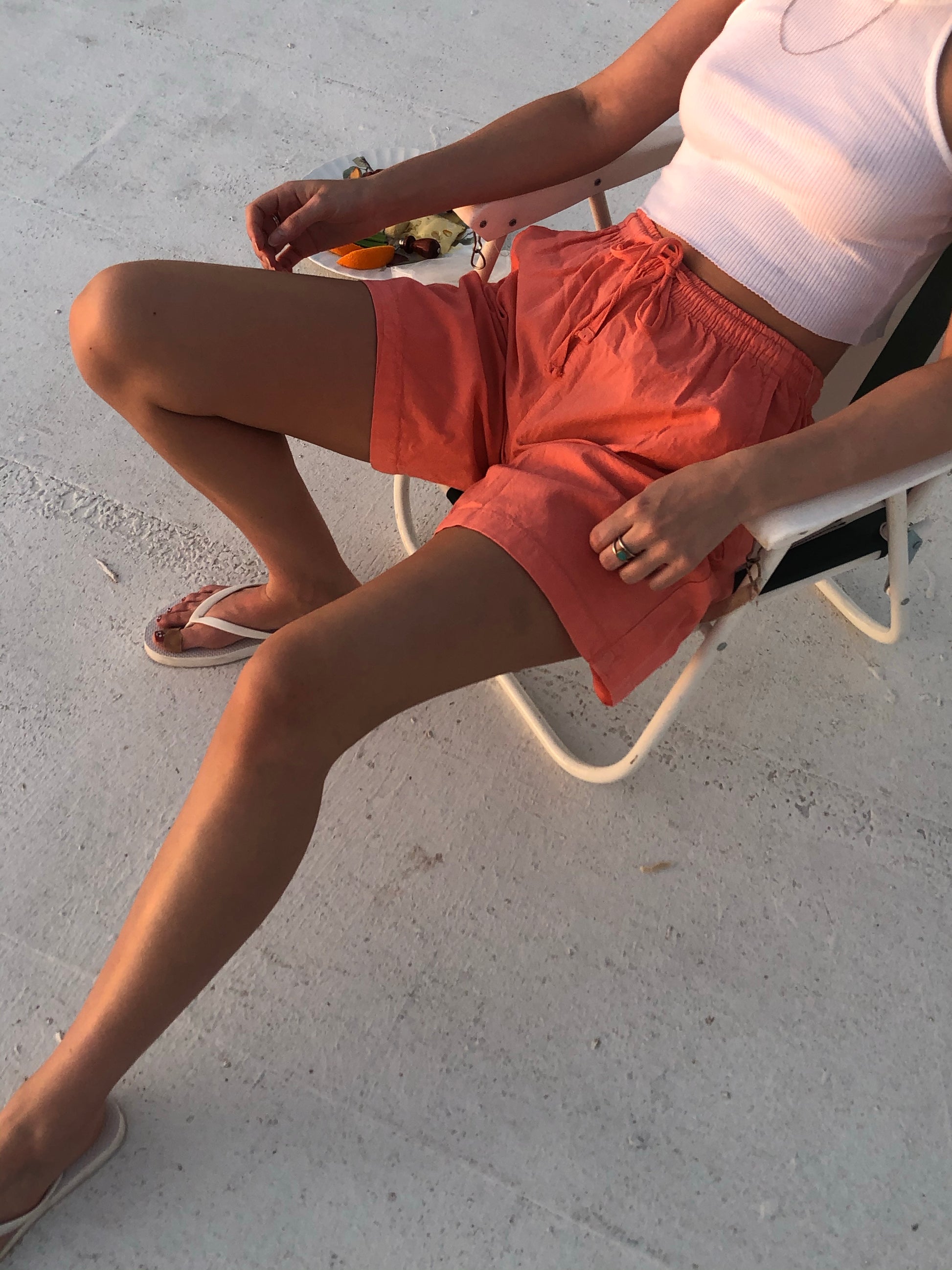 Deadstock vintage with tags still attached. High waisted elastic waistband with drawstring tie front. Long cotton coral shorts that are so effortlessly perfect for hot weather