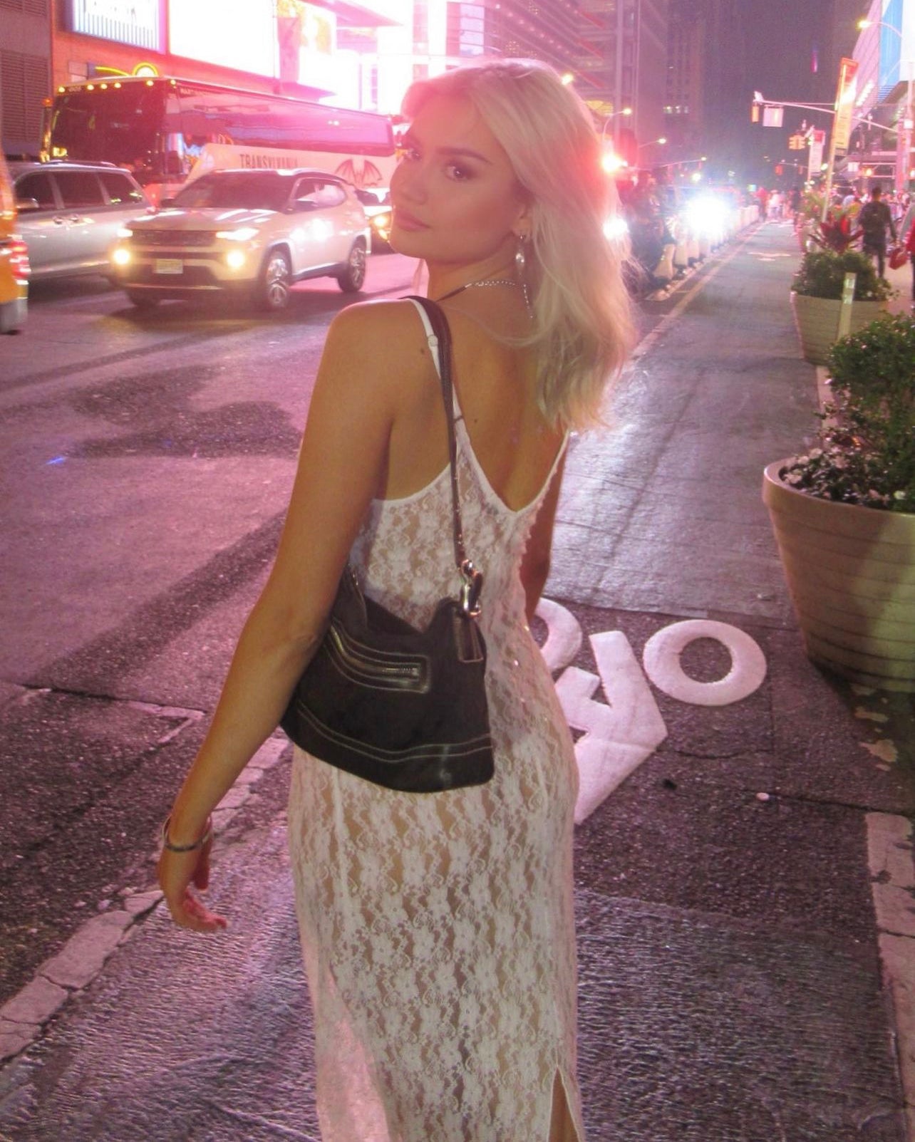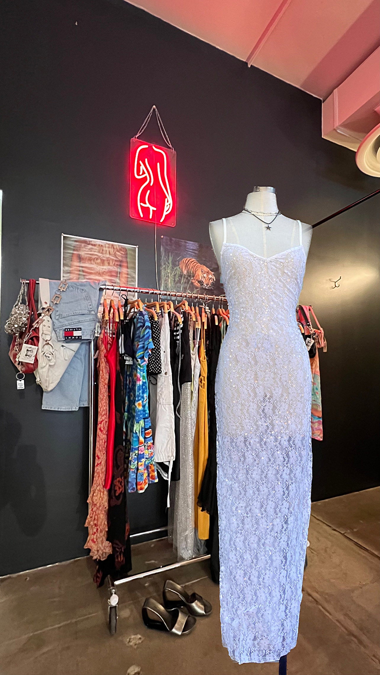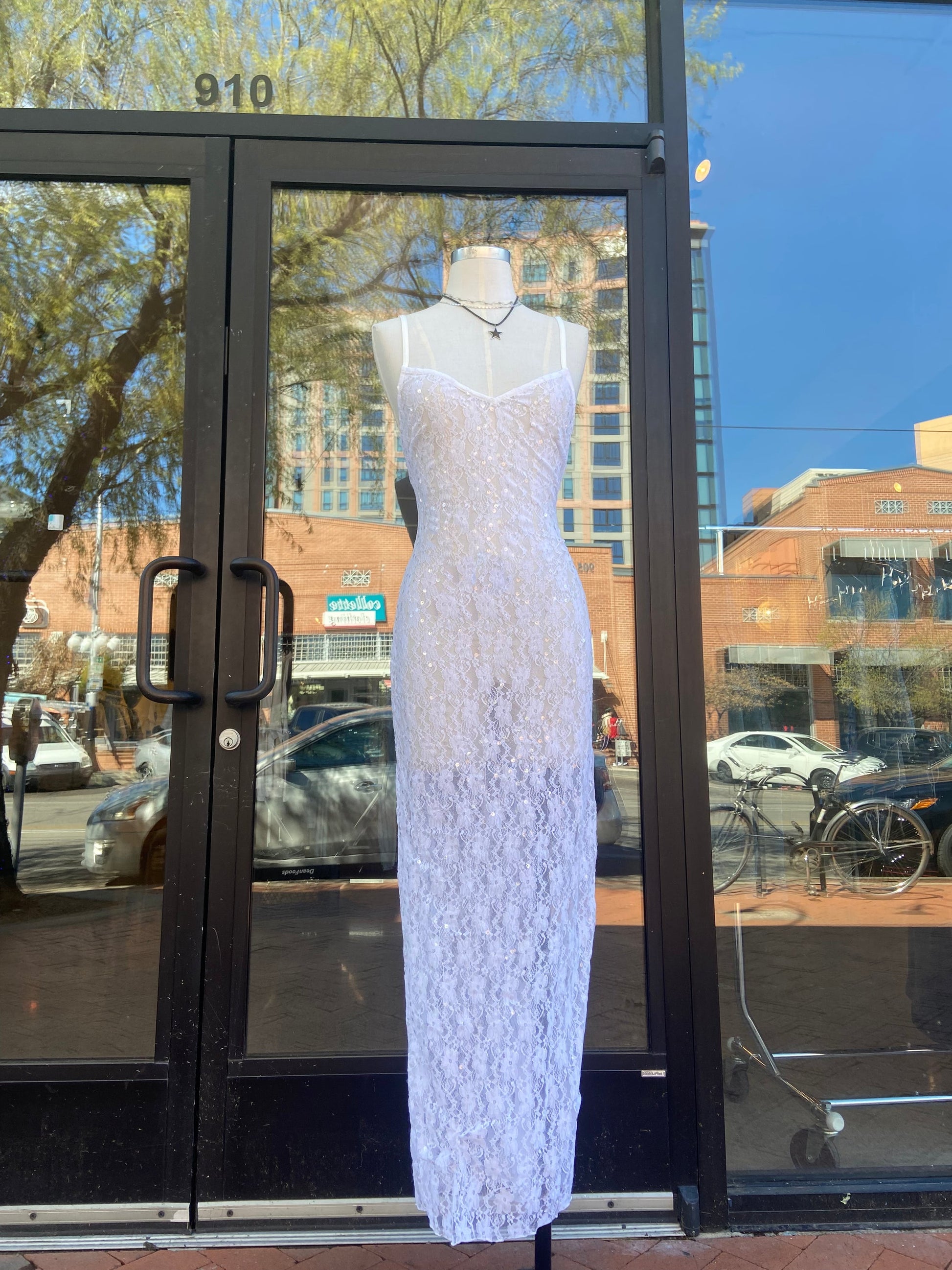 Amazing sheer floral lace maxi dress with spaghetti straps and iridescent sequins detail.