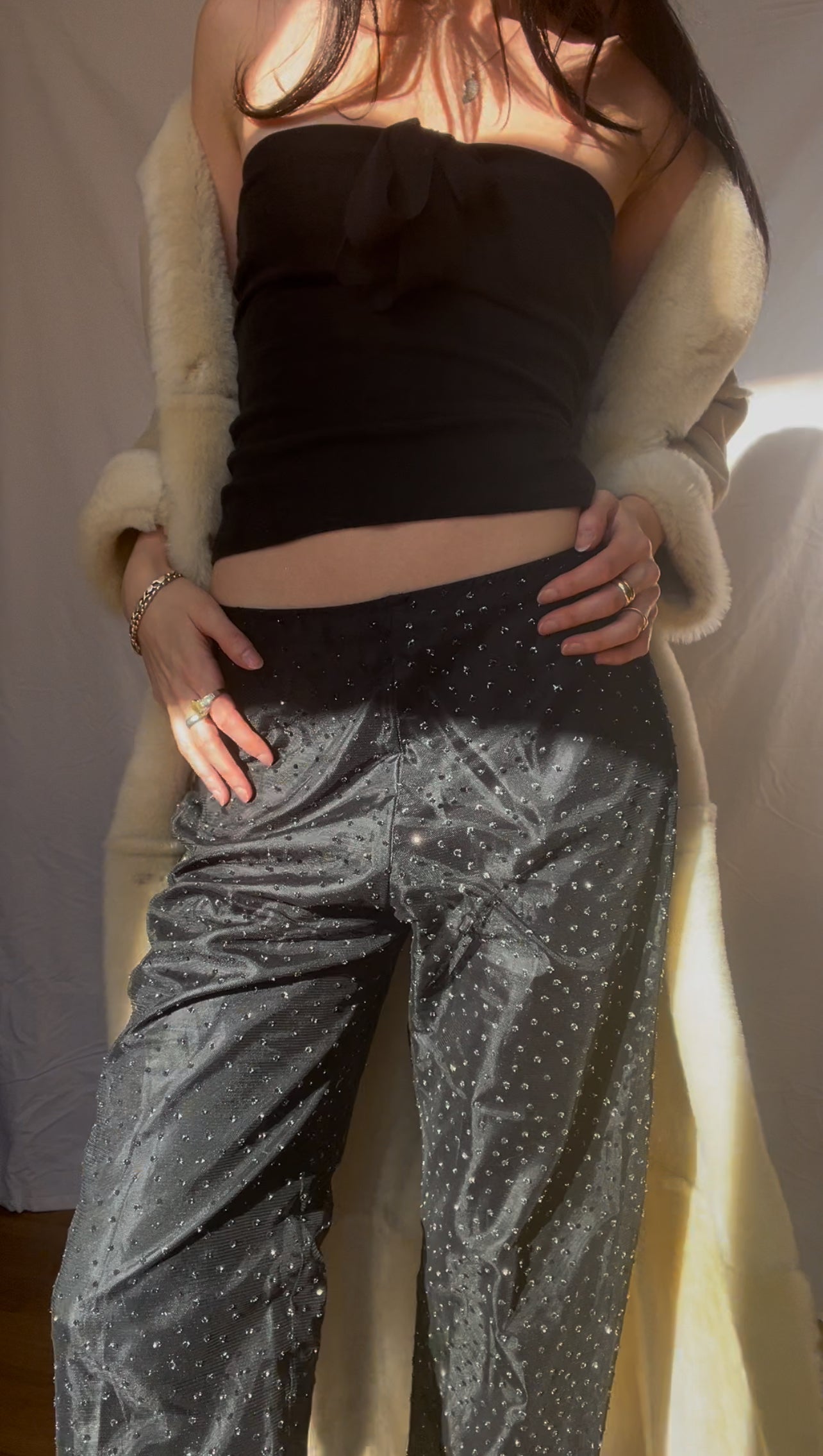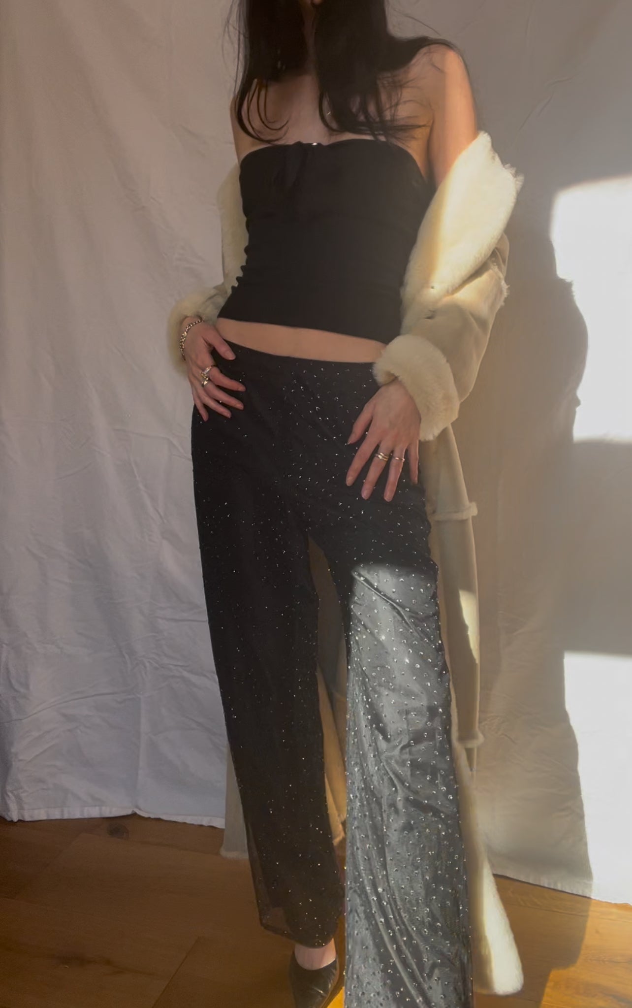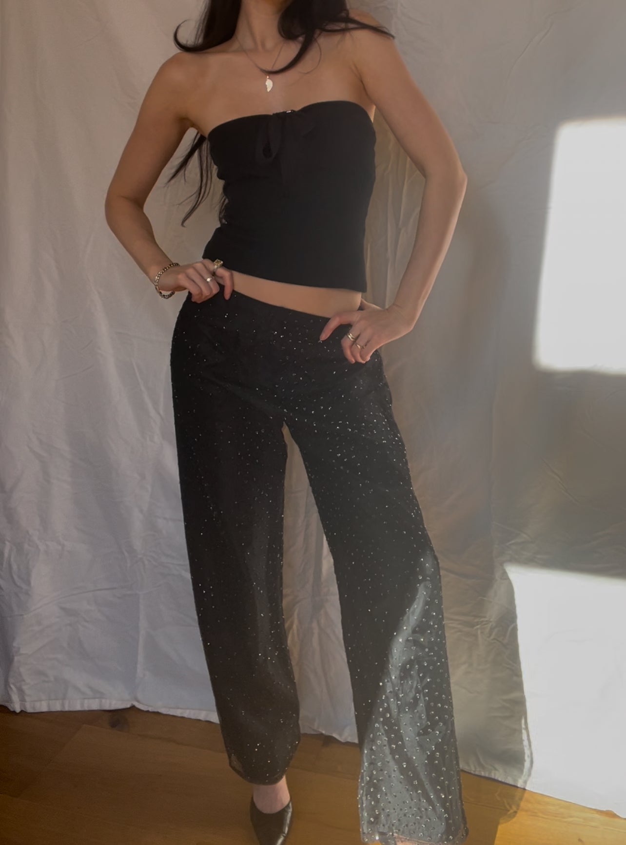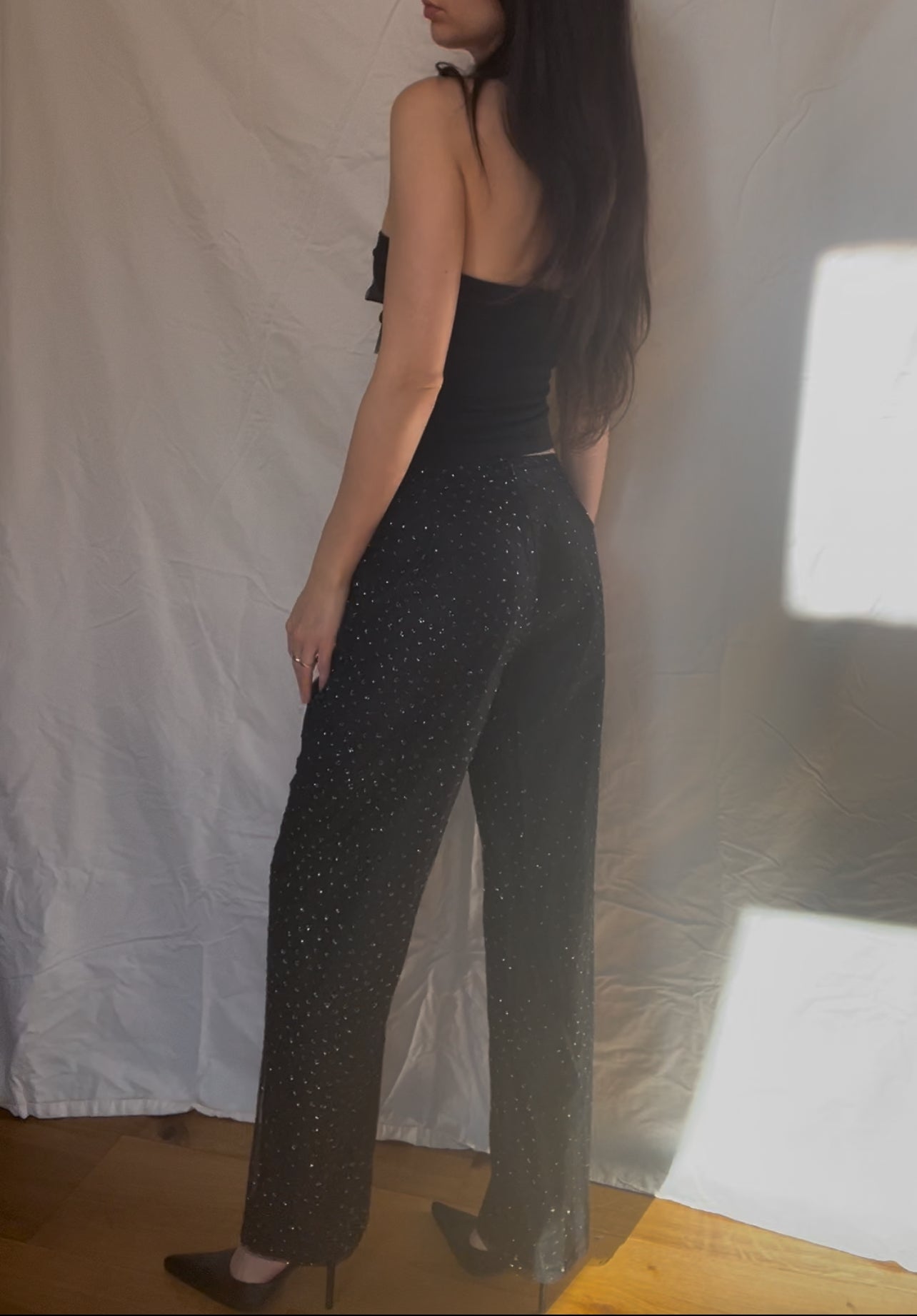 Vintage black straight leg trouser pants with back zip closure netted with glitter dots! So cute for holiday parties and New Year's Eve!
