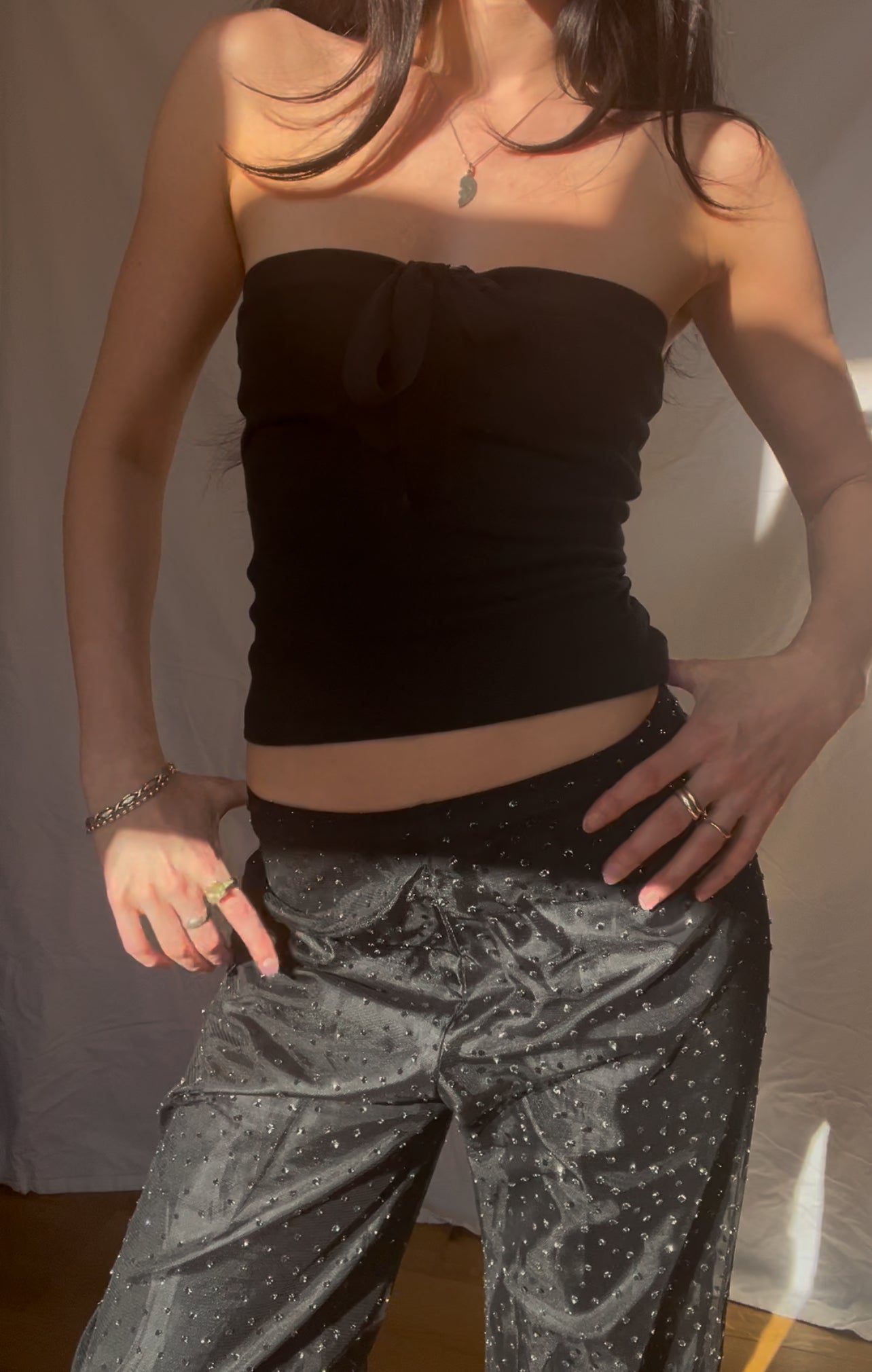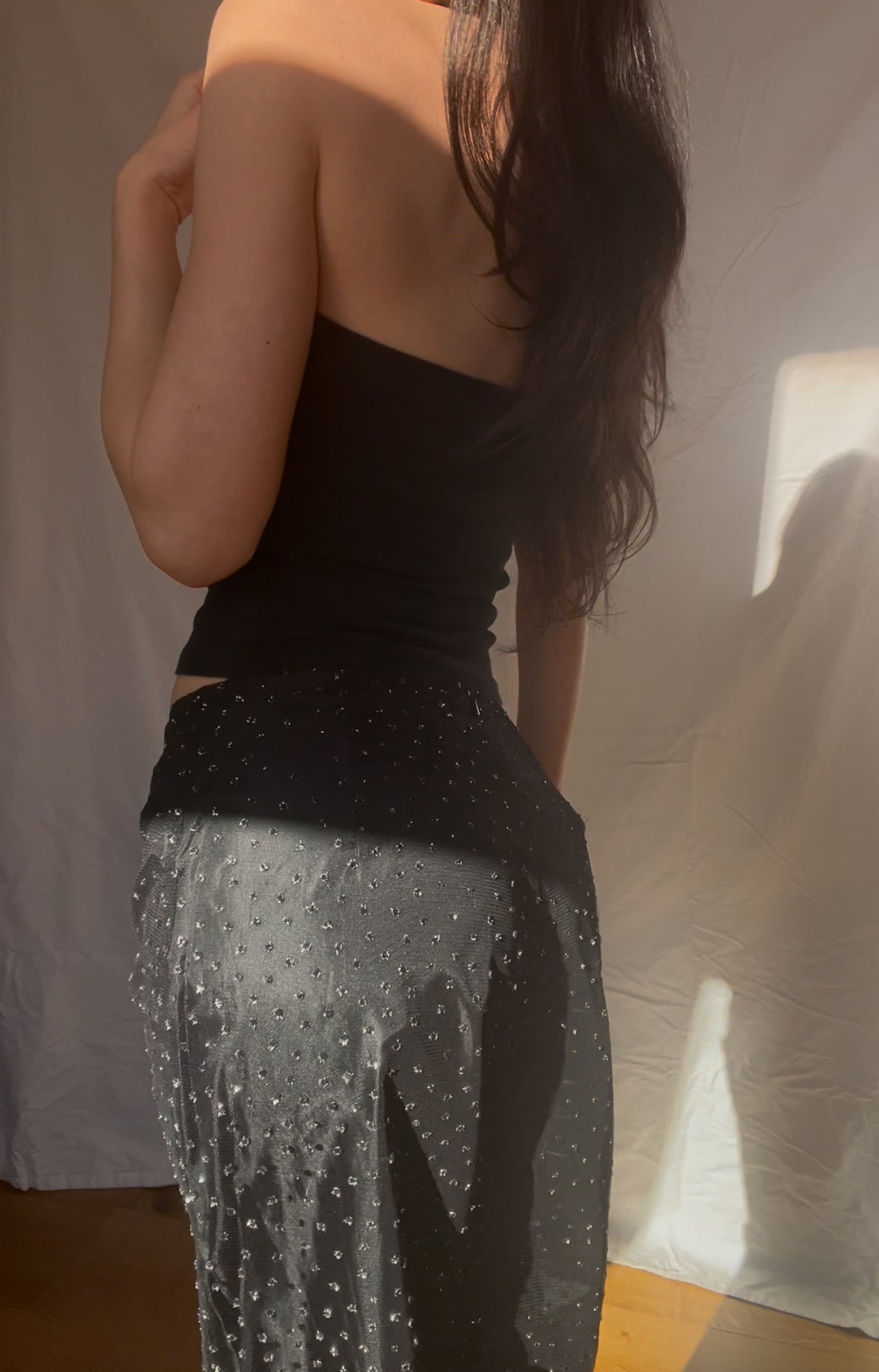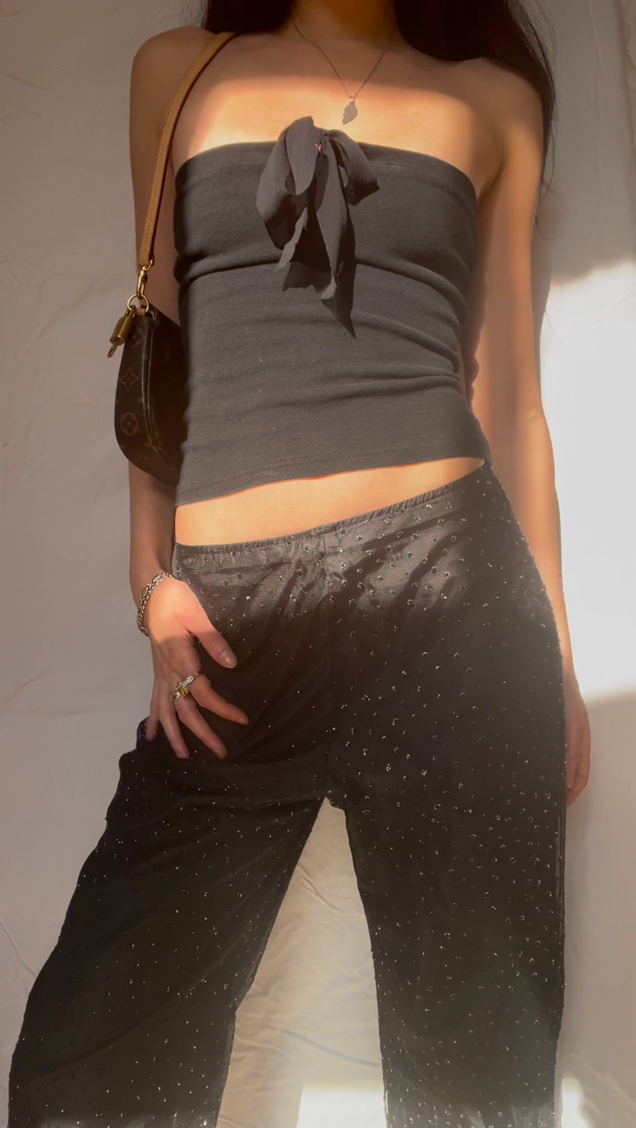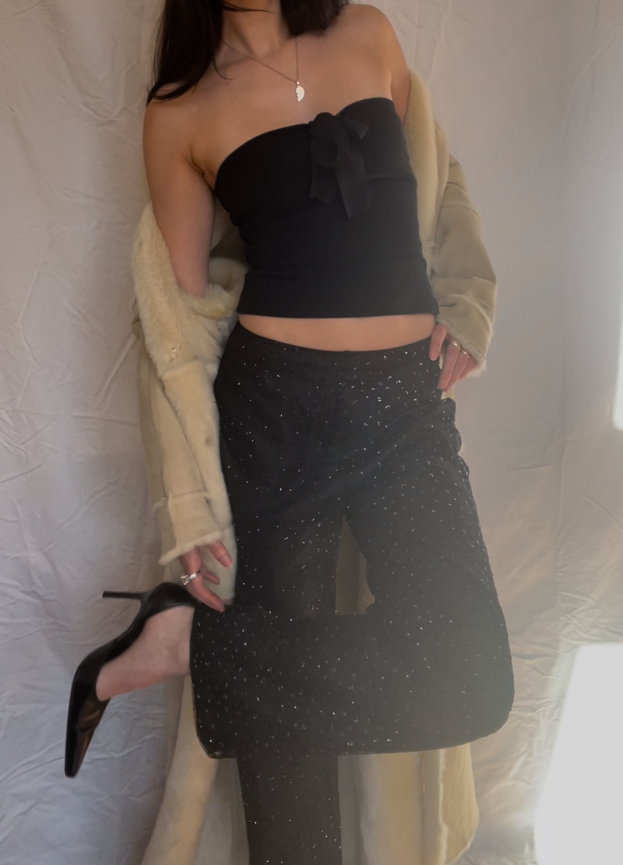 Vintage black straight leg trouser pants with back zip closure netted with glitter dots! So cute for holiday parties and New Year's Eve!