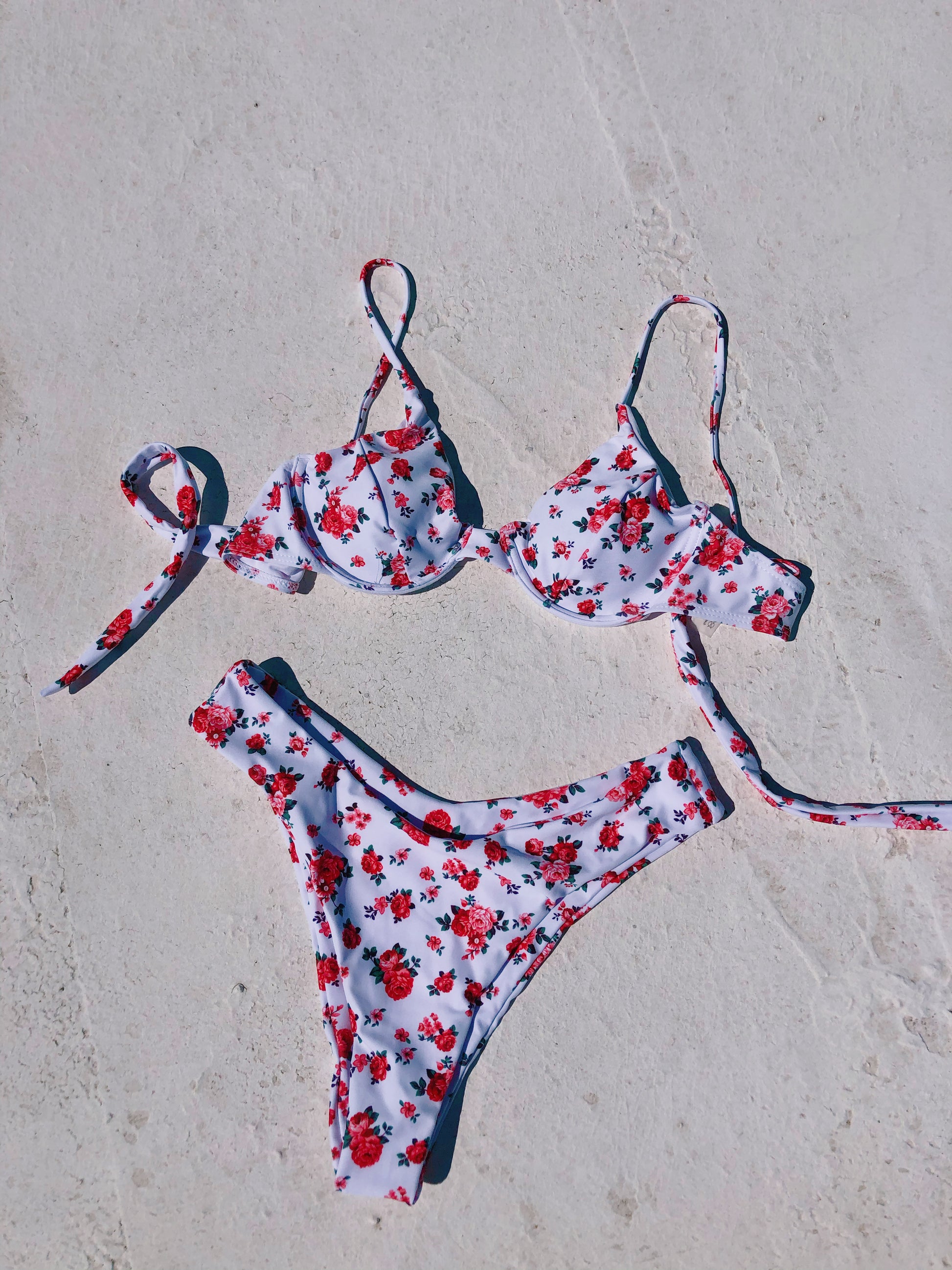 Rose print white bikini set. High leg cheeky bottoms with underwire cups top. Top has adjustable straps and ties in the back.