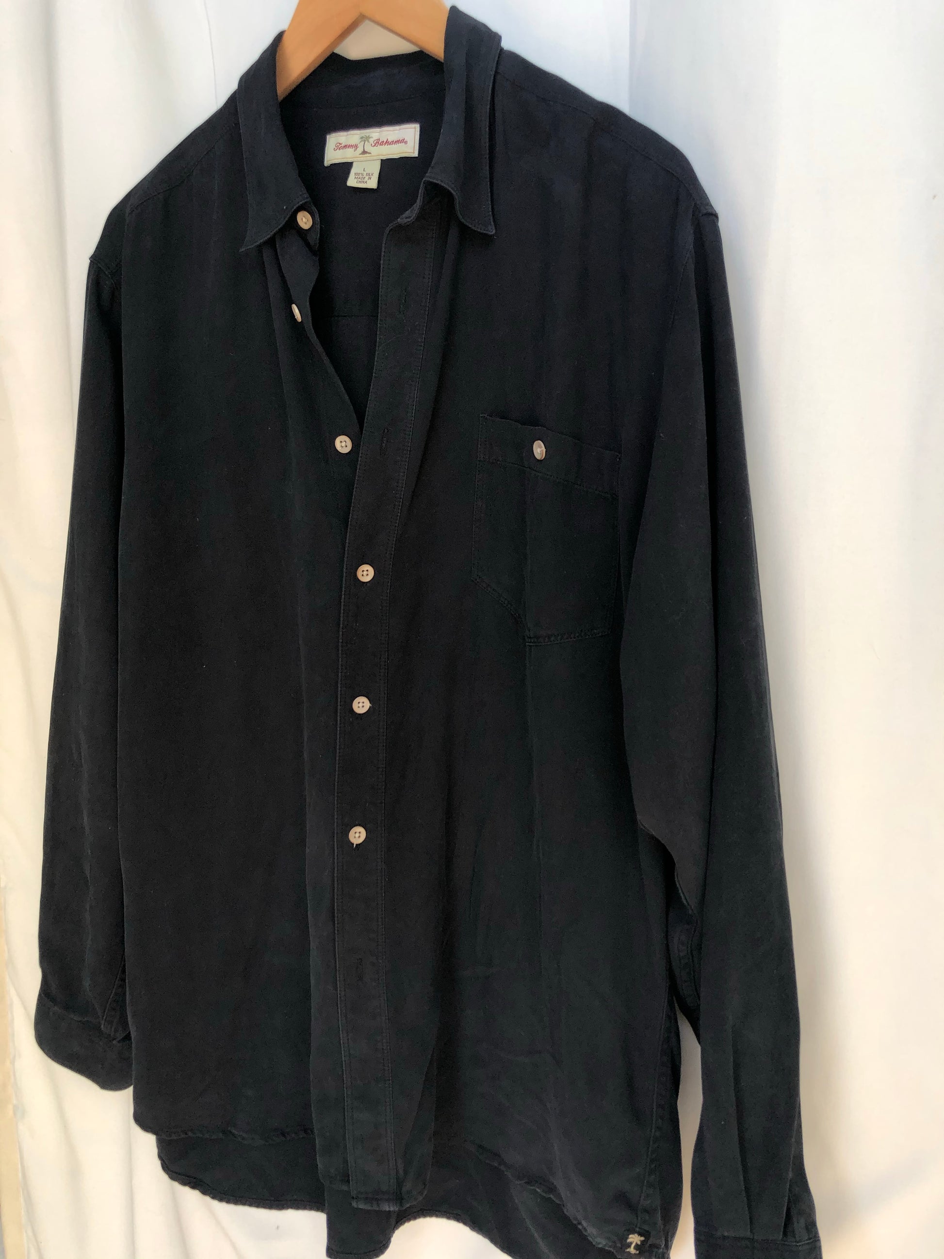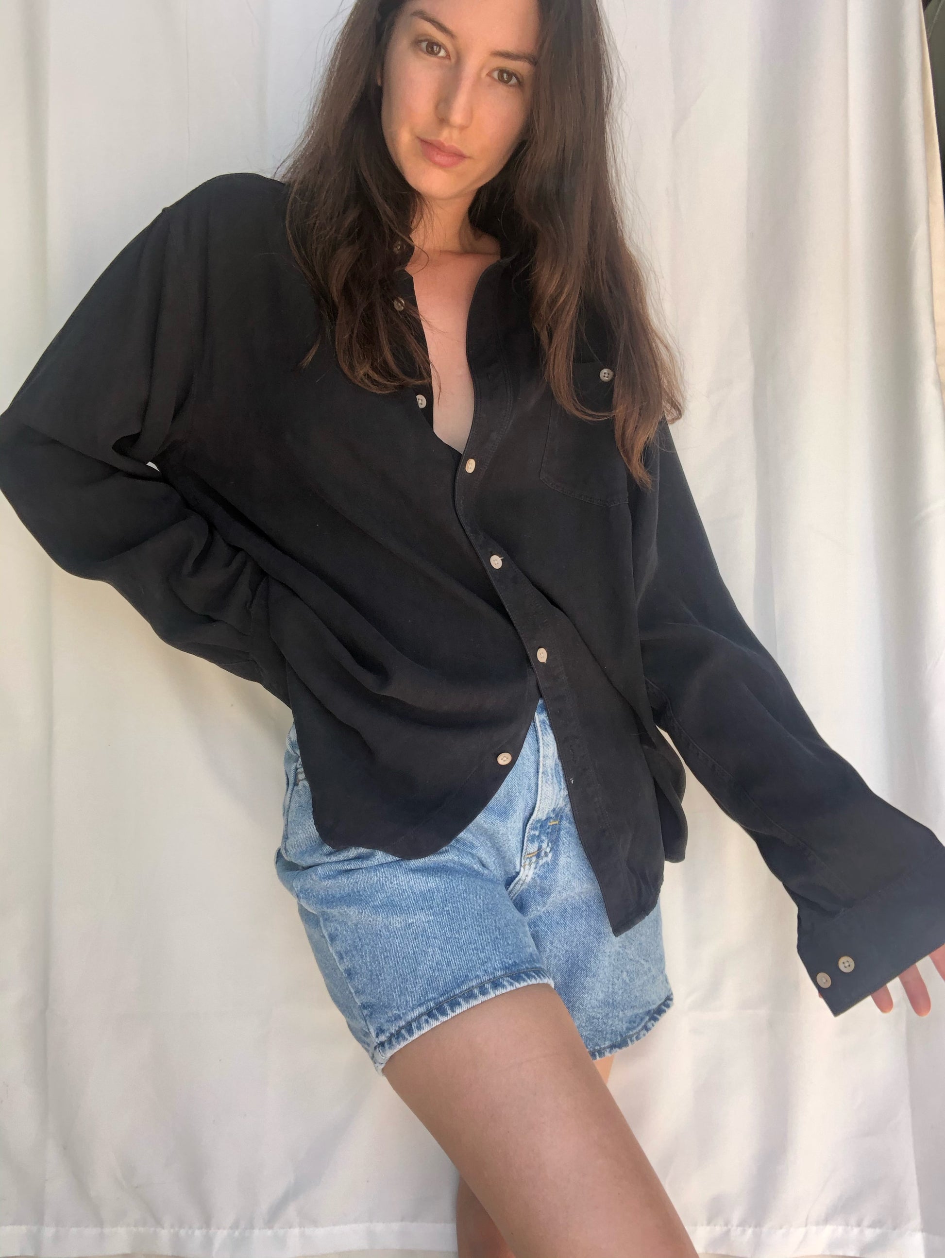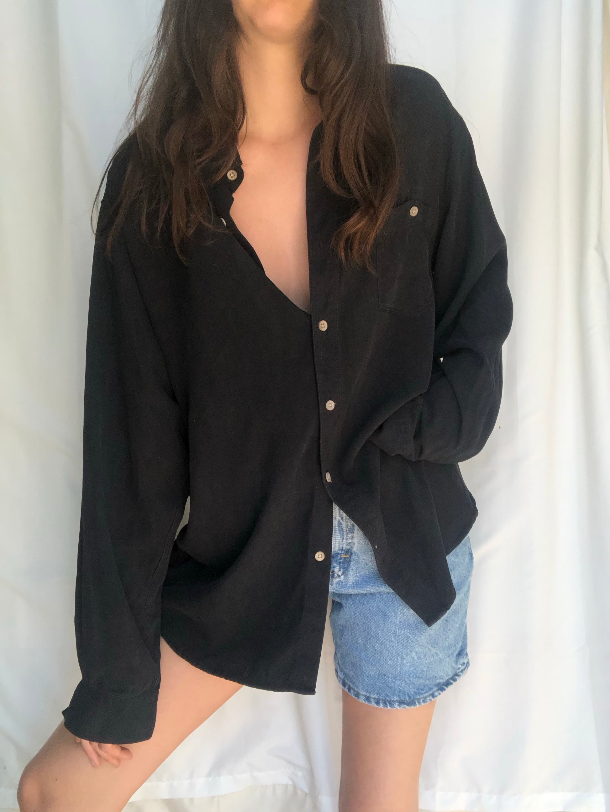 100% silk soft and flowy button down collared men’s shirt. Unisex and could be worn oversized or tied up in front. Color is dark navy blue almost black.