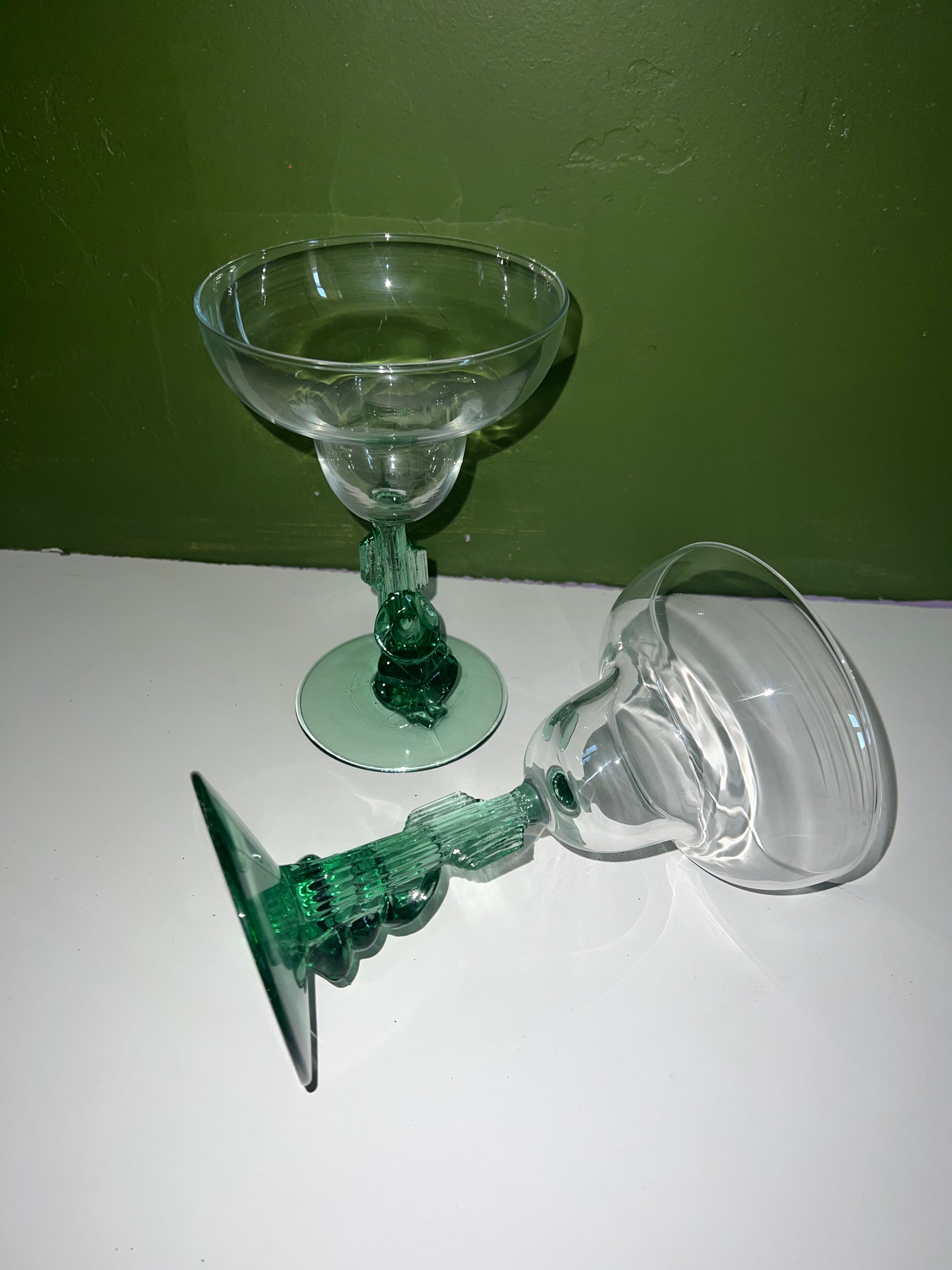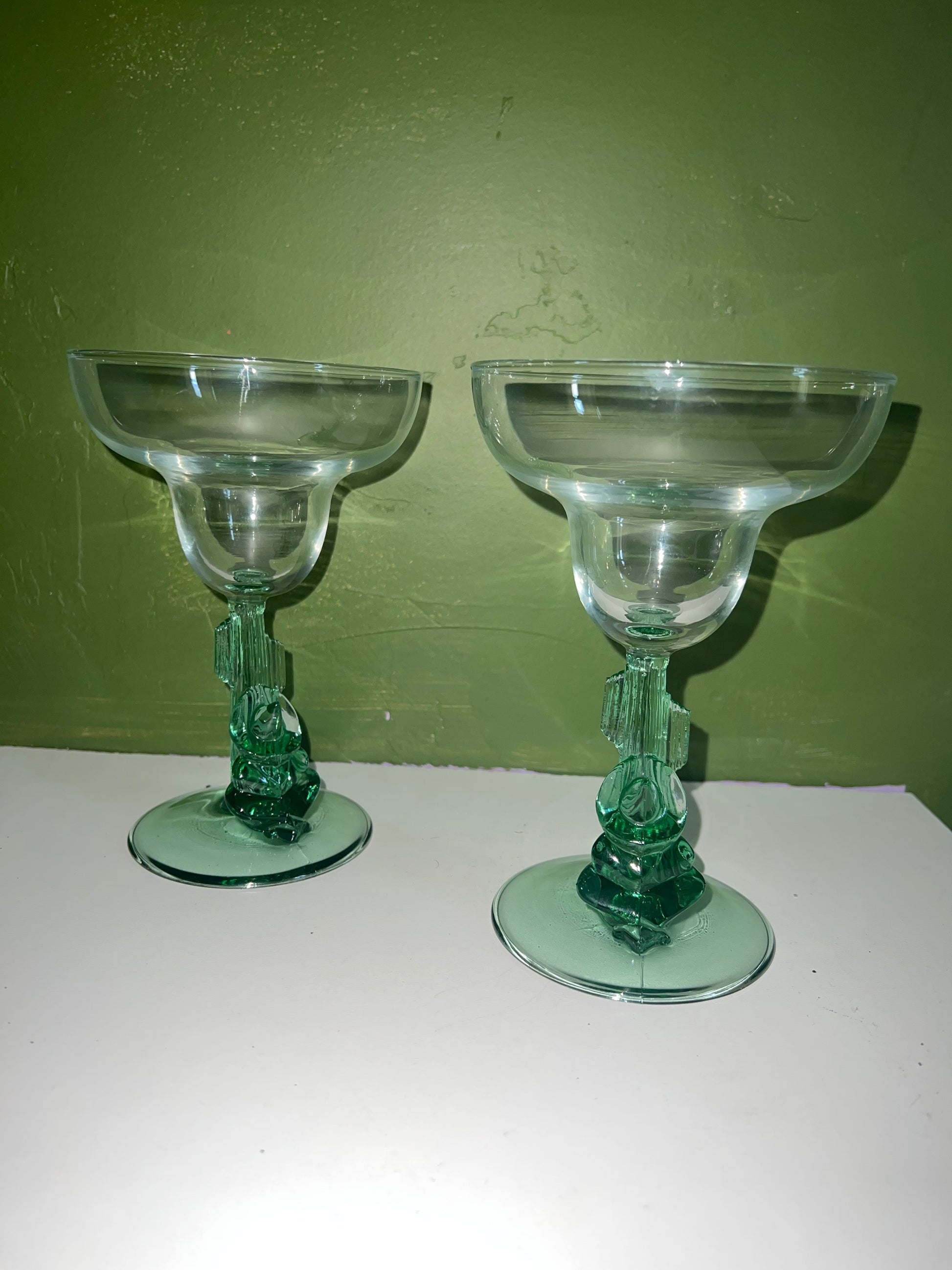 Vintage set of two margarita glasses. Featuring green tinted saguaro cactus stems with sleeping sombrero characters. Such a fun summer set for you kitchen!