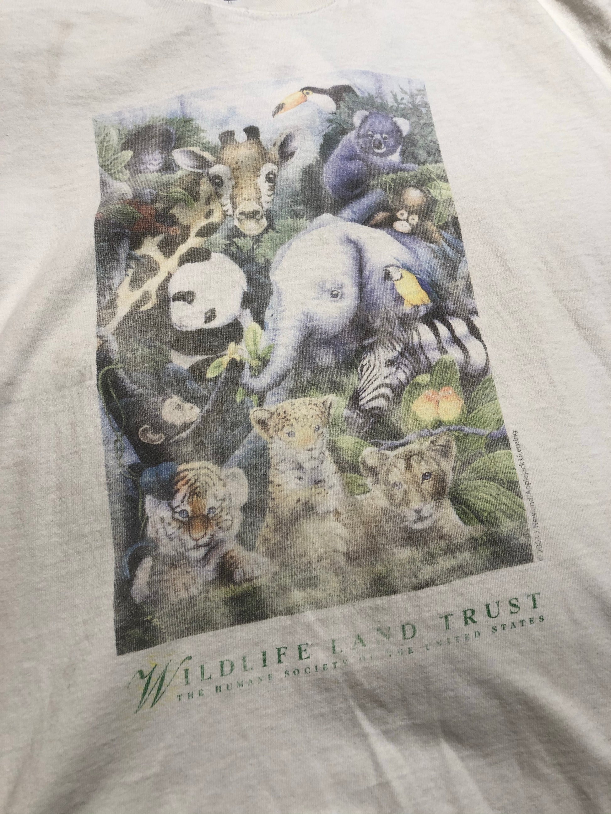 Vintage Wildlife Land Trust tee with faded jungle animals. Printed on a Gildan Heavyweight t-shirt