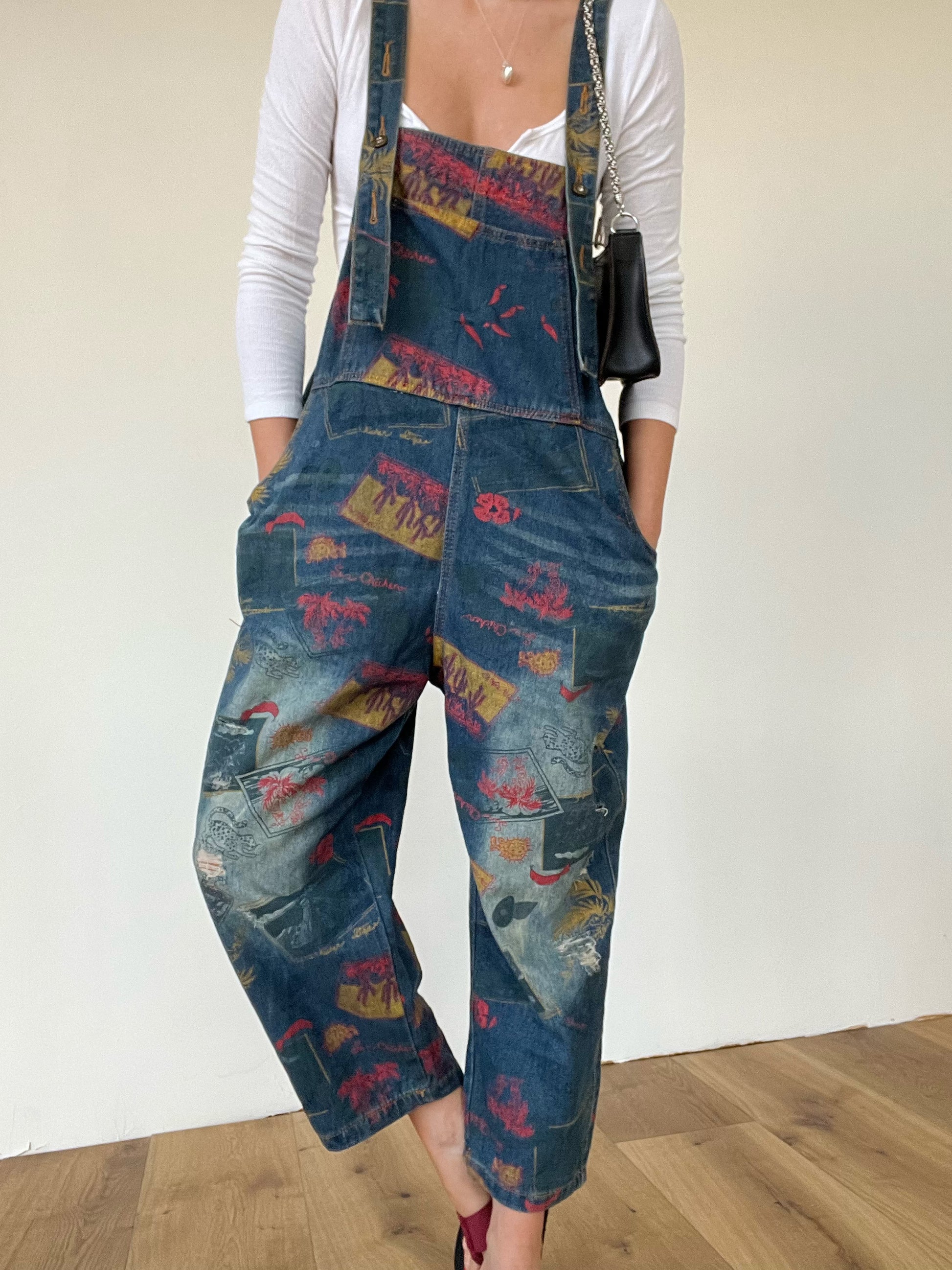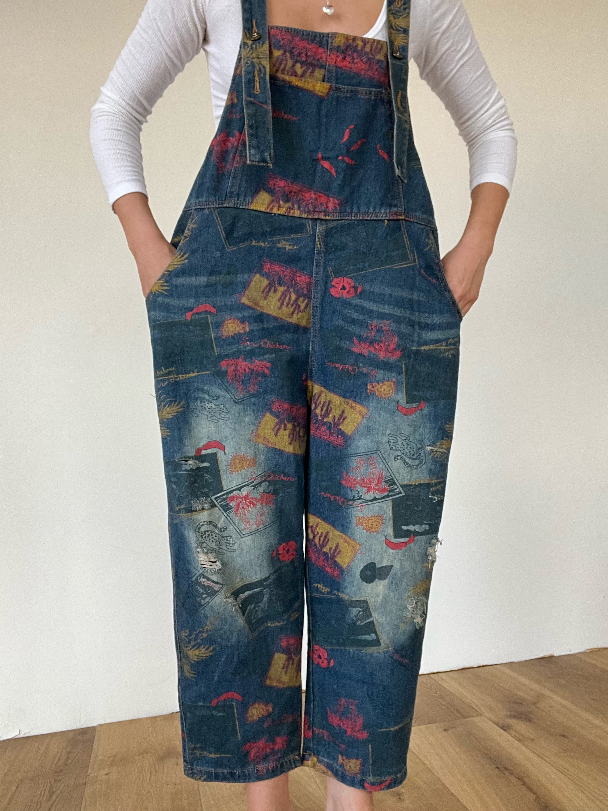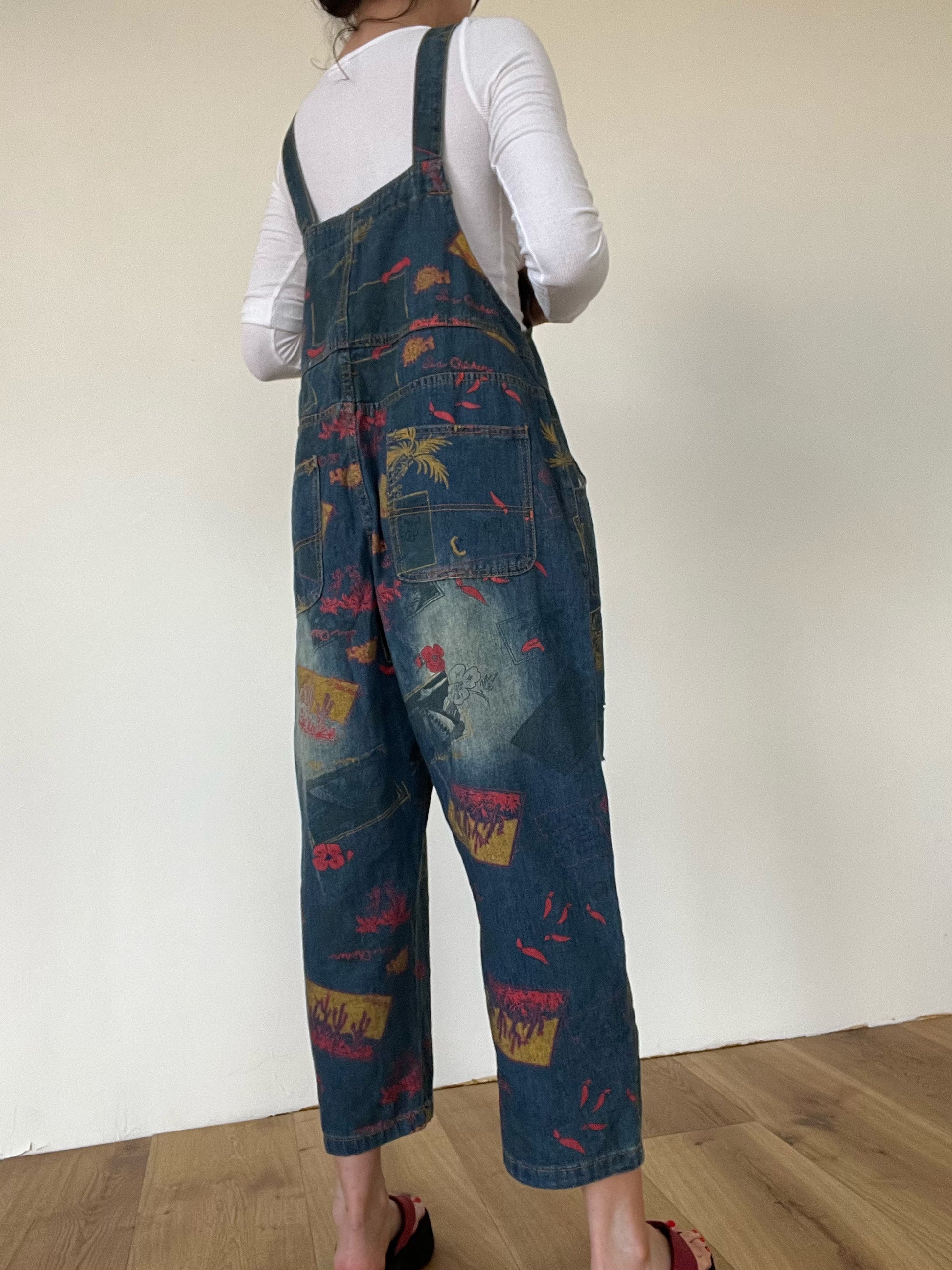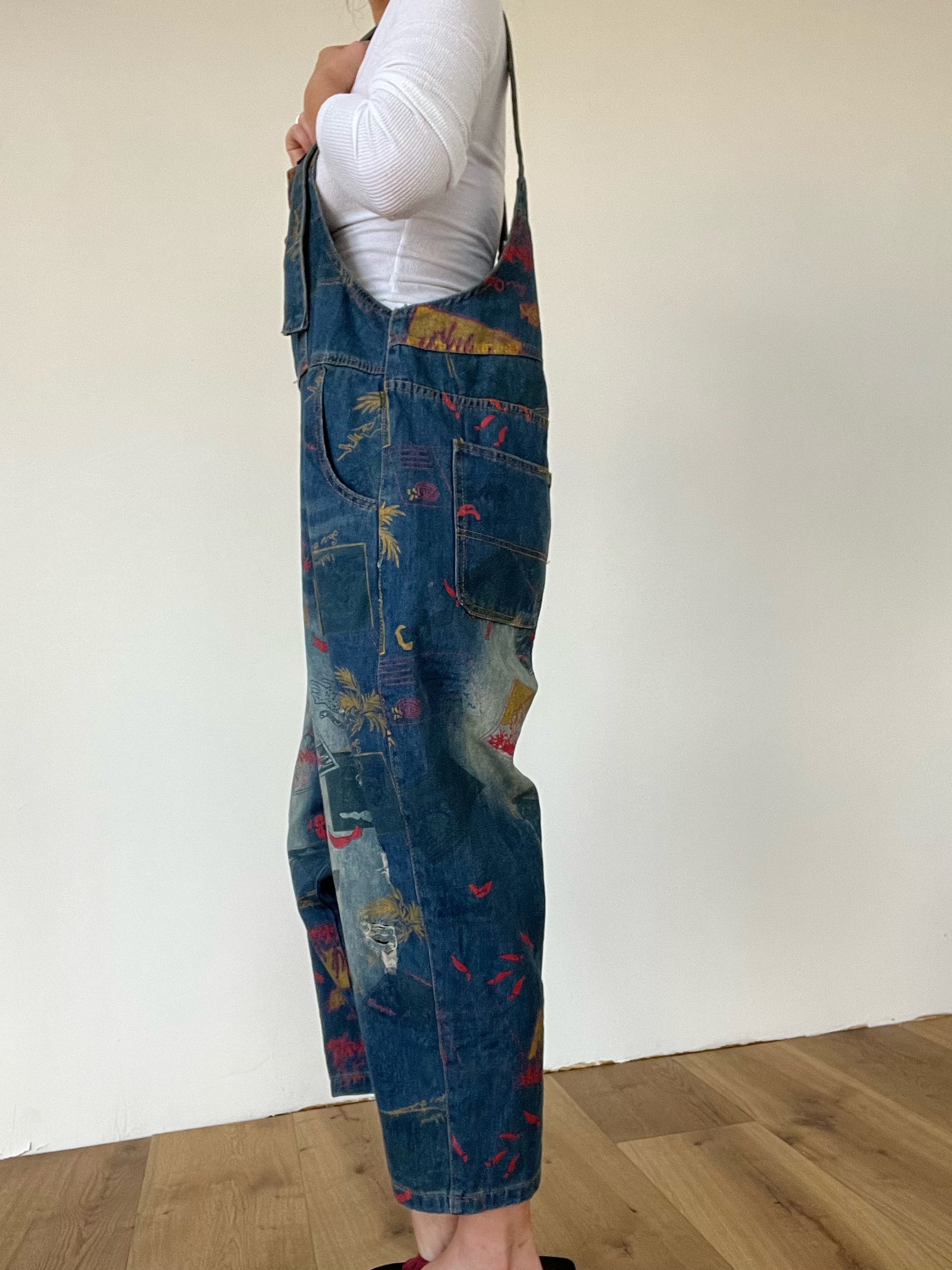 Southwest printed straight-leg medium wash denim overalls with slight distressing.