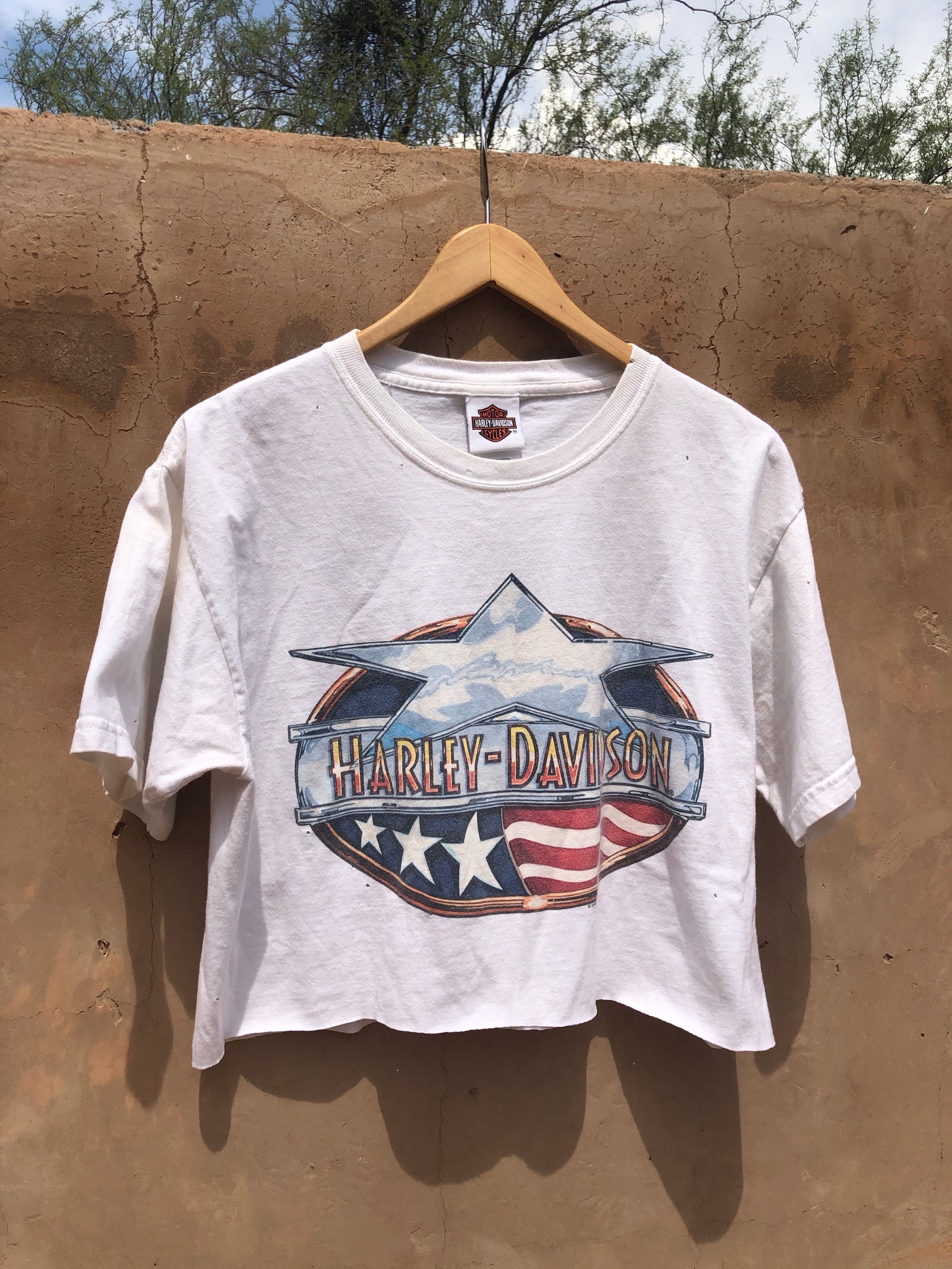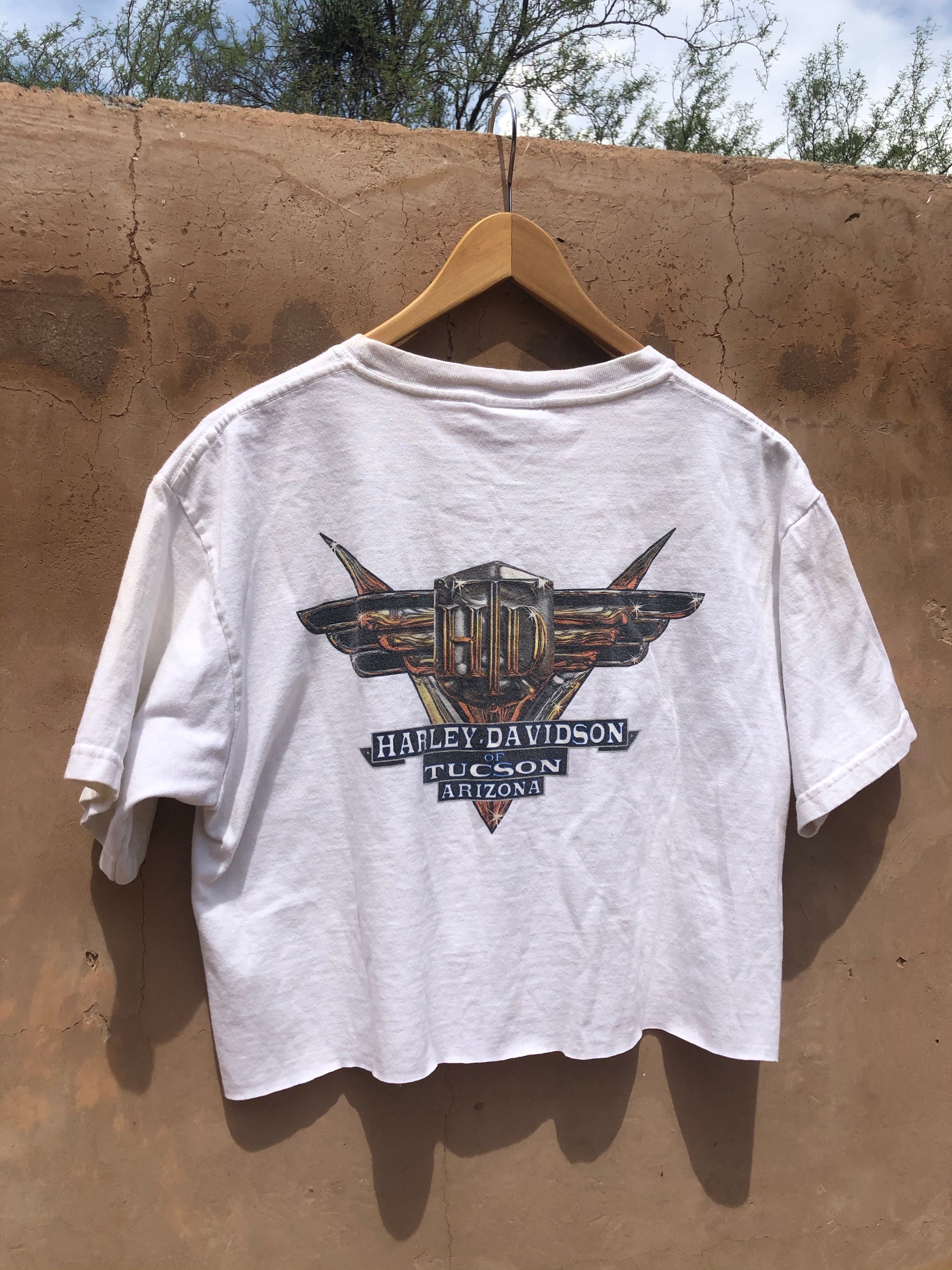 Tucson, AZ vintage Harley Davidson crop tee. White with graphic on front and back. Some distressing and small holes