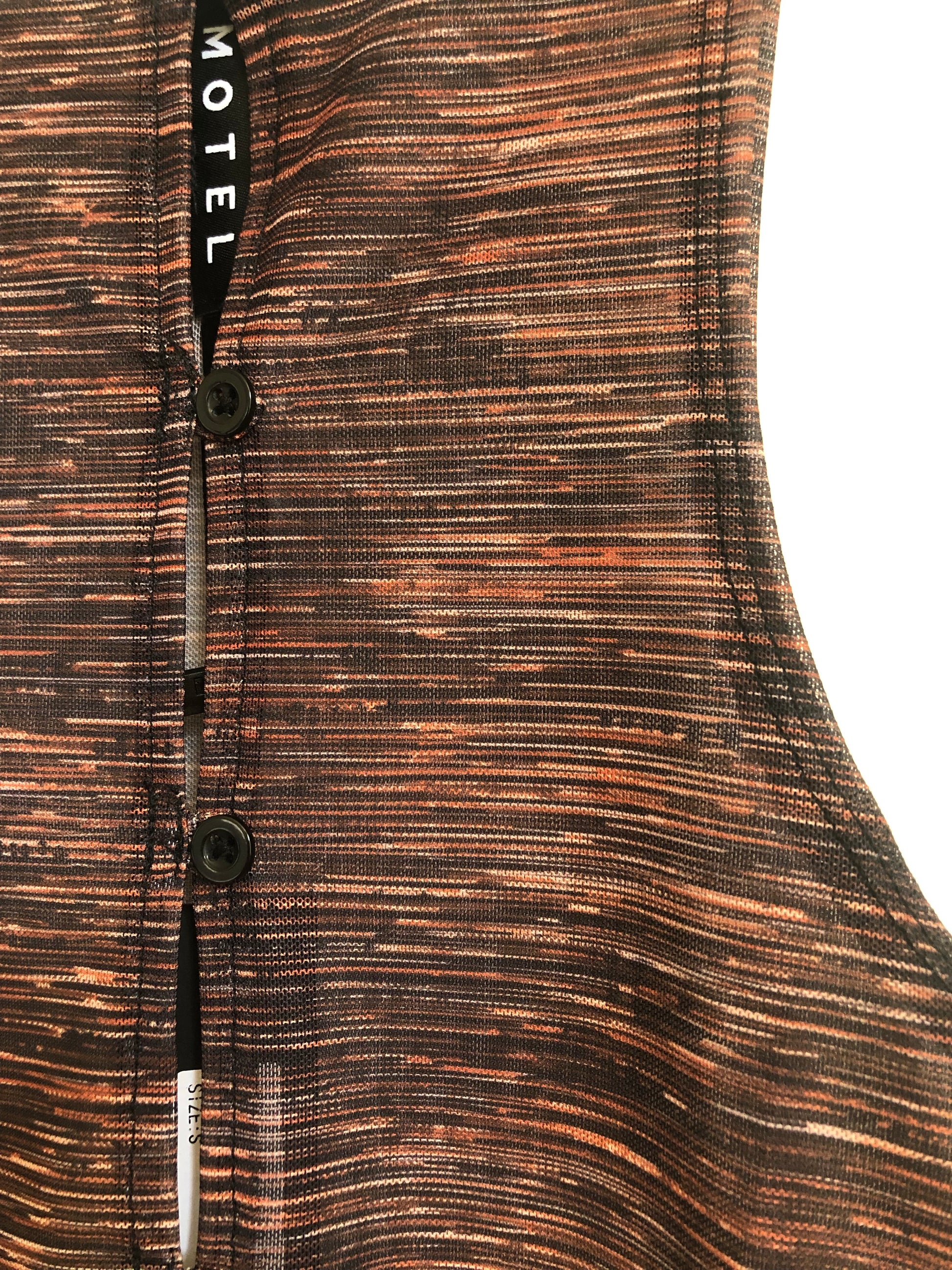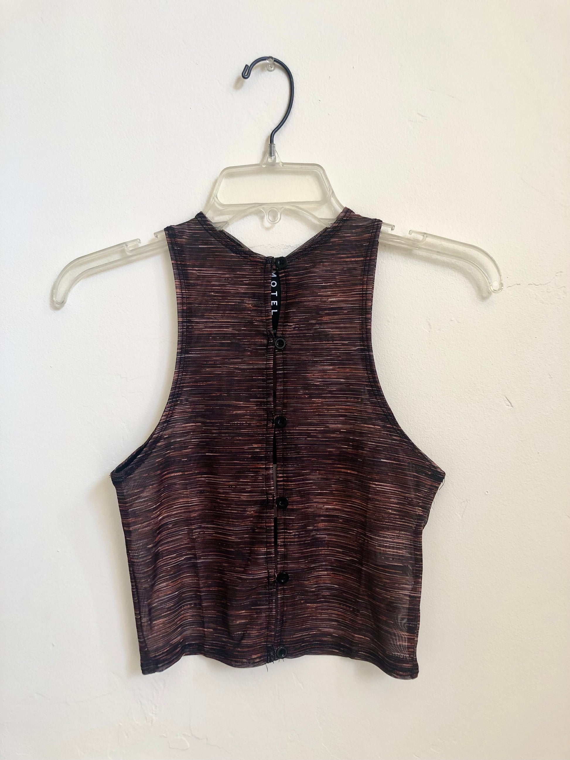 Brown and rust multi colored sheer mesh fabric button front detail crop top with racer back low side cut arms. This top is stretchy and see through but perfect if you want to free the nipple! You can always wear pasties or a bralette as well :)