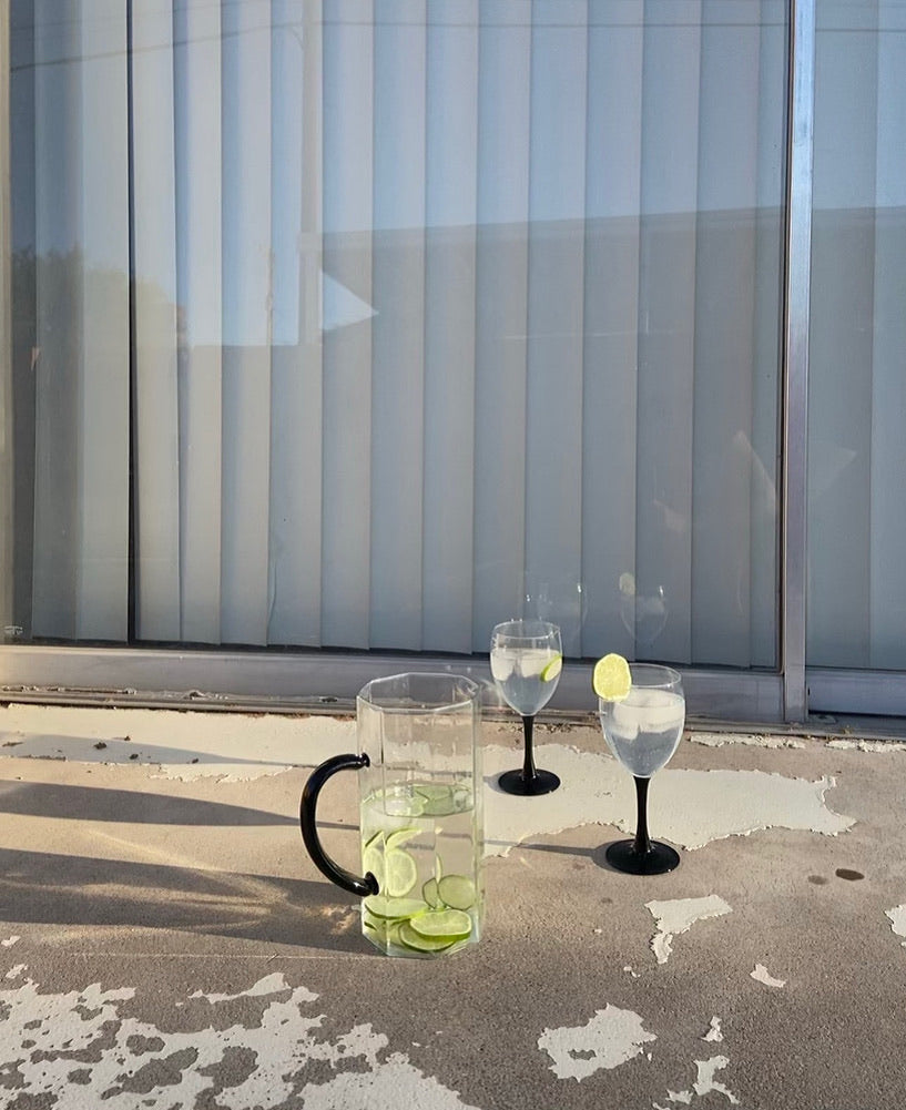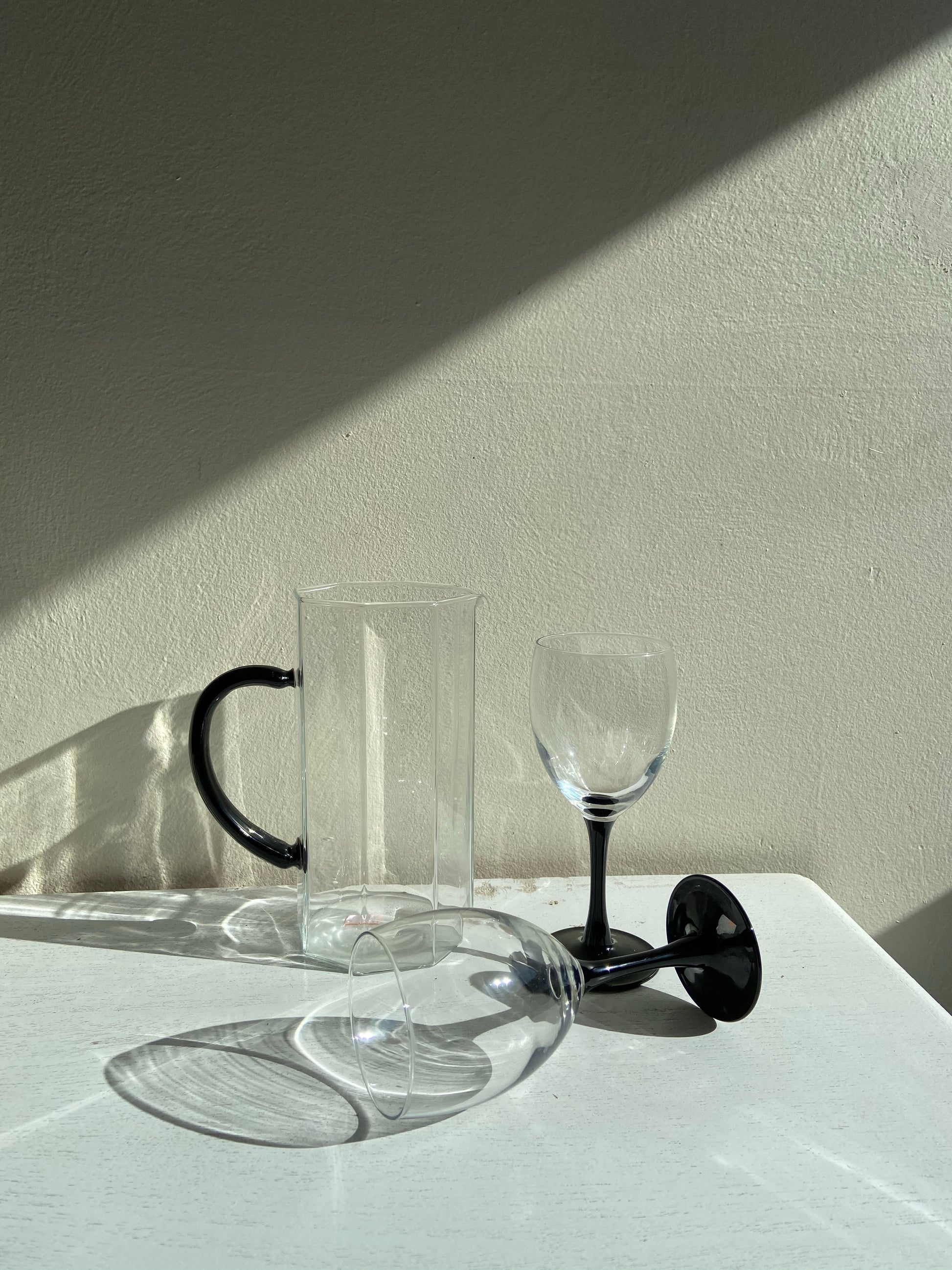 Vintage black & clear wine glass set with octagon pitcher.
