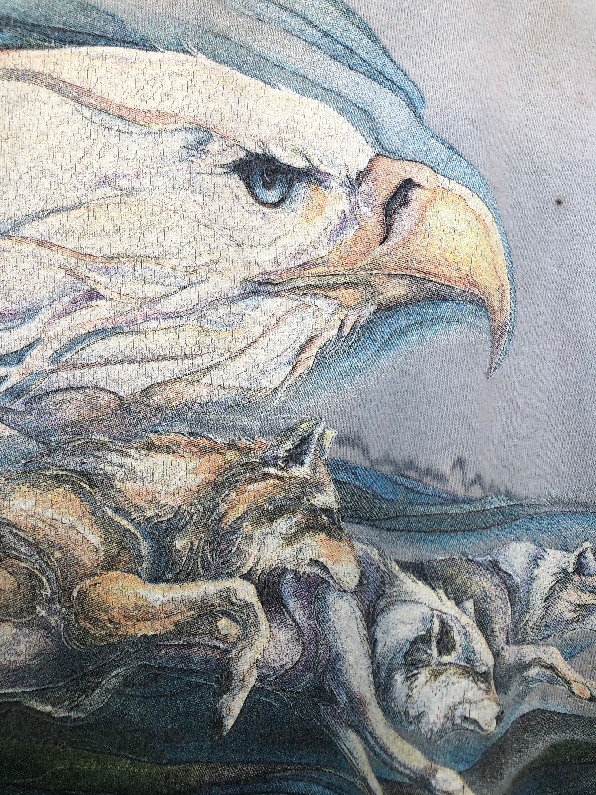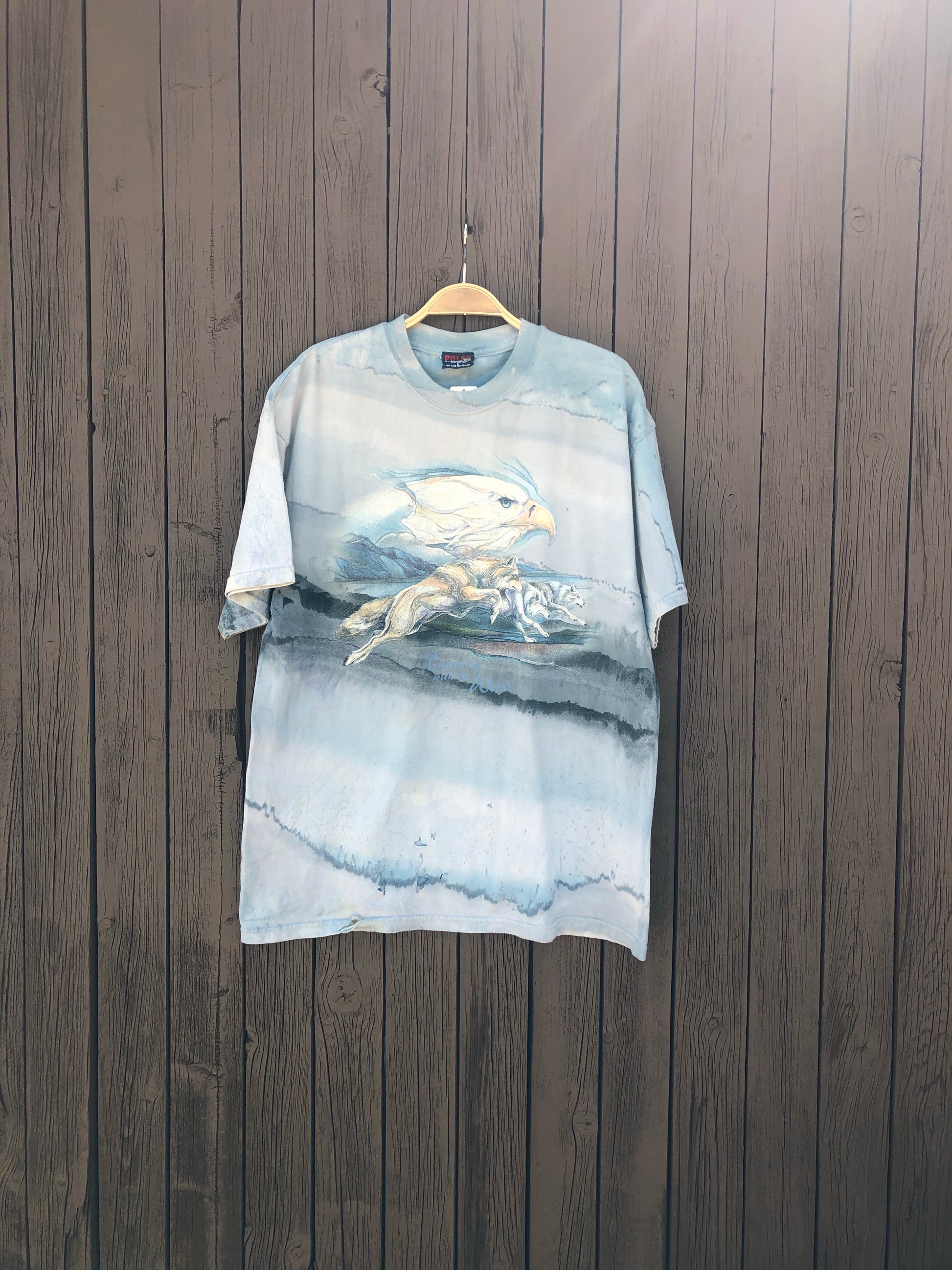 Oversized t-shirt with eagle and wolf print and swirled blue and grey tie dye effect