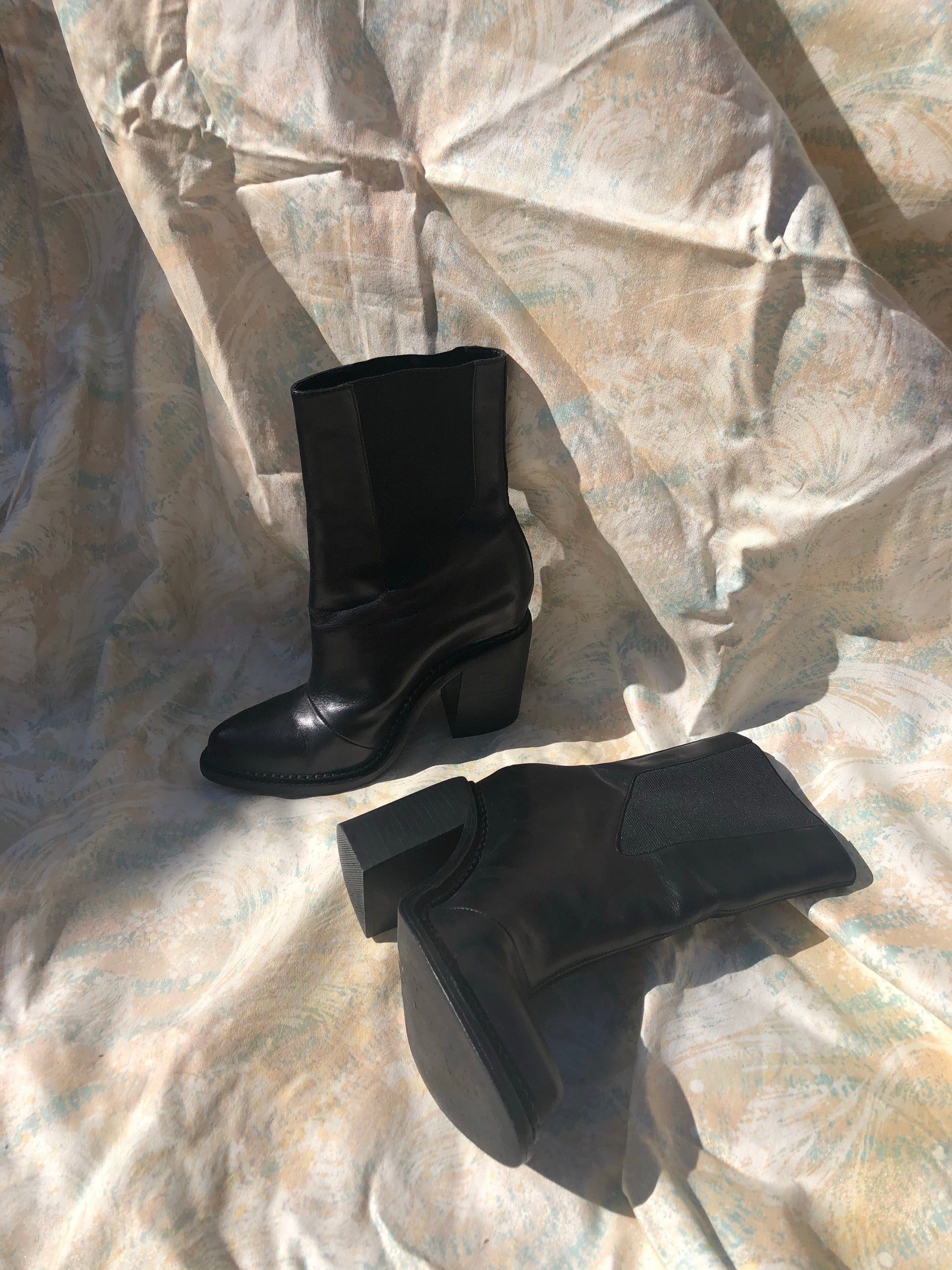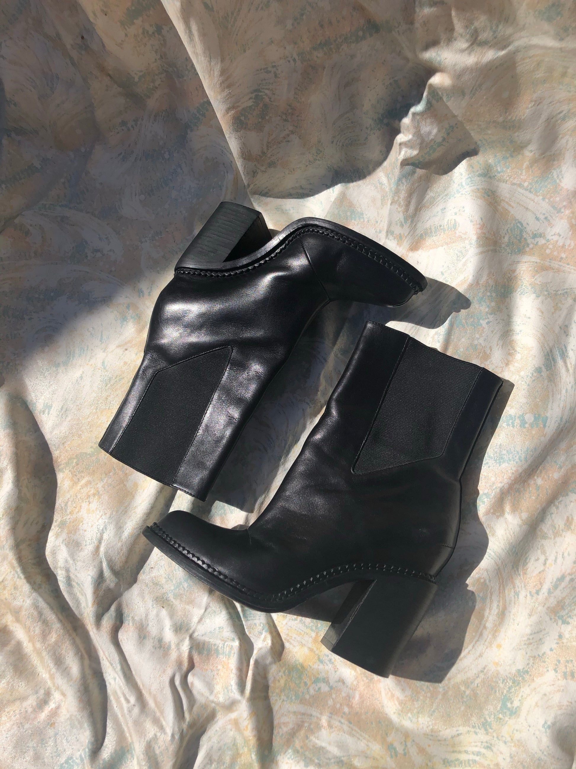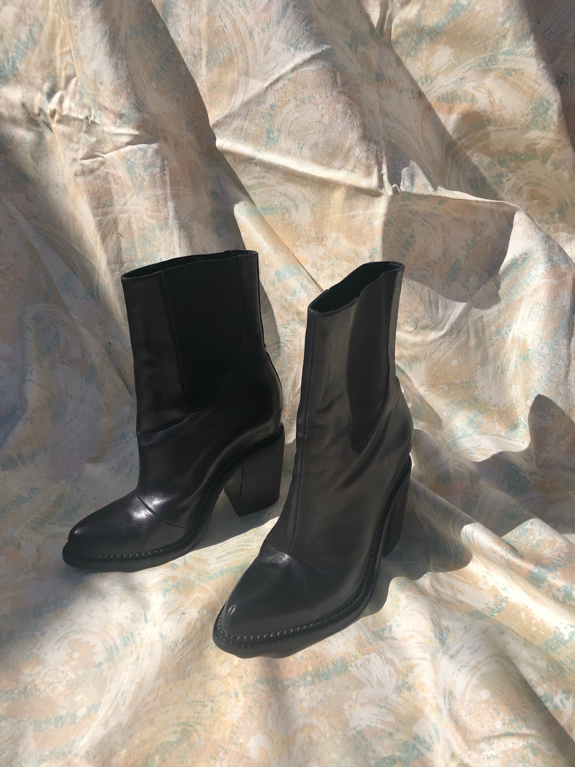 Theysken’s Theory black pointed toe leather Chelsea boots with 3” chunky heel. Shaft height is 5”