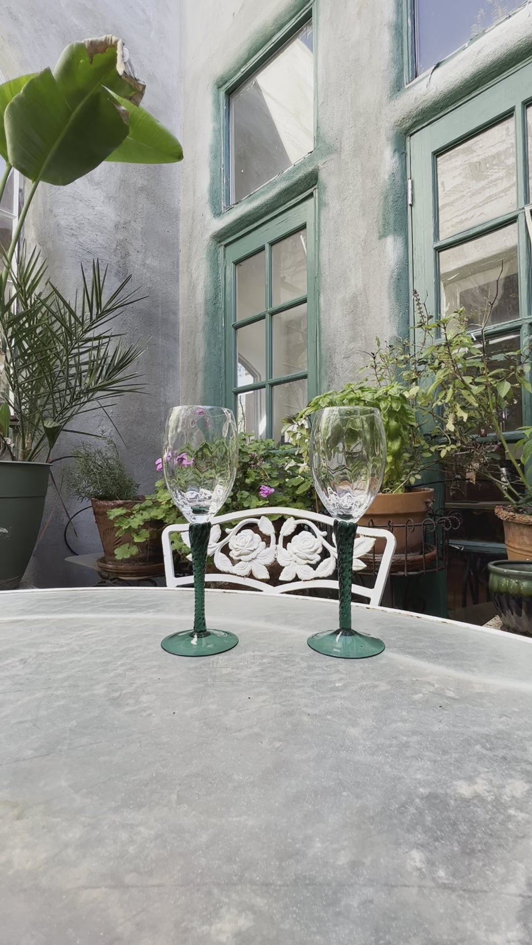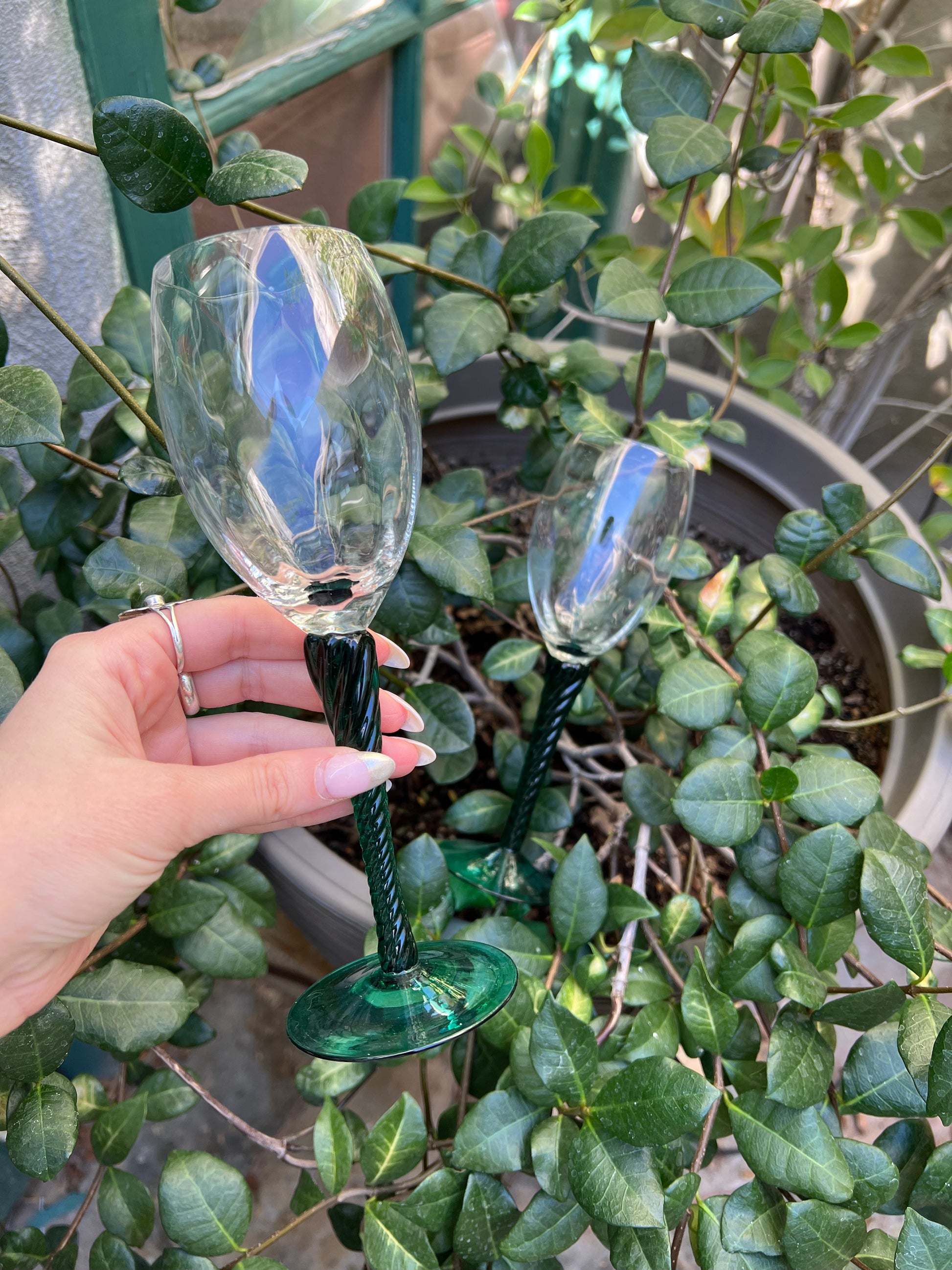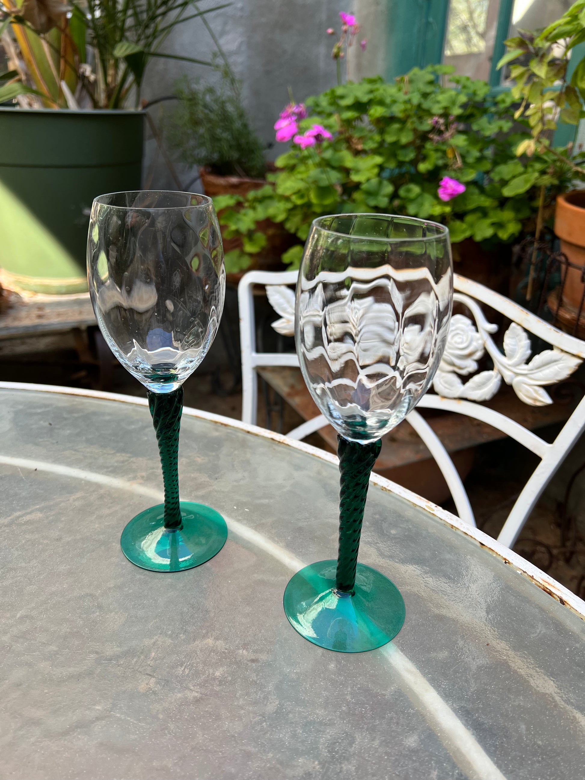 Set of two green twist stem wine glasses with pleated goblet. So cute!! Great for a holiday gift, a vibey picnic accessory, or upgrading your kitchen glassware.