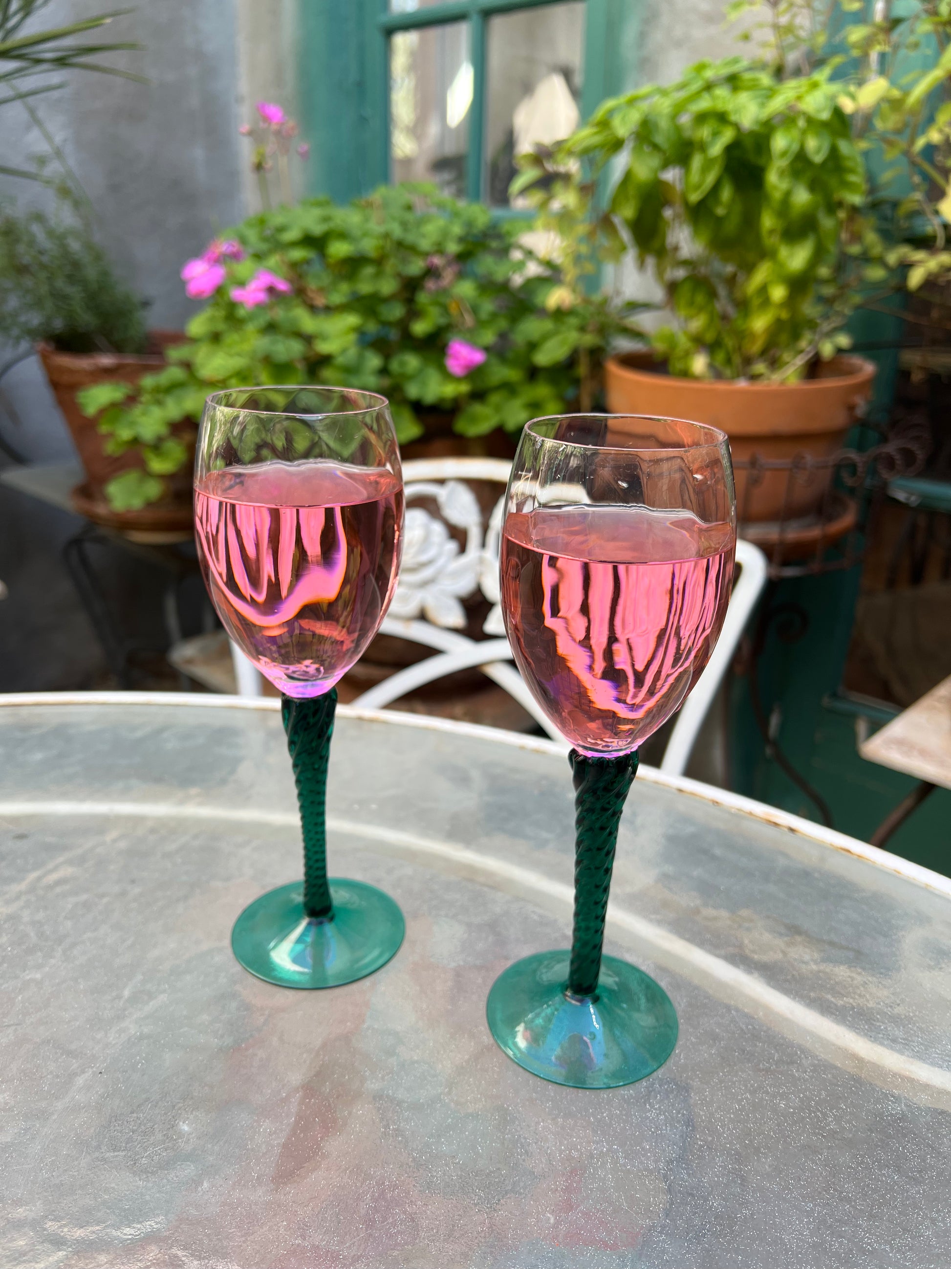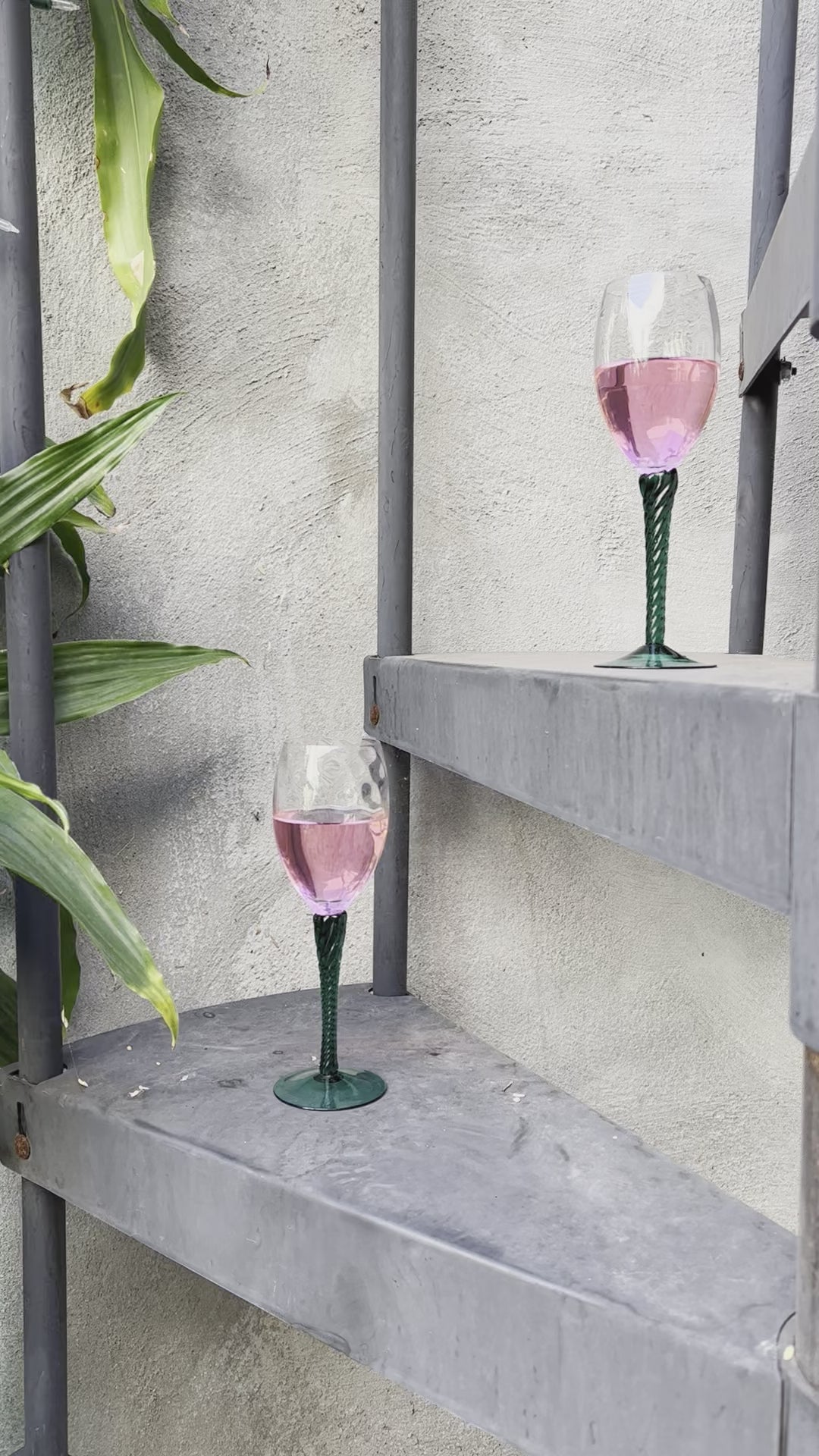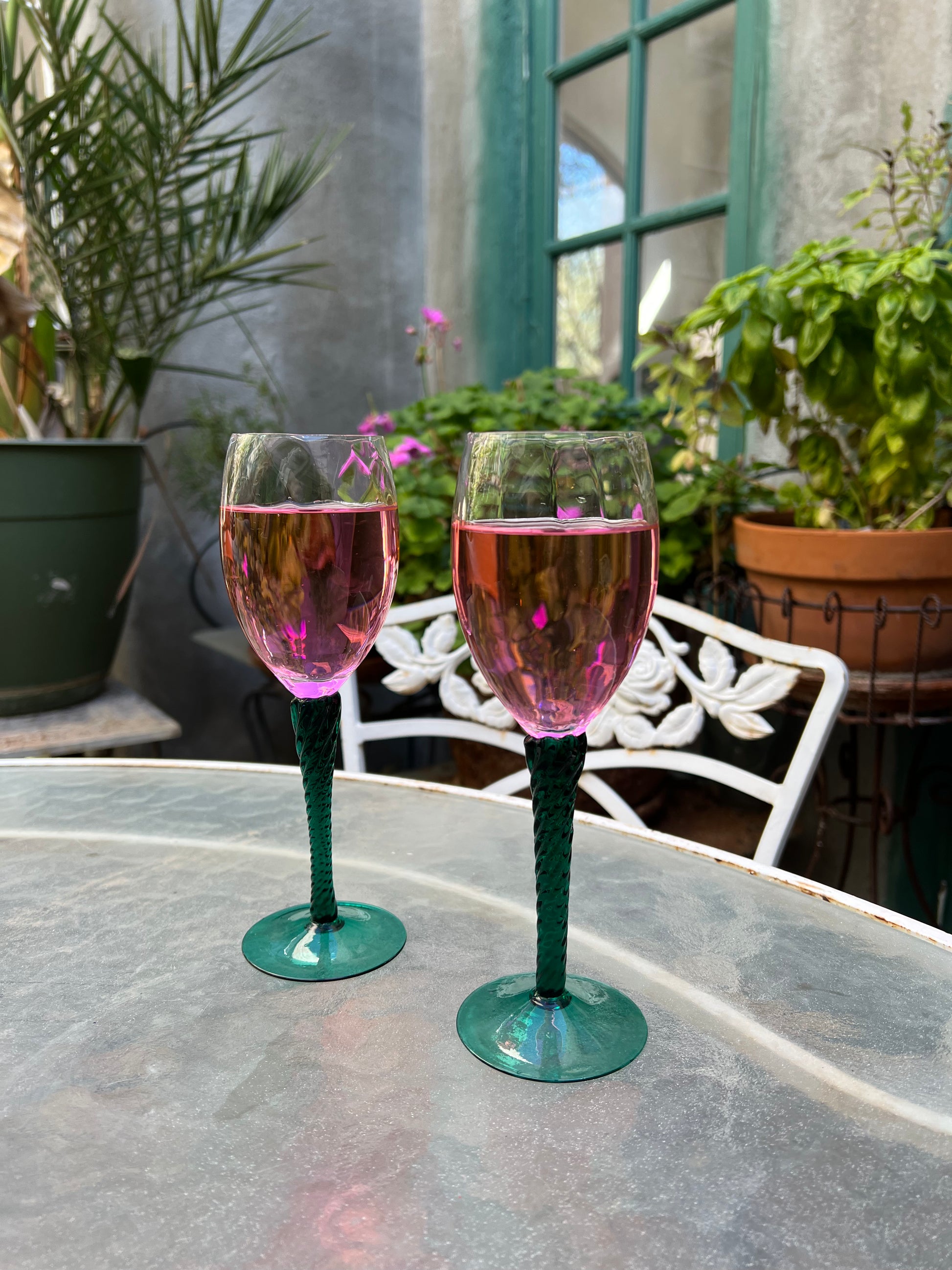 Set of two green twist stem wine glasses with pleated goblet. So cute!! Great for a holiday gift, a vibey picnic accessory, or upgrading your kitchen glassware.