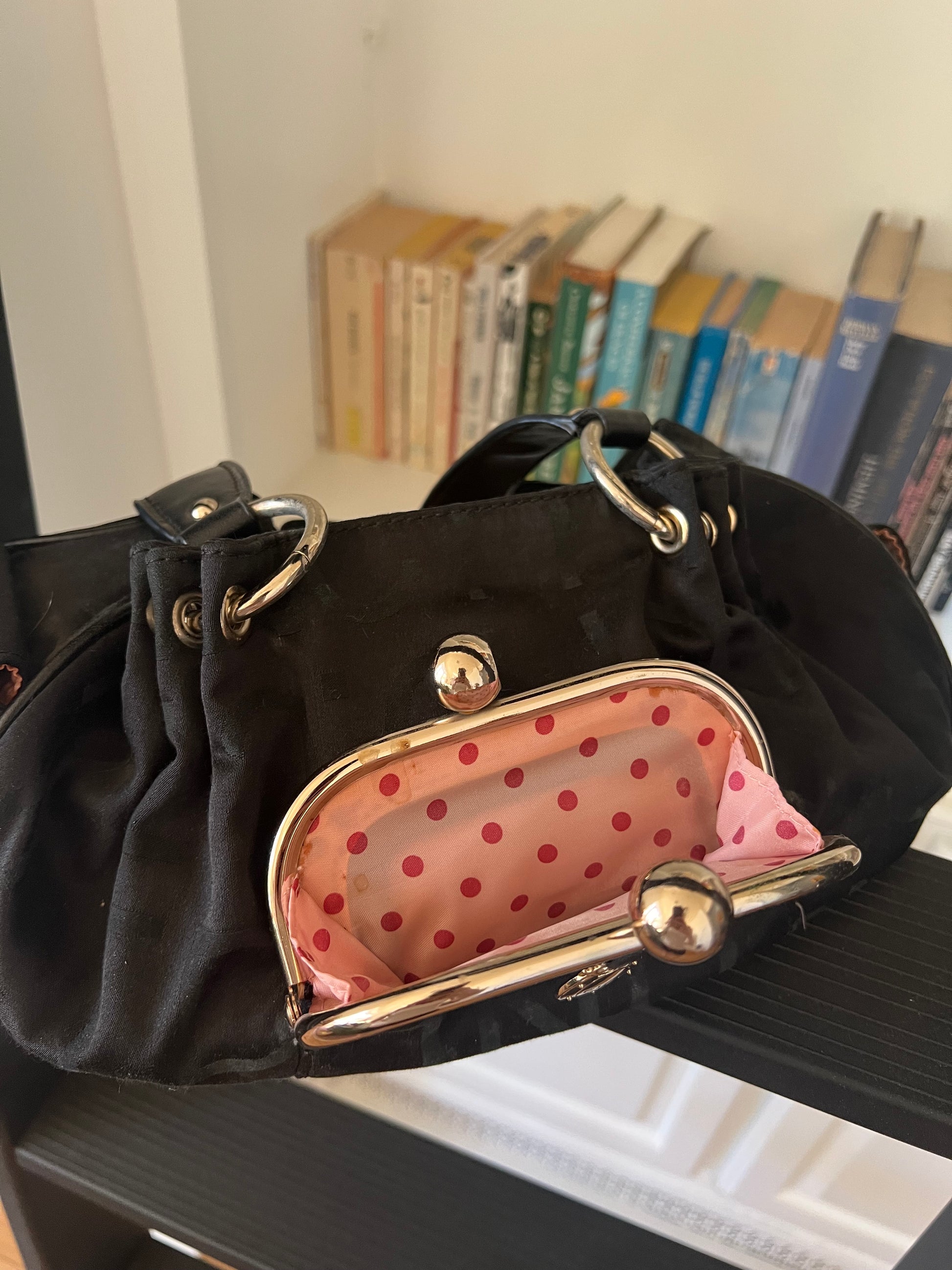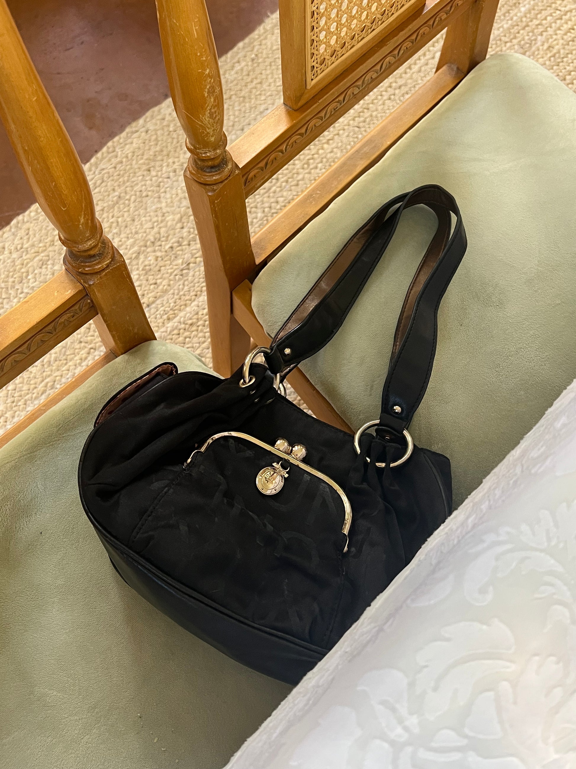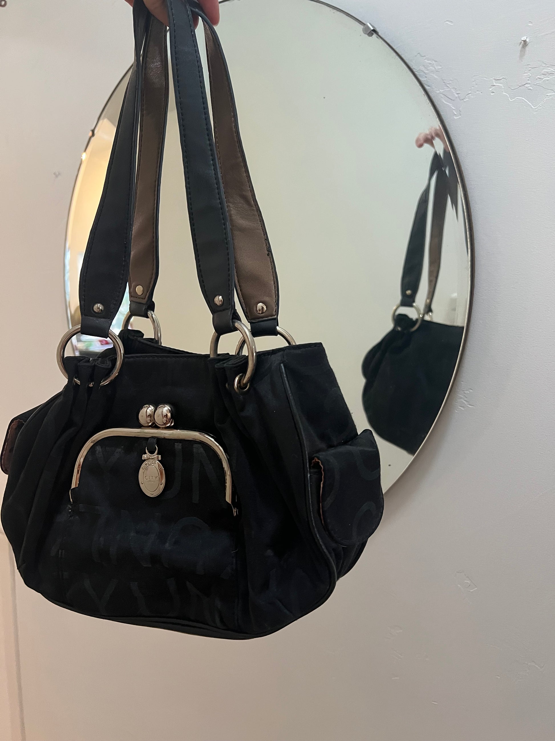 Black monogram fabric y2k slouchy shoulder bag with silver ring hardware and snap purse pocket from City Unltd. Interior lining is pink polka dotted.
