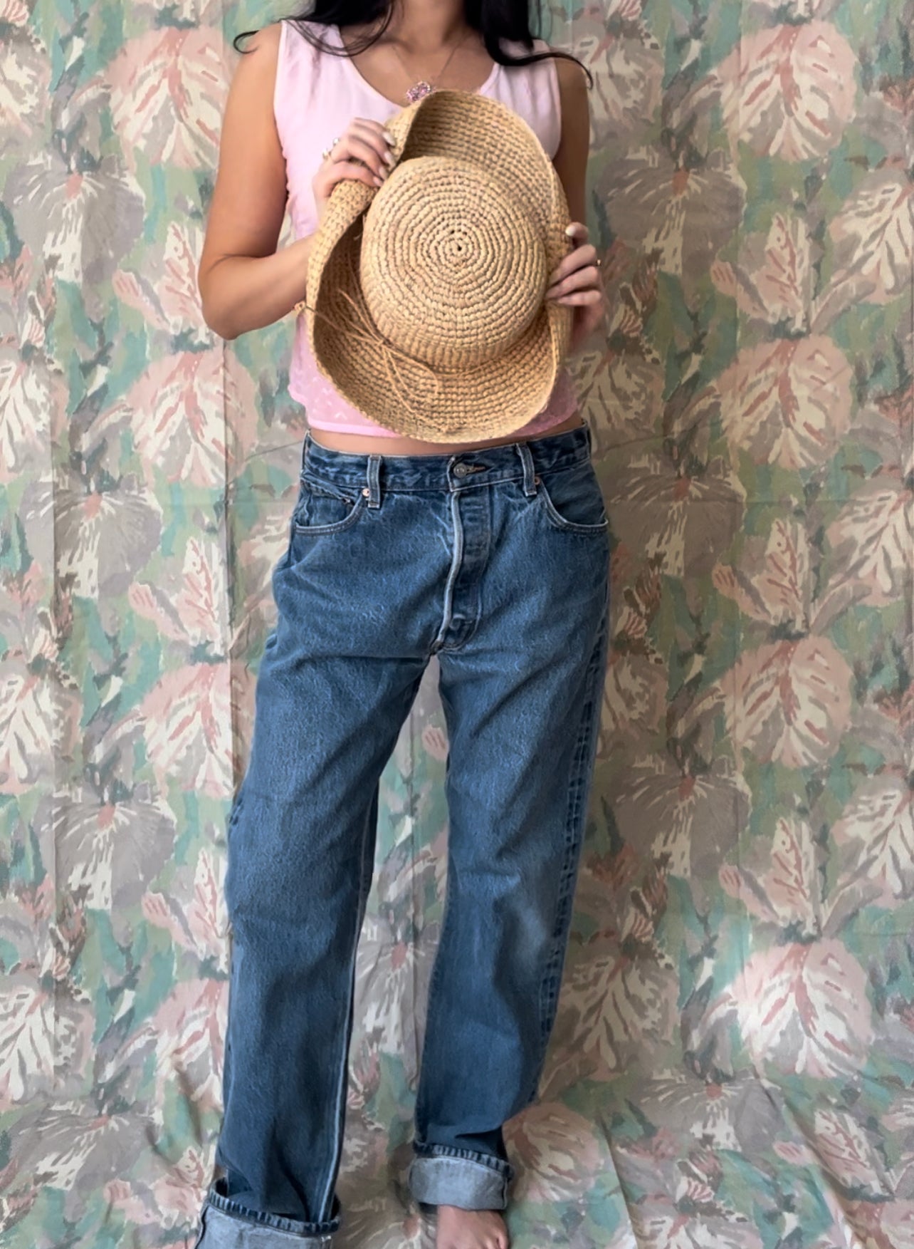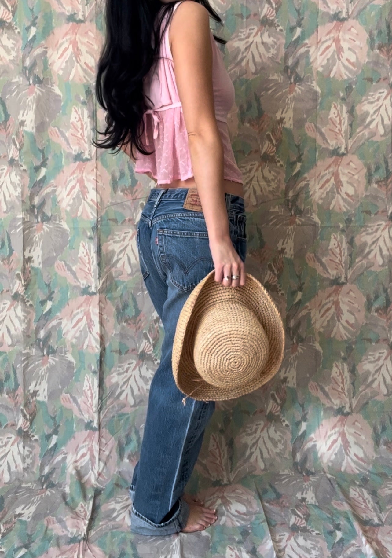 Vintage floppy folded brim gardening hat with string bow. The perfect 90’s accessory for fall things like apple picking and raking leaves.