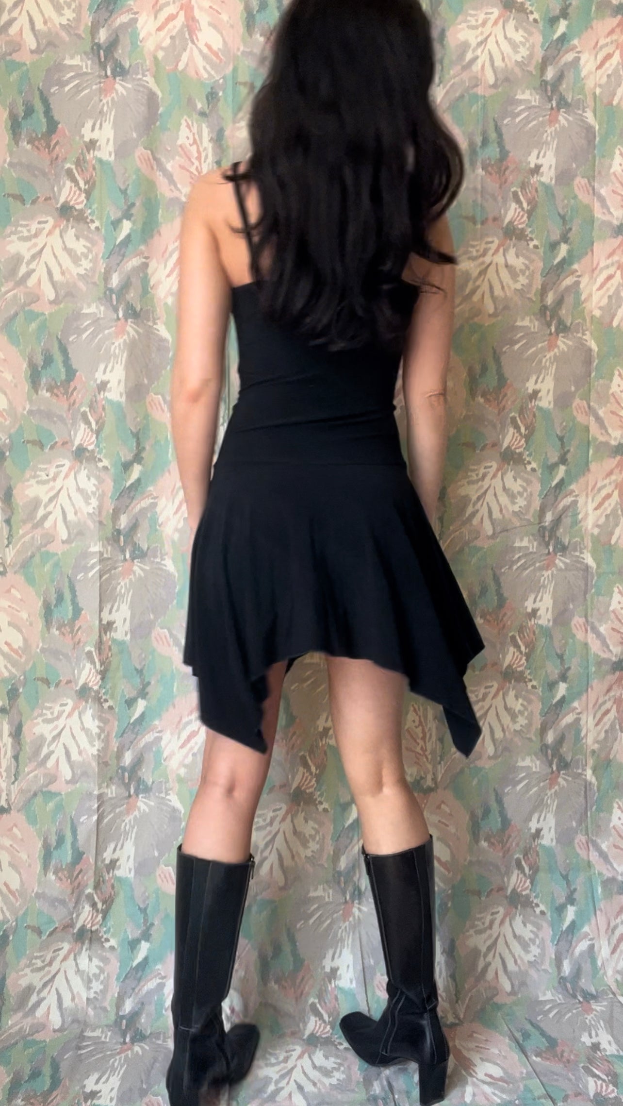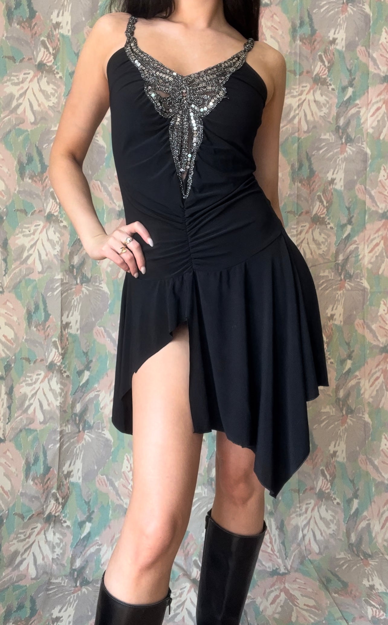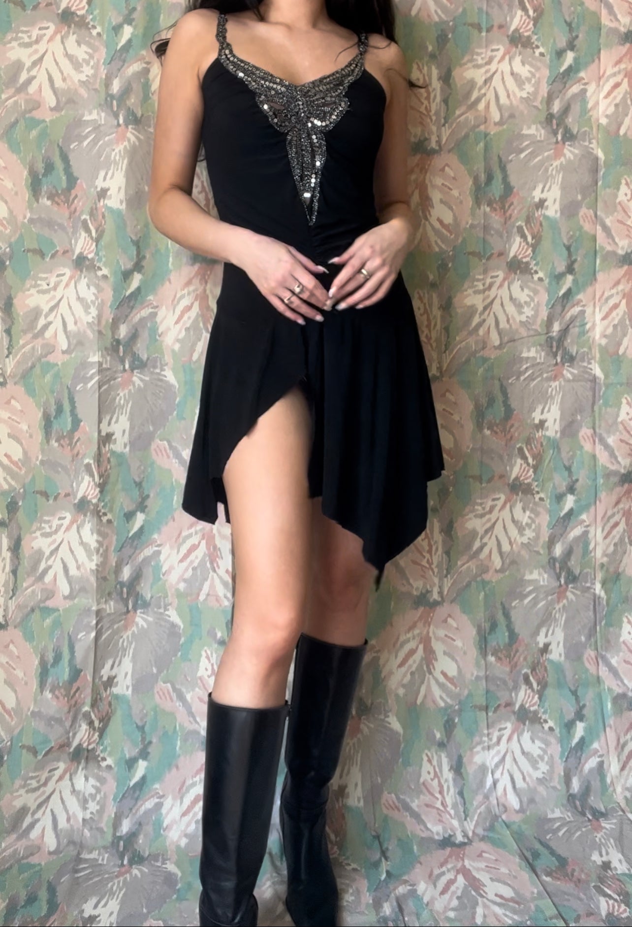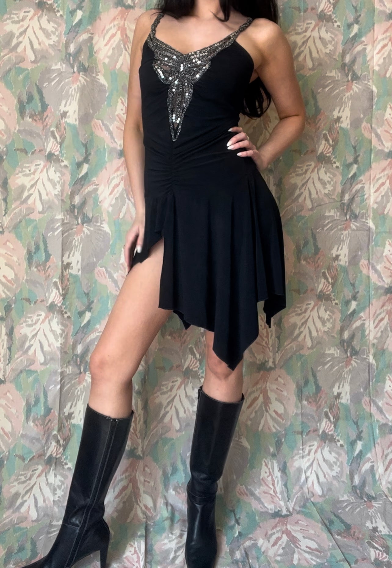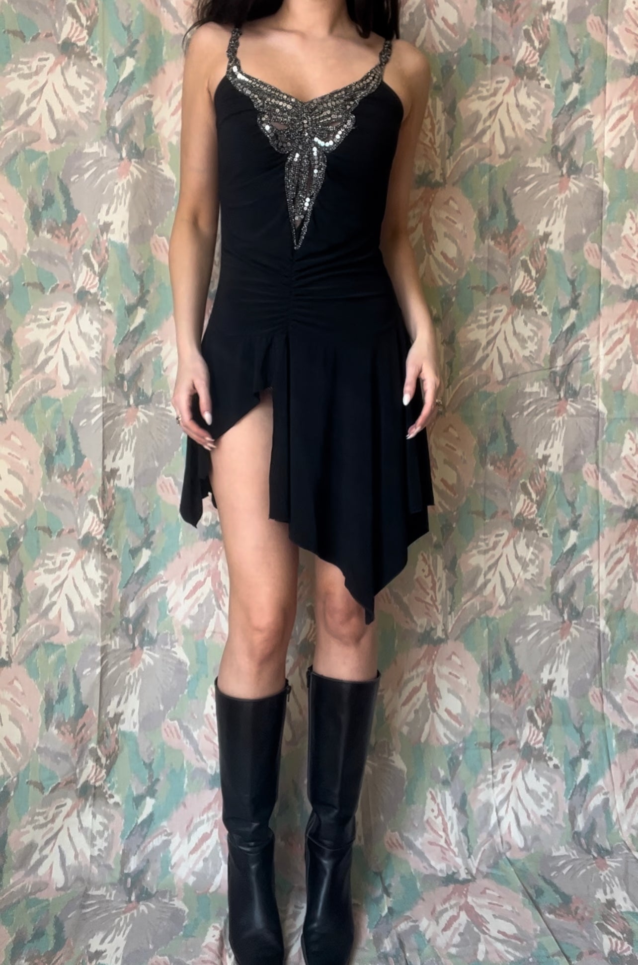 Vintage y2k sleeveless black asymmetrical mini dress with silver sequin butterfly bust and high front slit