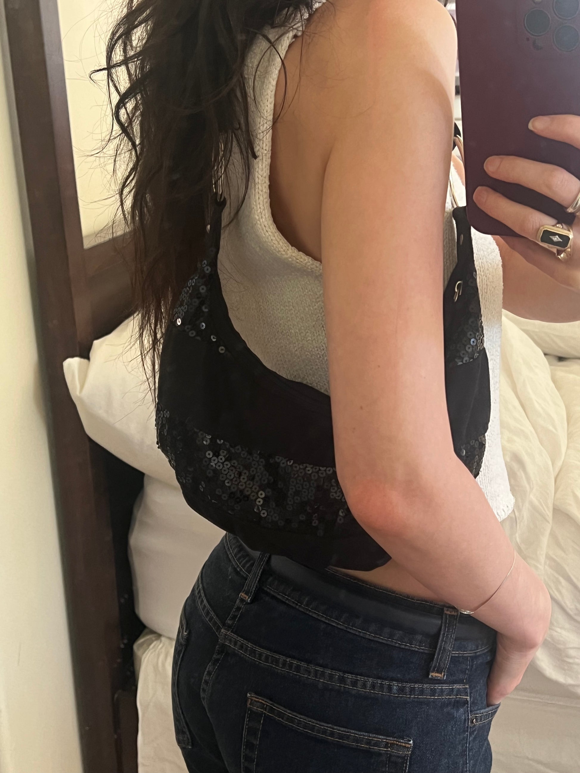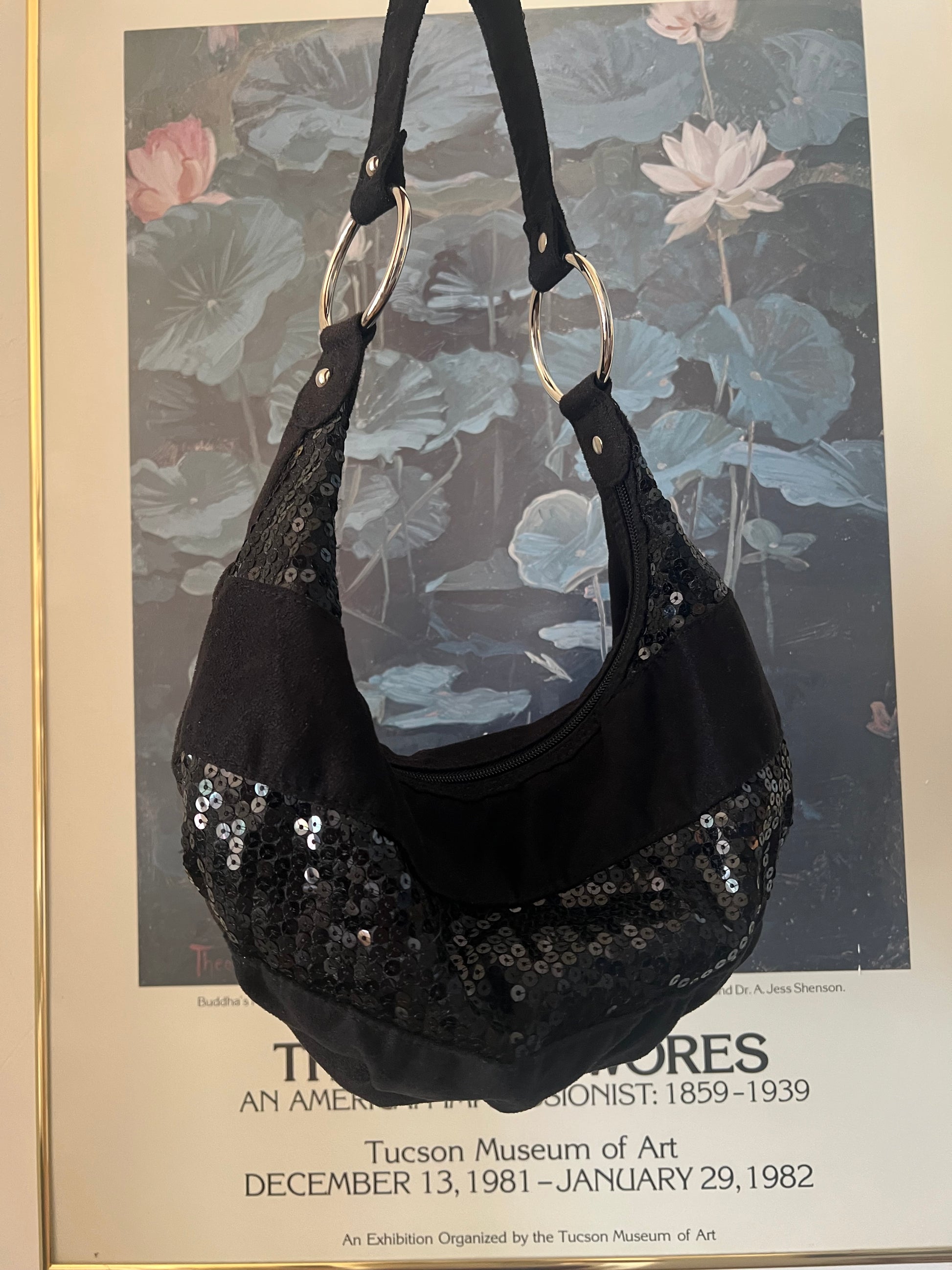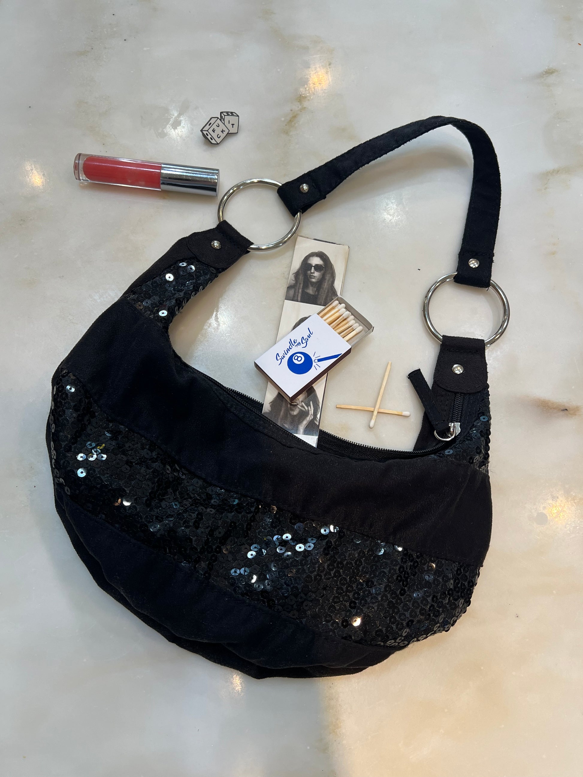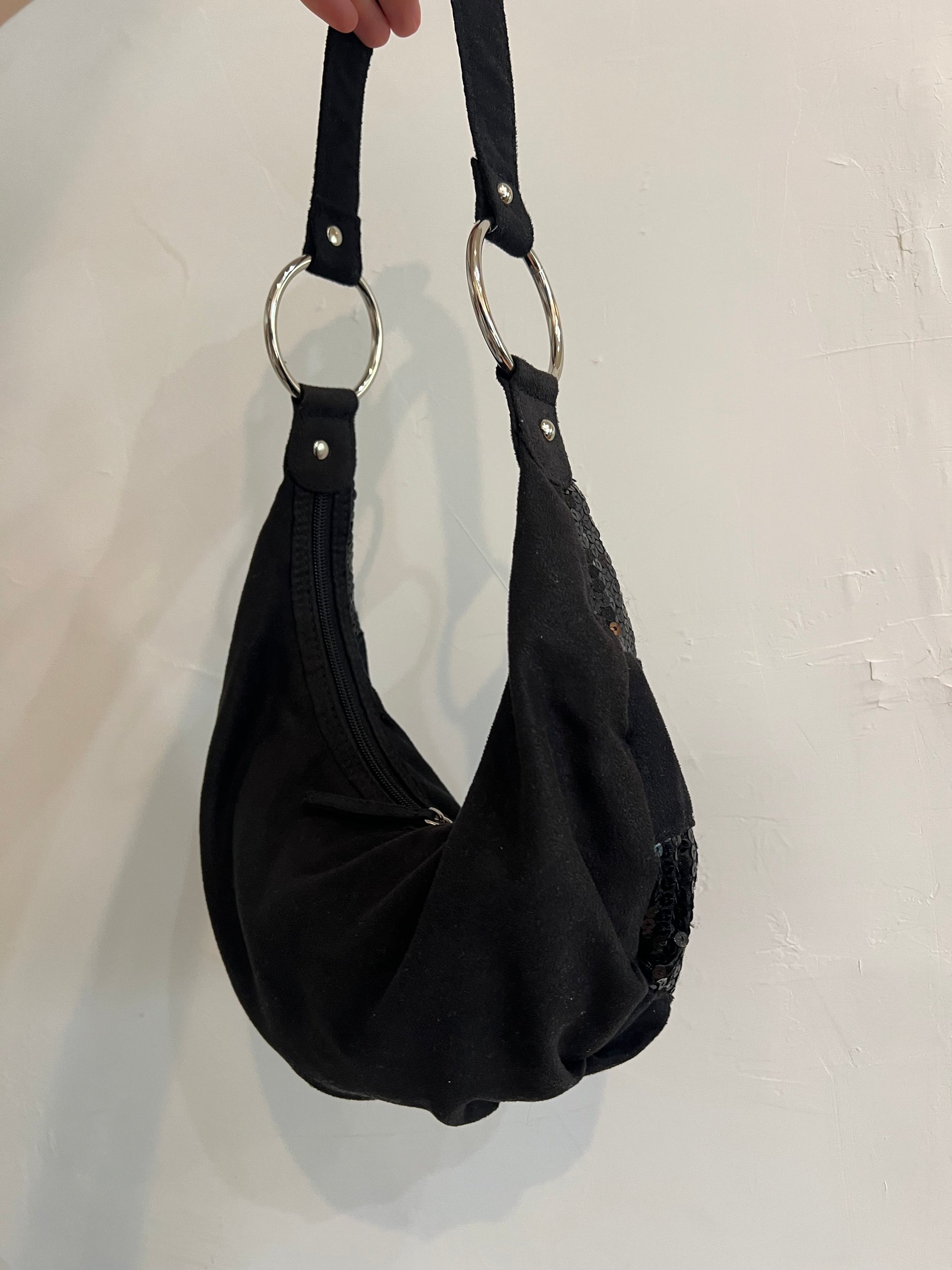 Black mini hobo bag with silver ring strap. This shoulder purse has a black sequin design on the front and a black micro suede on the back.