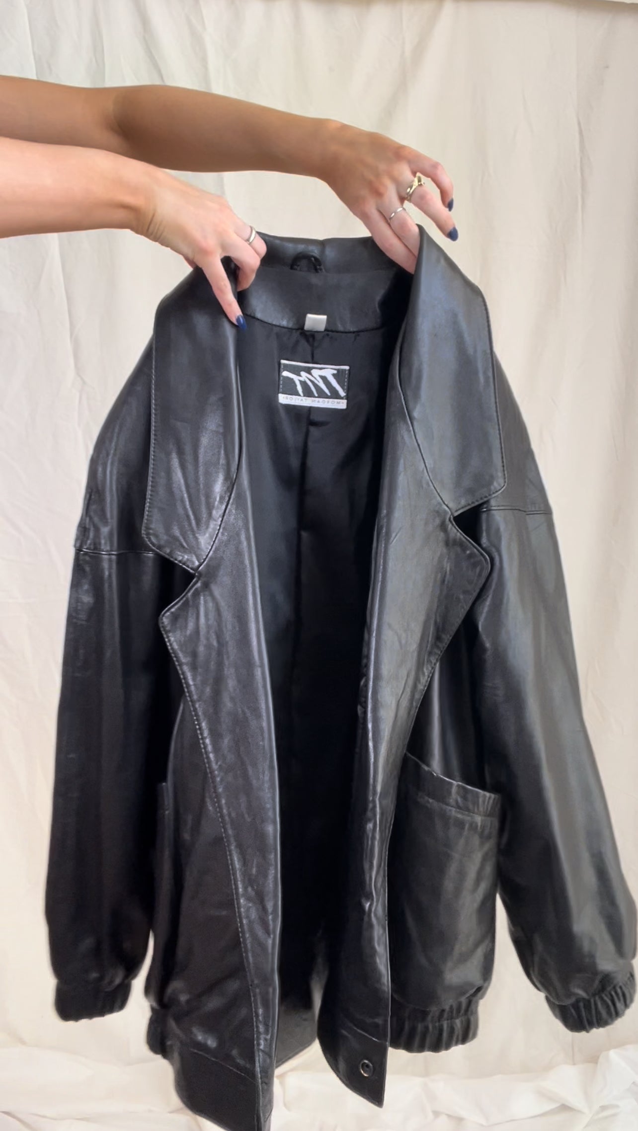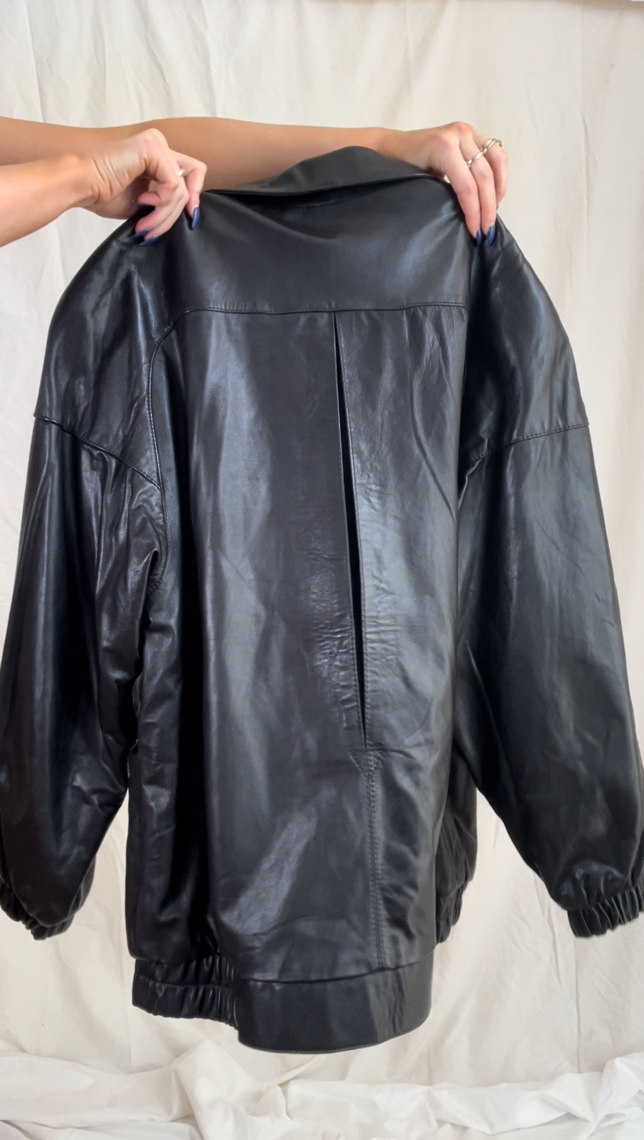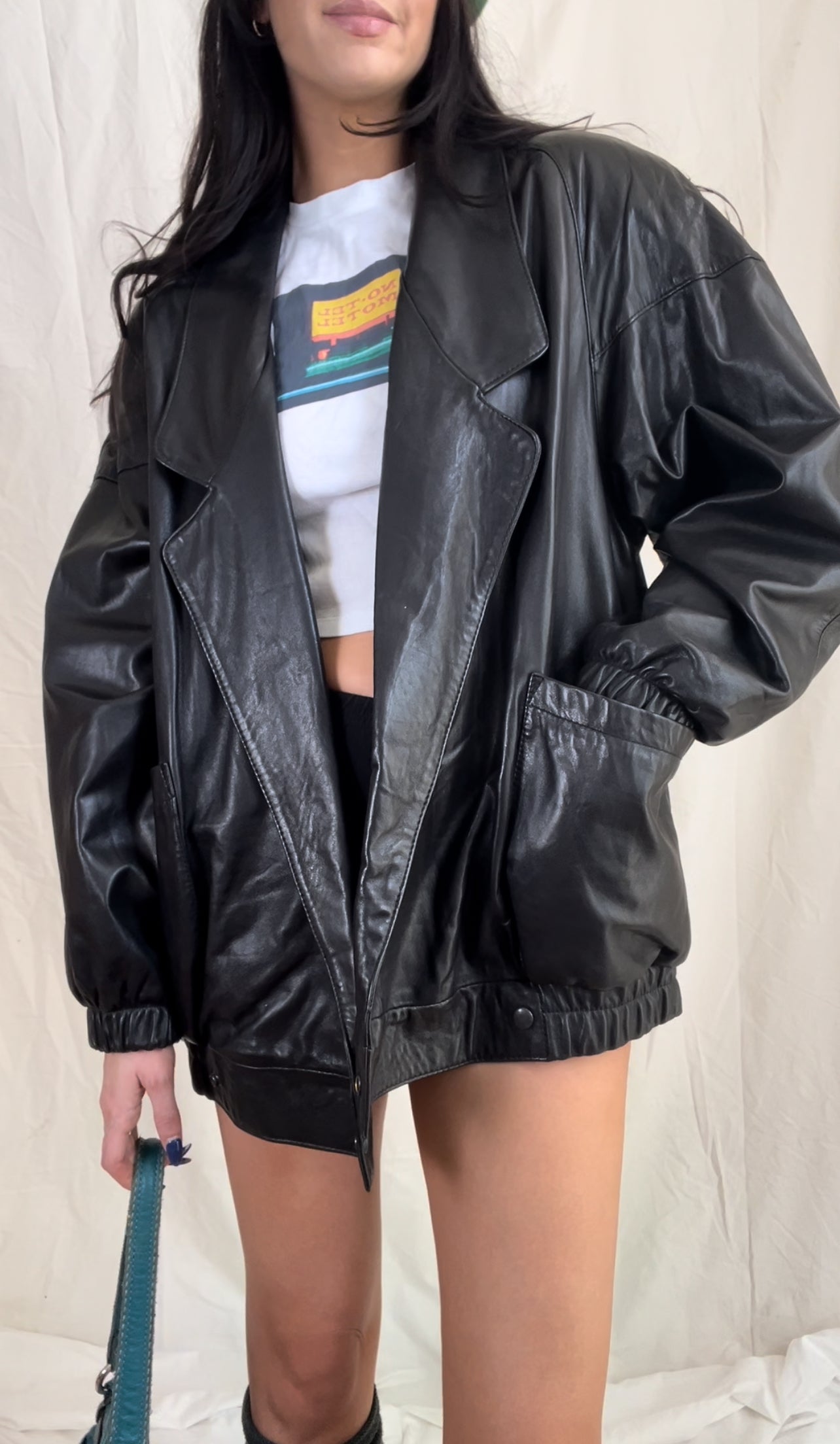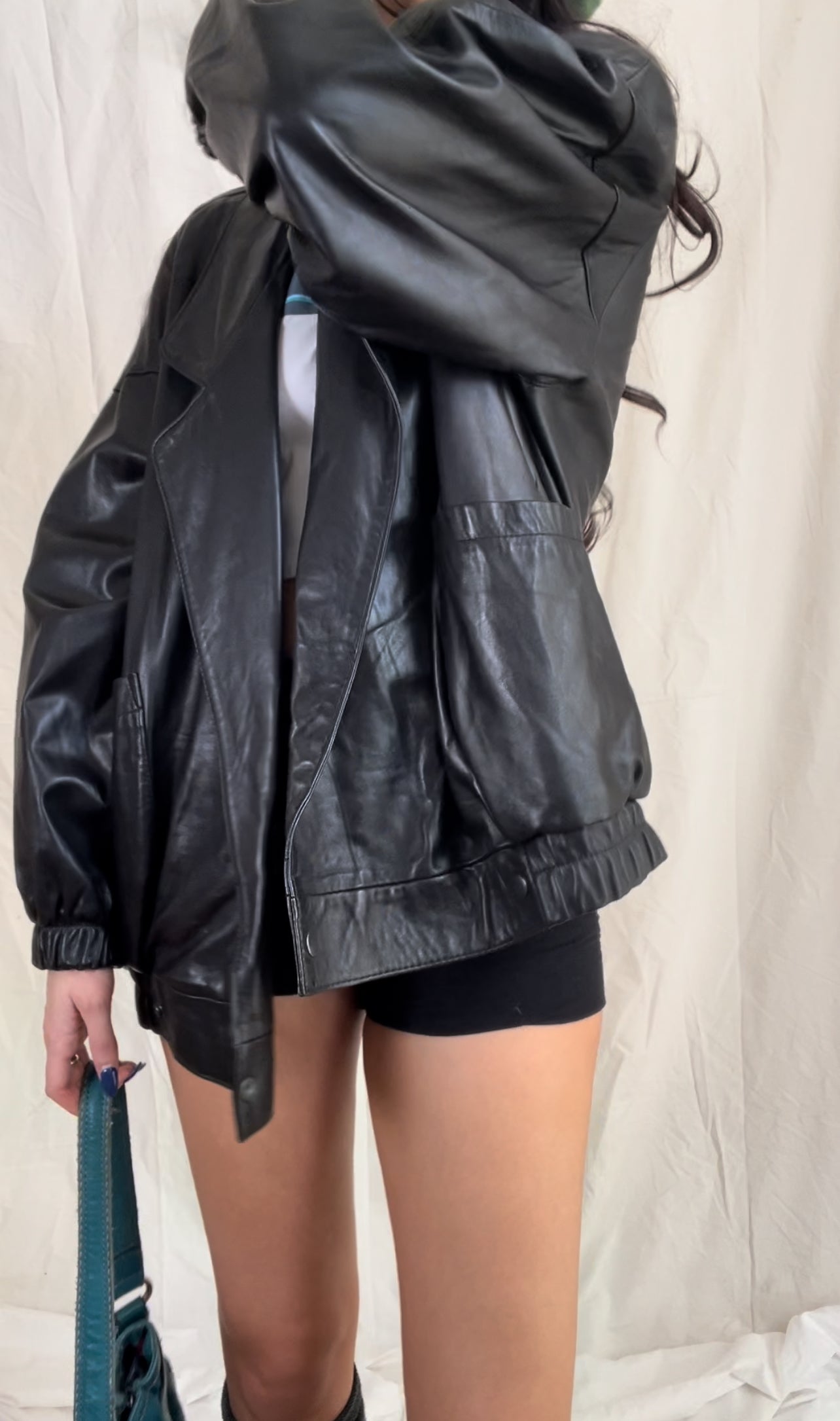 Vintage leather black oversized jacket with blazer style long collar, scrunch wrist and large front pockets. Featuring a snap closure and a buttery soft feel, this jacket is a vintage dream.