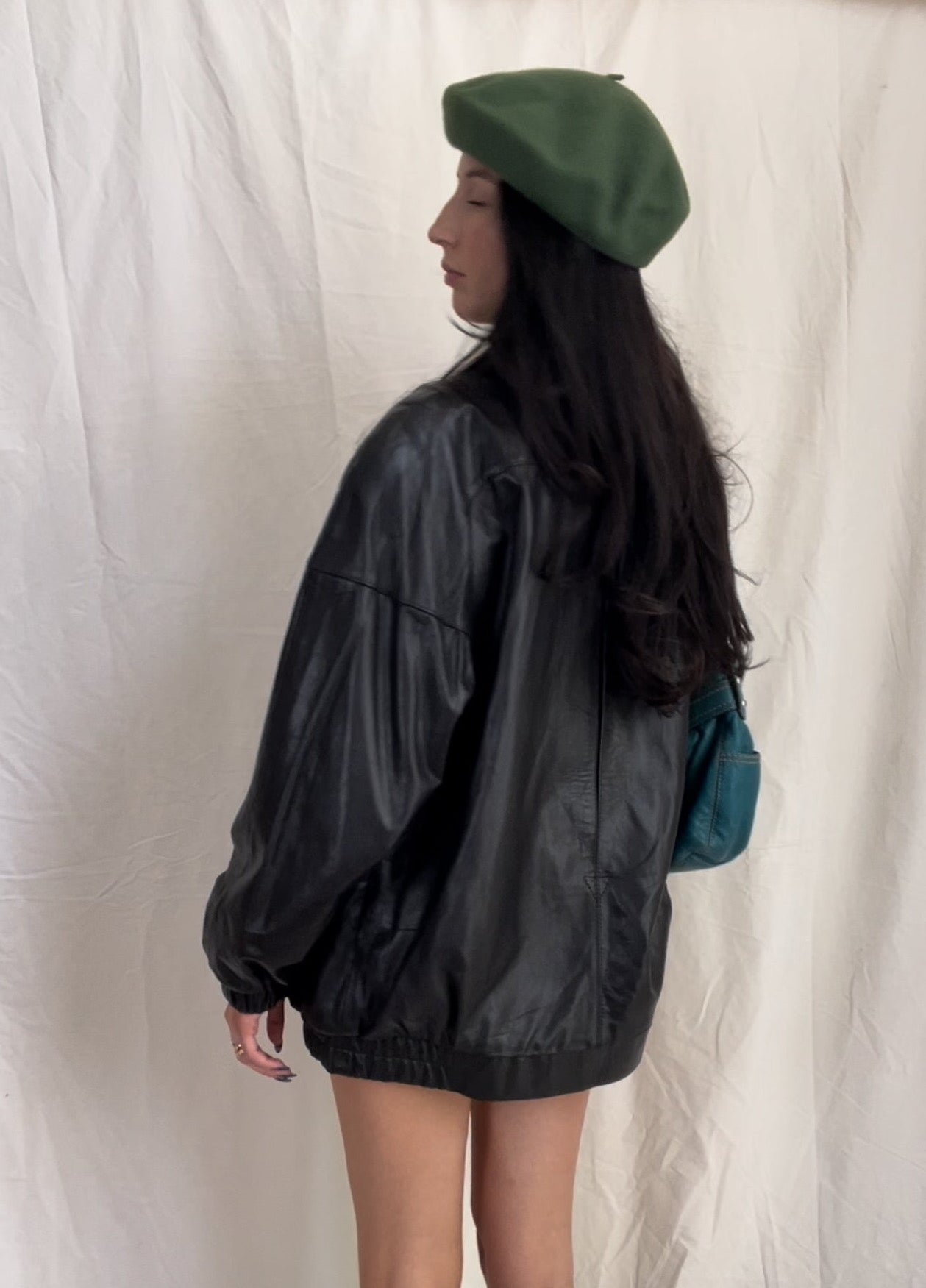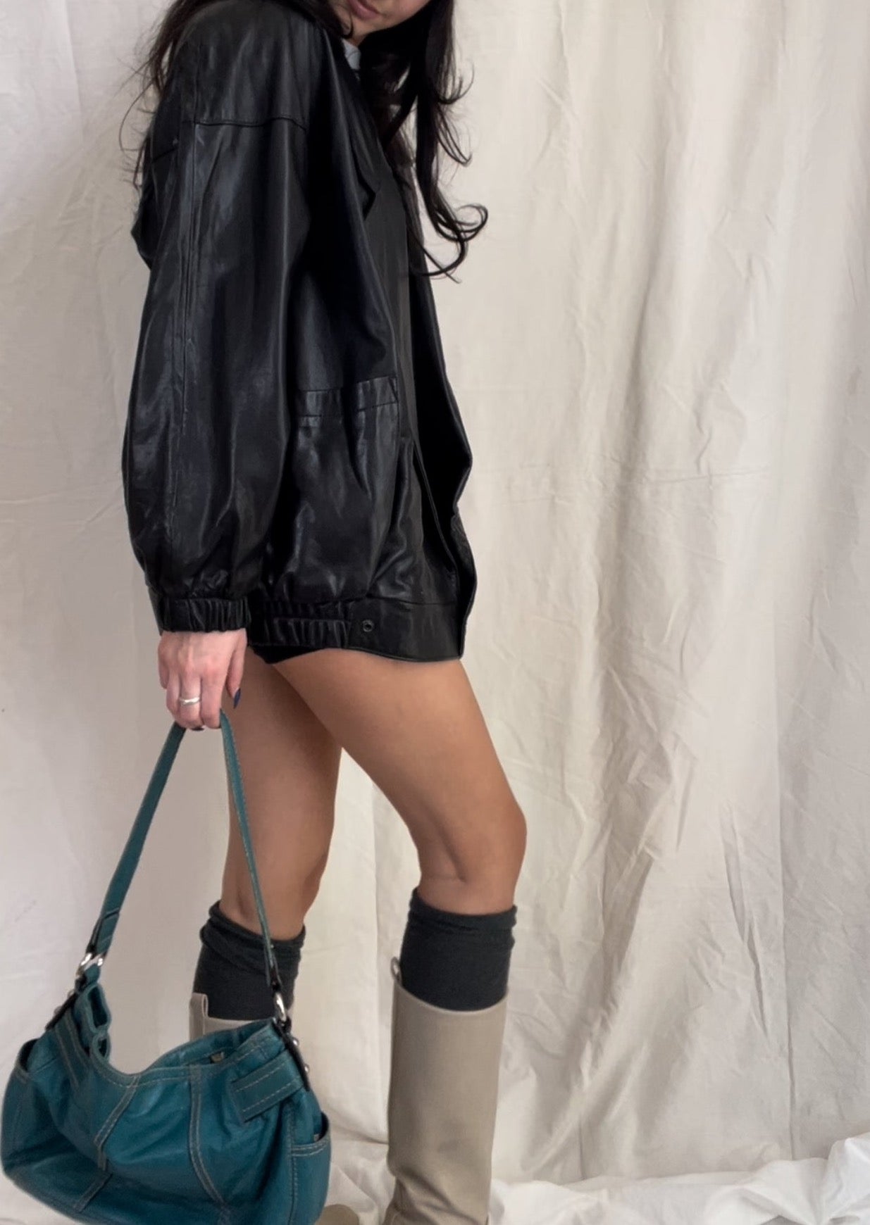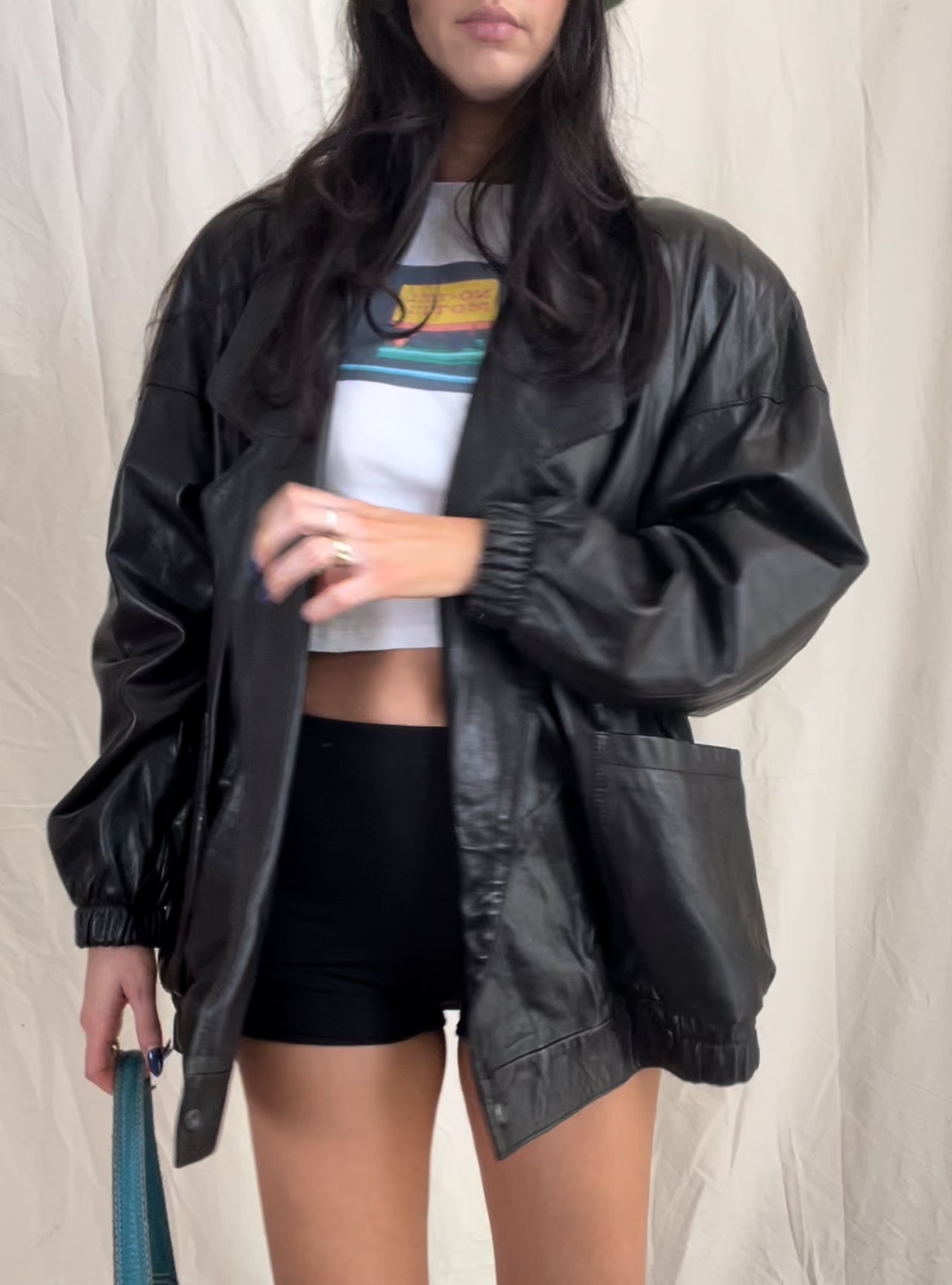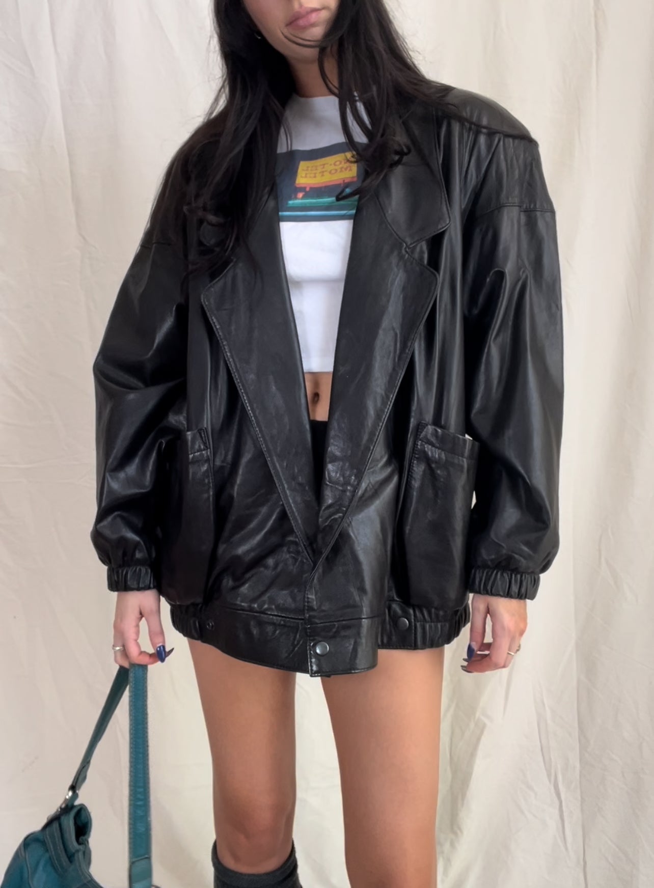 Vintage leather black oversized jacket with blazer style long collar, scrunch wrist and large front pockets. Featuring a snap closure and a buttery soft feel, this jacket is a vintage dream.