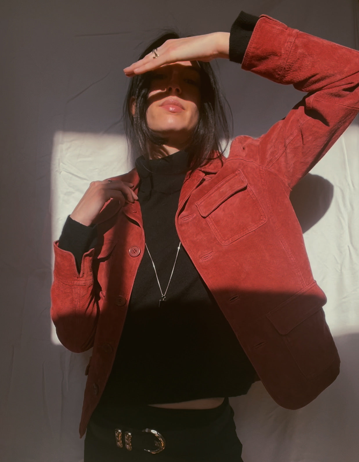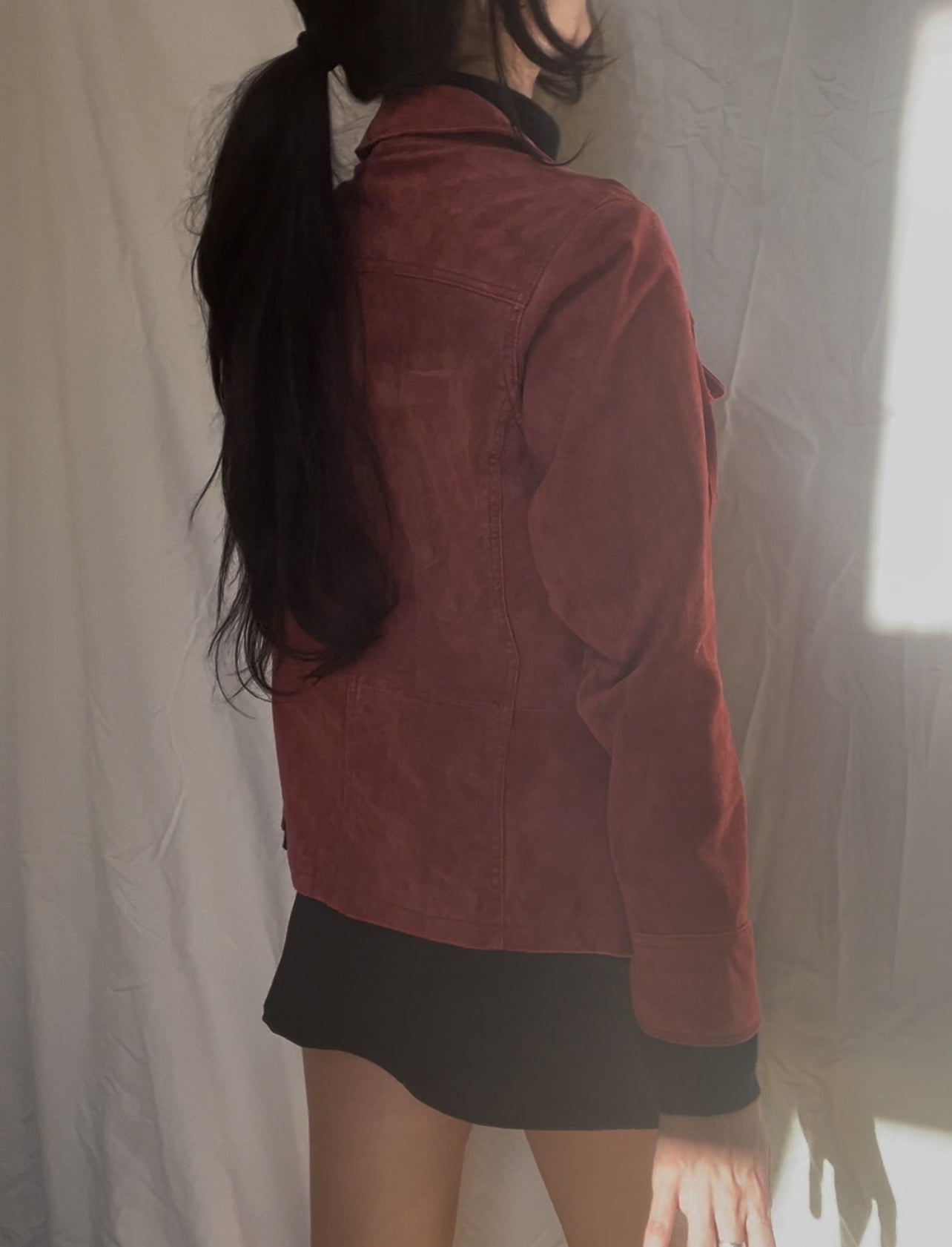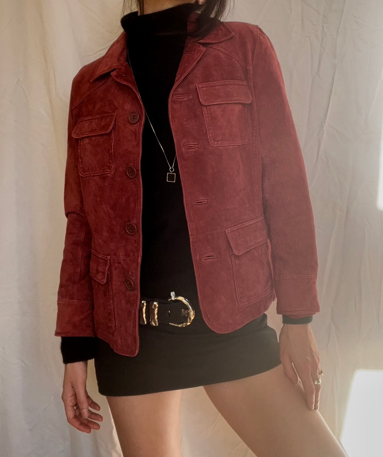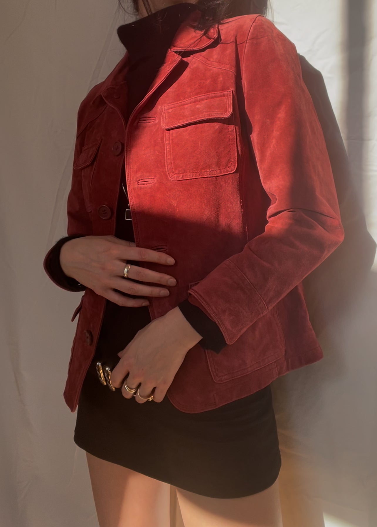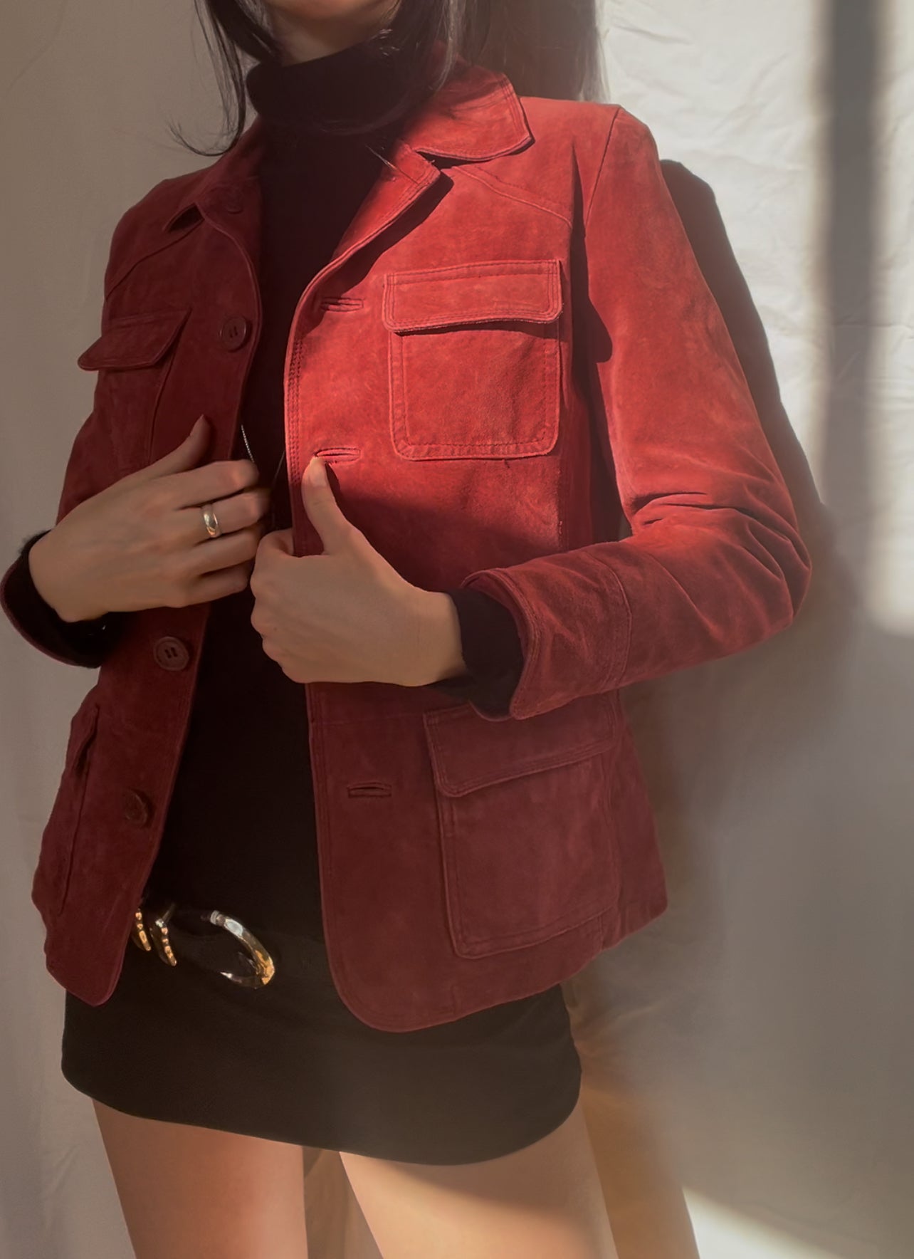 Vintage rust red suede blazer jacket with wing tip collar, front pockets and button closure. Literally adorable, and so good for the holiday season.