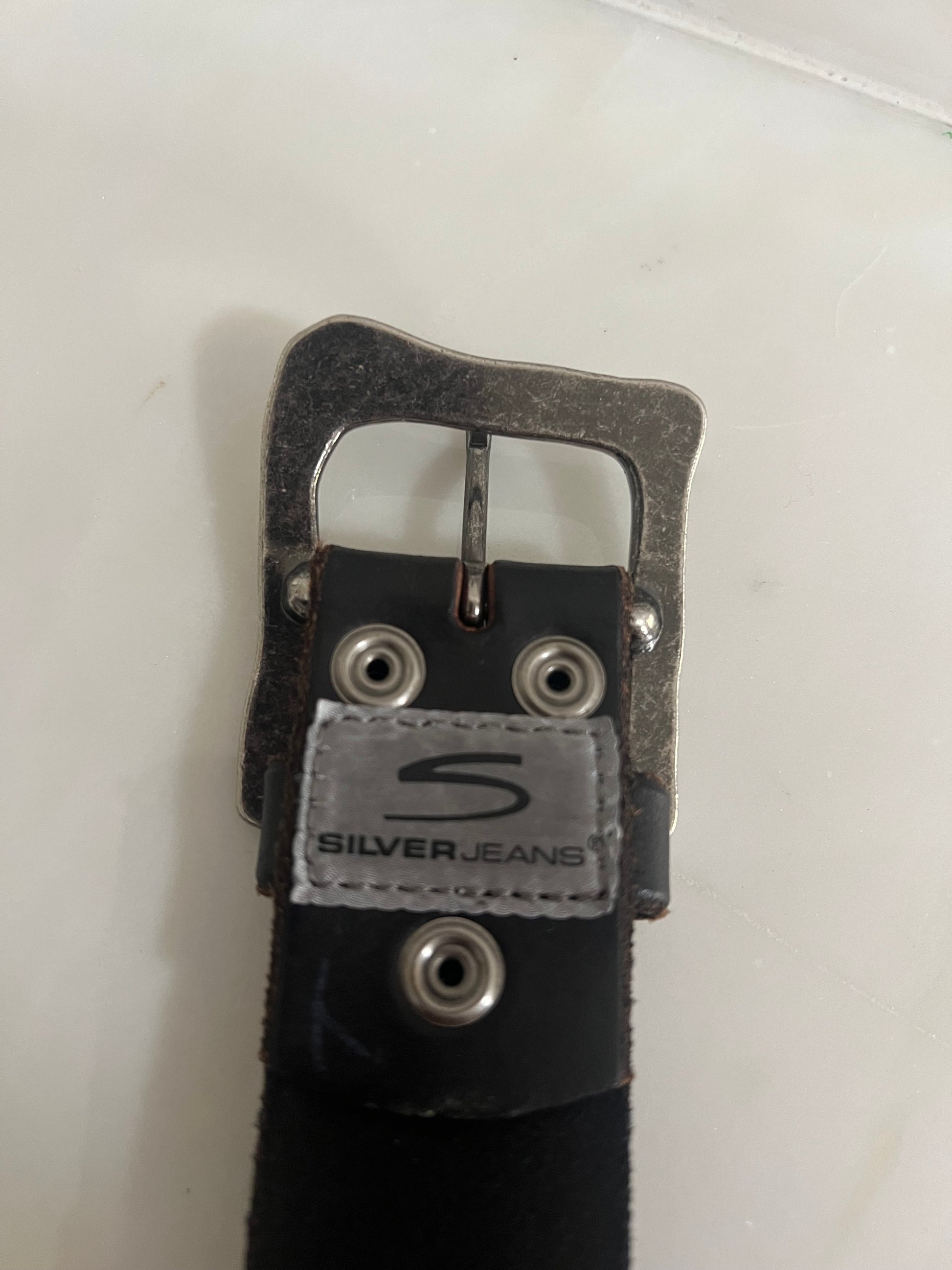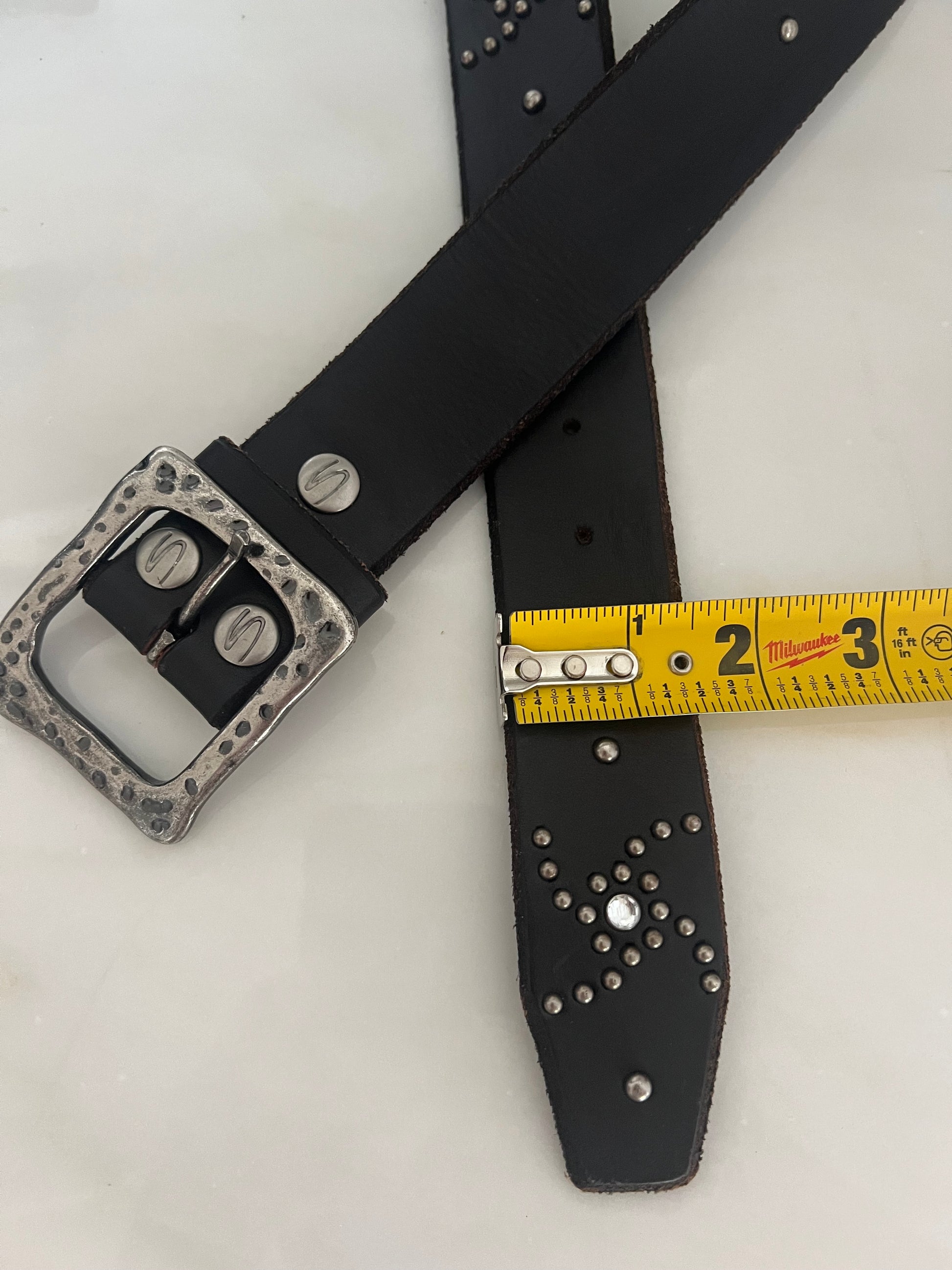 Genuine leather dark brown belt with hammered silver square buckle and studded spiral detail.