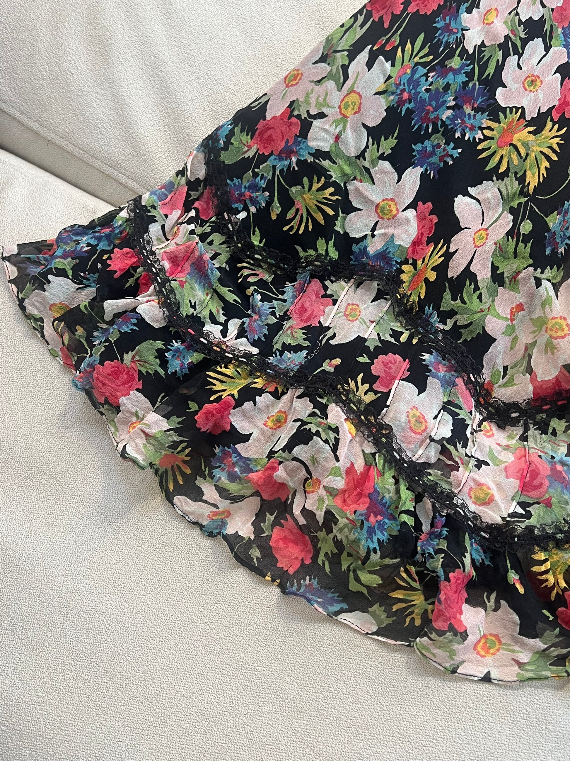 Vintage black floral Betsey Johnson dress with spaghetti straps, v-front neckline and lace trim. One strap ties in a bow on the shoulder, the other is adjustable. The bottom hem has a slight ruffle with black lace lining detail. Fully lined.