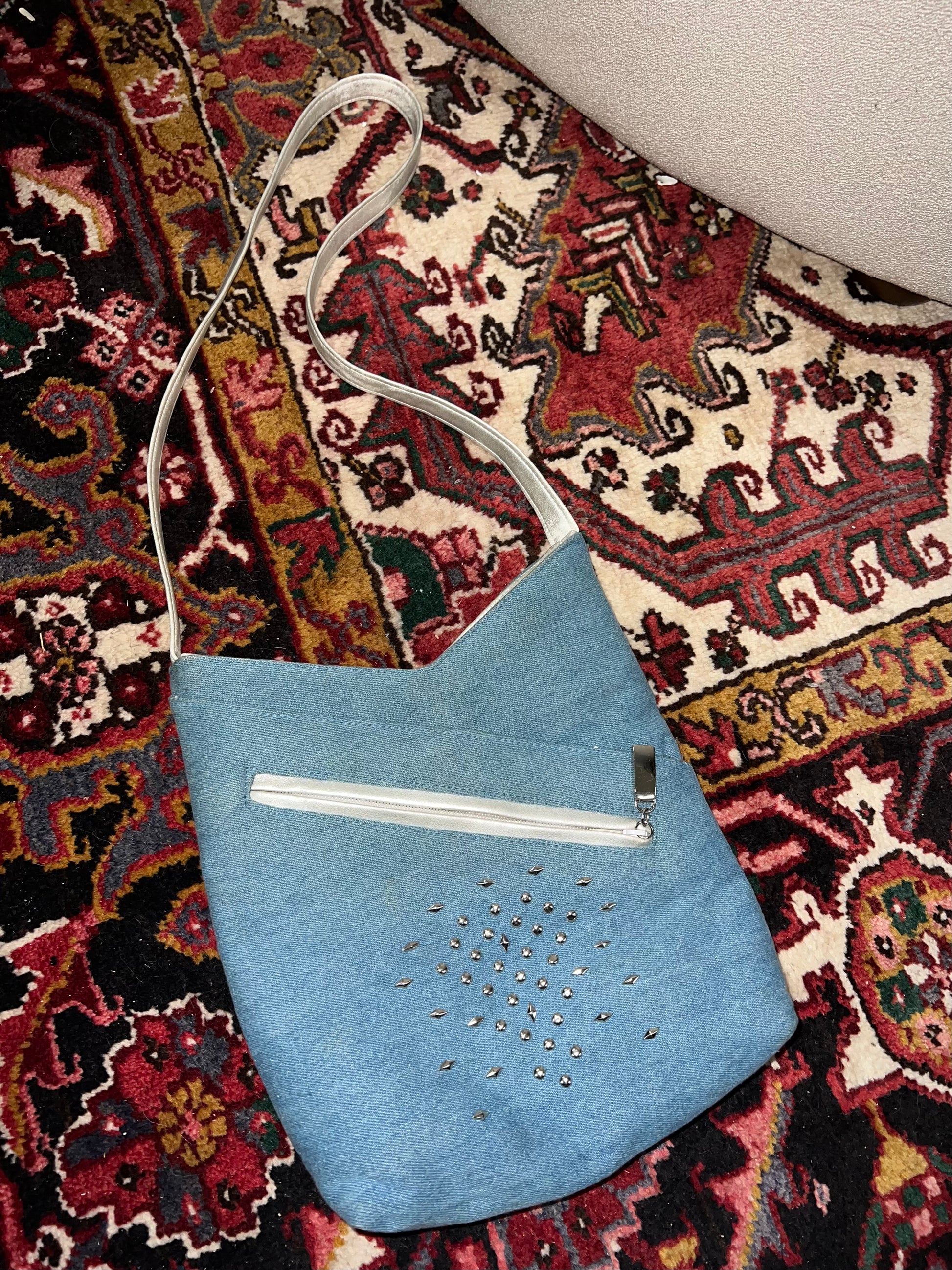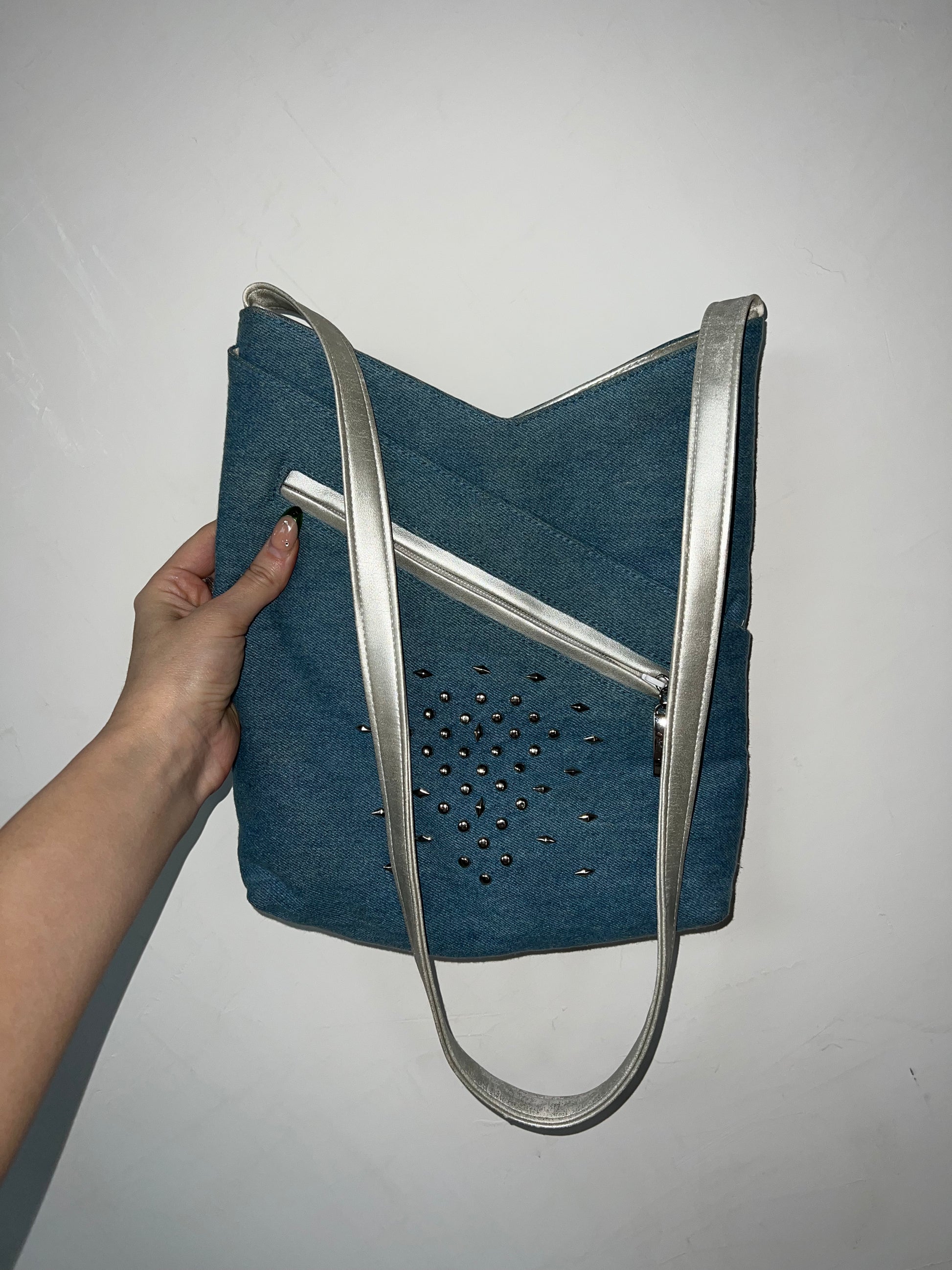 Denim and silver studded cross-body bag with silver strap This bag's killer design pairs punk rock with everyday functionality, perfect for making a statement with any look.