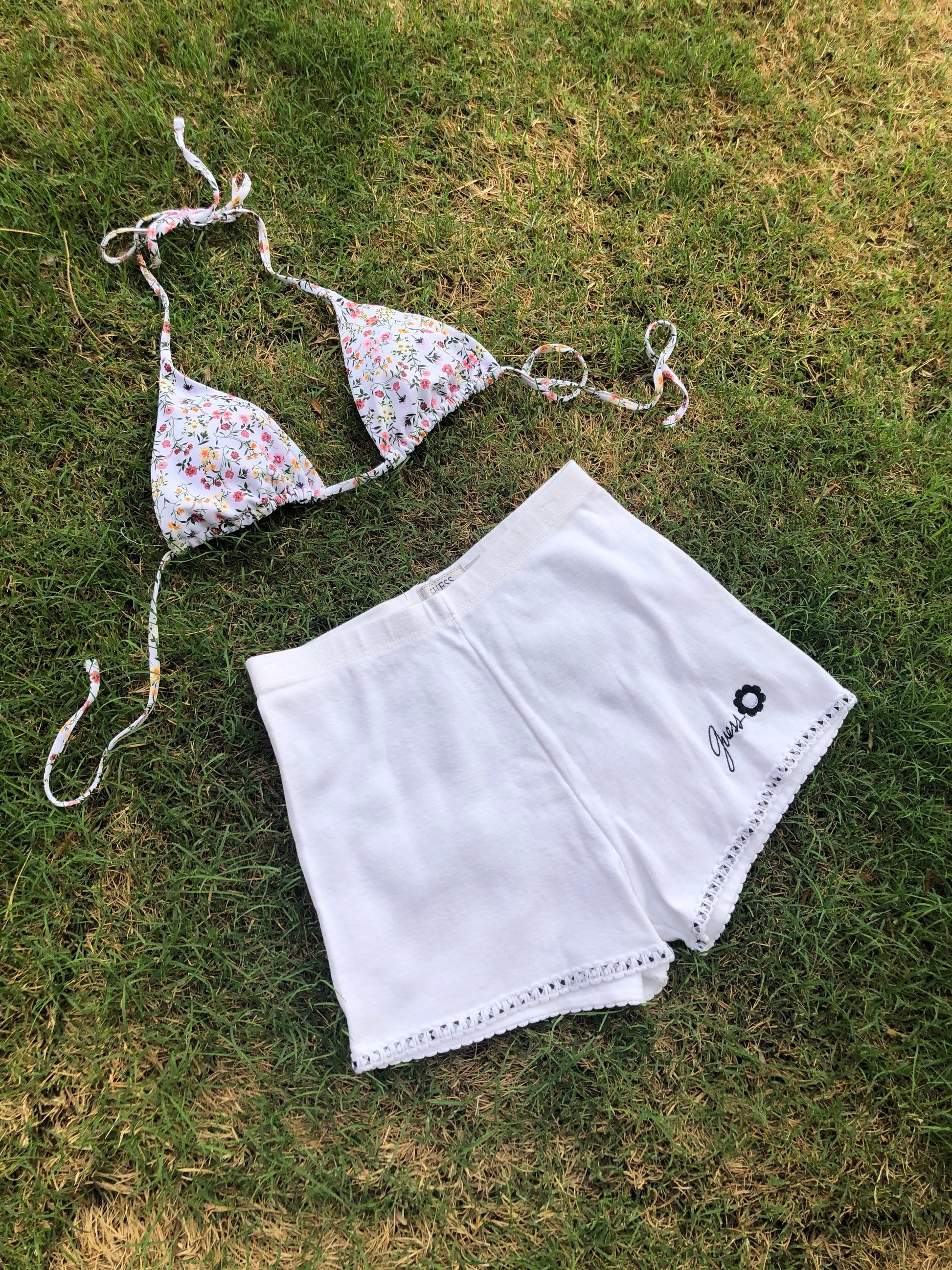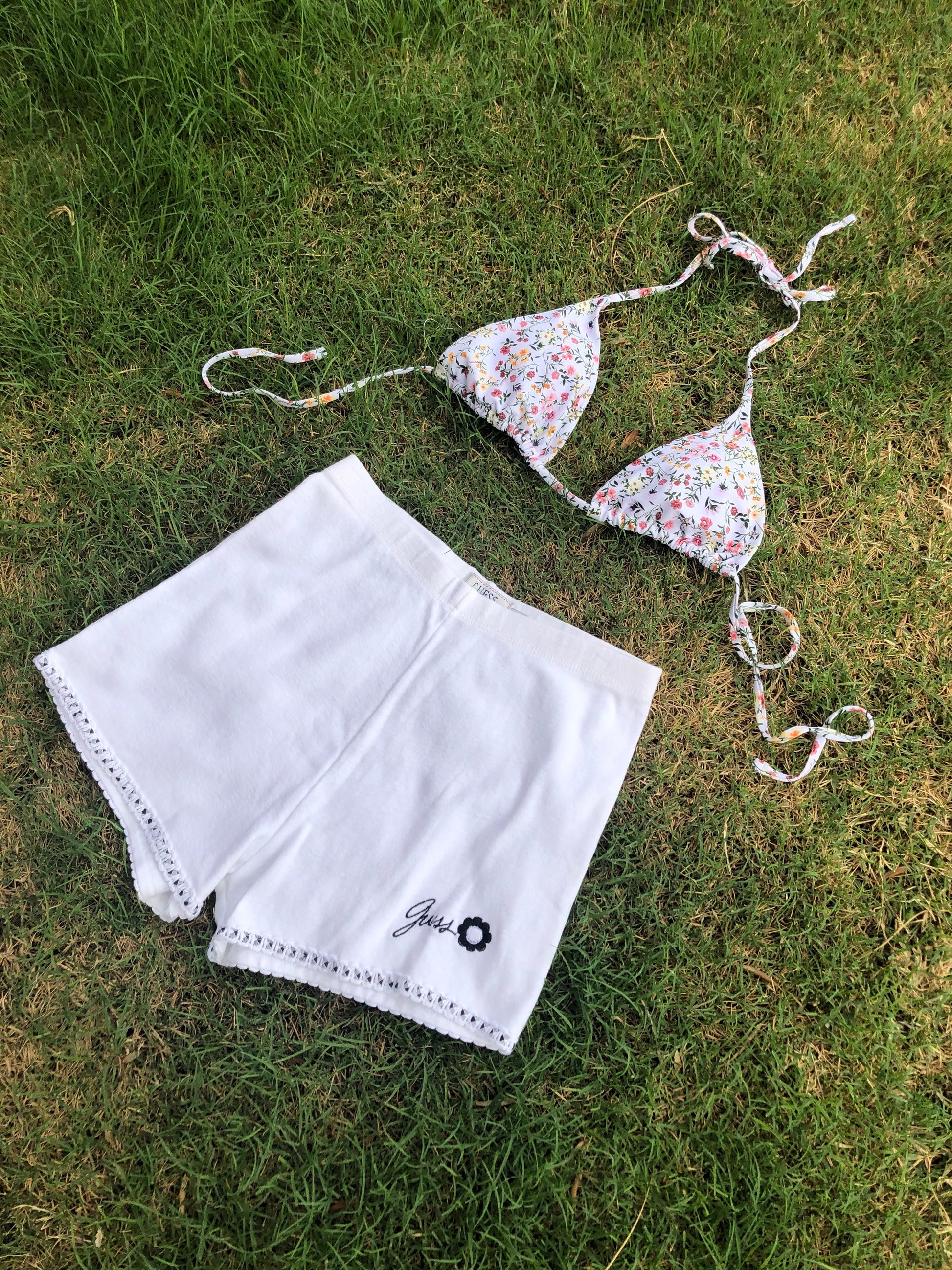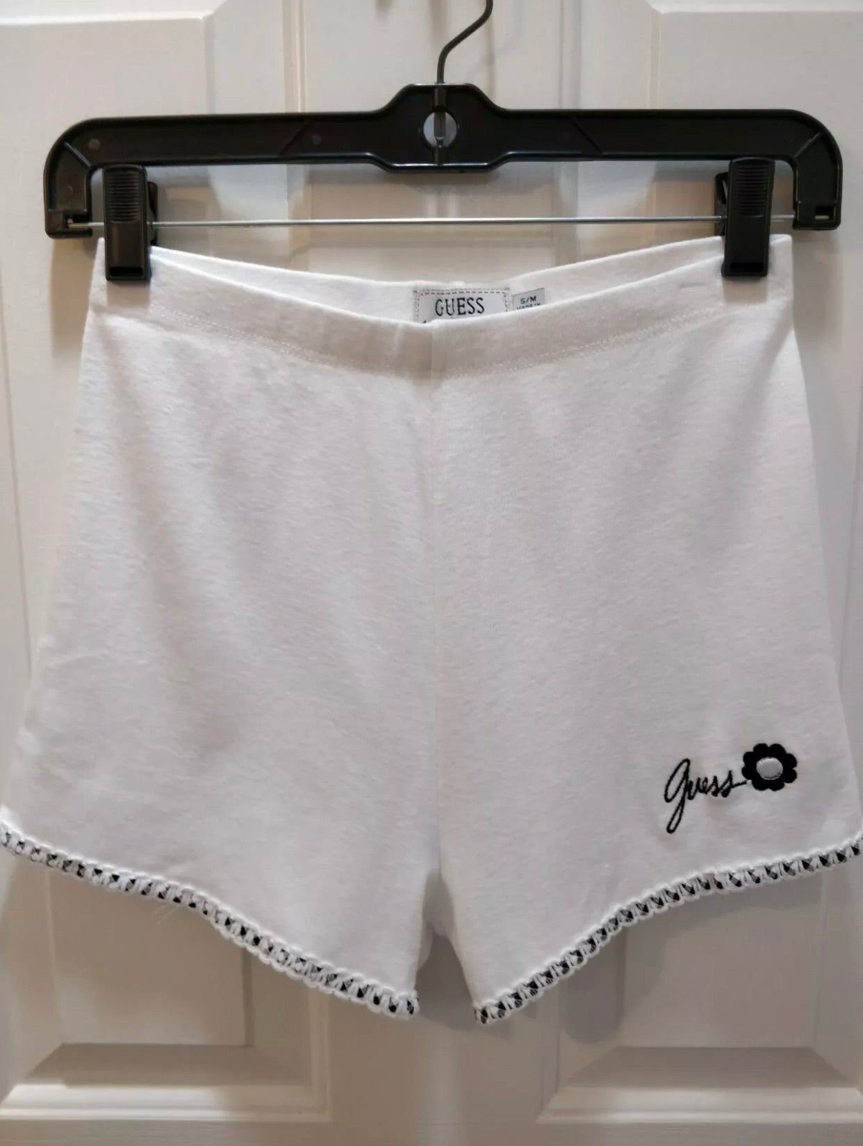 High waist white stretchy Guess shorts with embroidered logo and flower