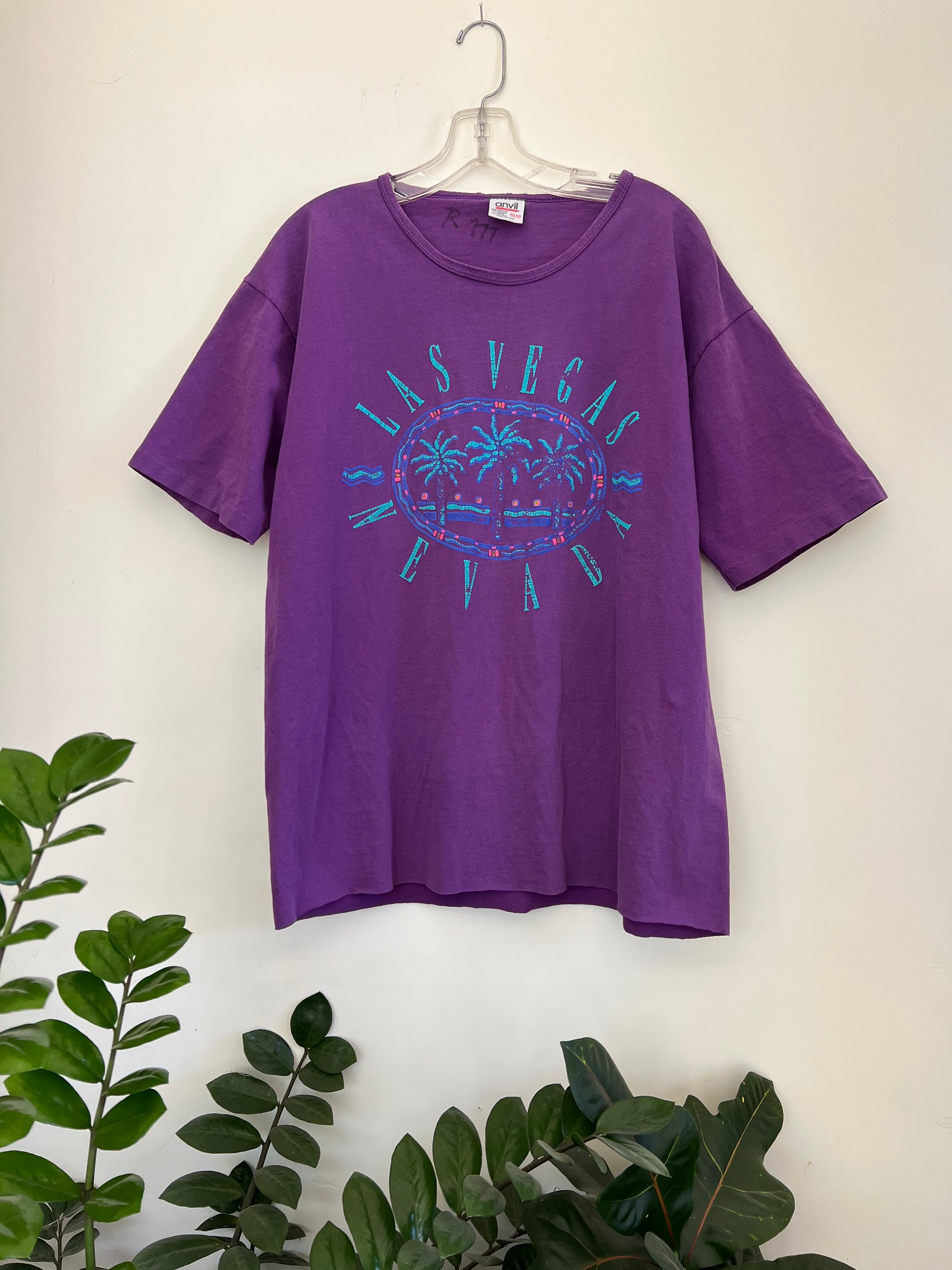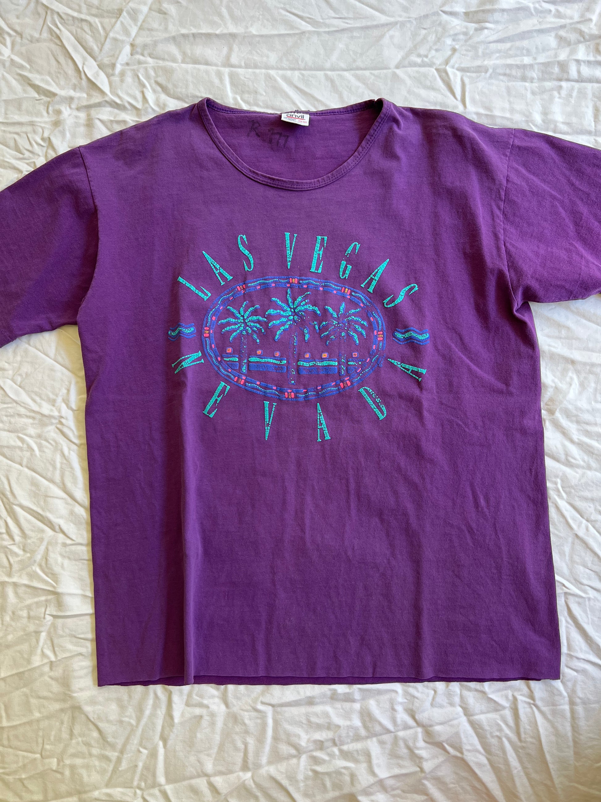 Purple oversized Las Vegas t-shirt with cracked vintage palm print. Super cute over a swim suit or worn big with some baggy jeans or bike shorts